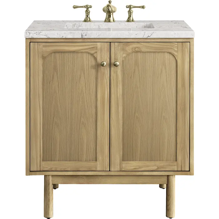 A modern interpretation of mid-century design, the Laurent 30" Single Vanity features organic charm with soft, rounded picture-frame details. Its Light Natural Oak finish over cathedral grain Ash veneers highlights the beautiful, natural wood texture, while Champagne Brass knobs lend a touch of elegance. Designed for versatility, this vanity cabinet features two doors with an adjustable shelf, a conveniently integrated USB/120V power unit, and the option to install as a freestanding or floating vanity. Perfectly crafted and beautifully appointed, Laurent brings an understated elegance to any bathroom. The Eternal Jasmine Pearl Silestone top completes the look.Two-door cabinet with one internal shelfDoors feature soft-close, adjustable door hingesCabinet features a multi-stage premium finish coat to offer UV and moisture resistanceLight Natural Oak finish with Champagne Brass hardwareCountertop is pre-drilled for an 8" widespread faucet; our 3cm eased edge countertops come with white porcelain rectangular sink that ships separately and includes mounting brackets for easy installationIntegrated 120V outlet with USB portsDual-mounted: can be installed freestanding or floatingFaucet sold separatelyDesigned with a contemporary appeal, the Laurent Collection is a modern interpretation of mid-century design, featuring rounded picture-frame detailing in a beautiful Light Natural Oak finish over cathedral grain Ash veneers. Available in six sizes, the Laurent can be installed as a floating vanity or can remain freestanding. Let the beautiful natural wood and elegant design create a beautiful focal point for any bathroom space.1 year warranty against manufacturer's defects. We will repair or replace any defective product, if the product is defective in material or workmanship at our discretion. No warranty is expressed or implied regarding damages resulting from consumer misuse.