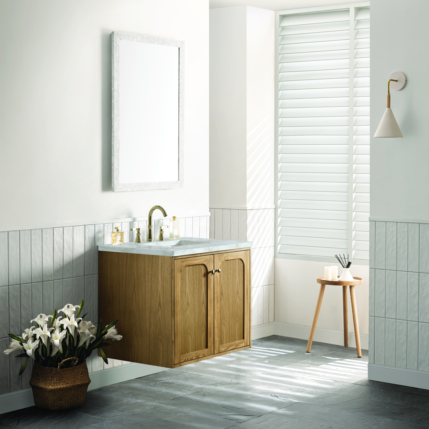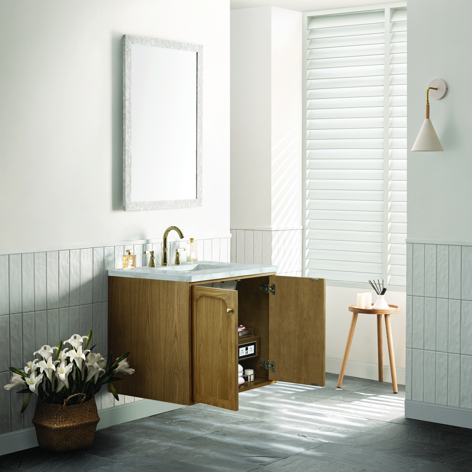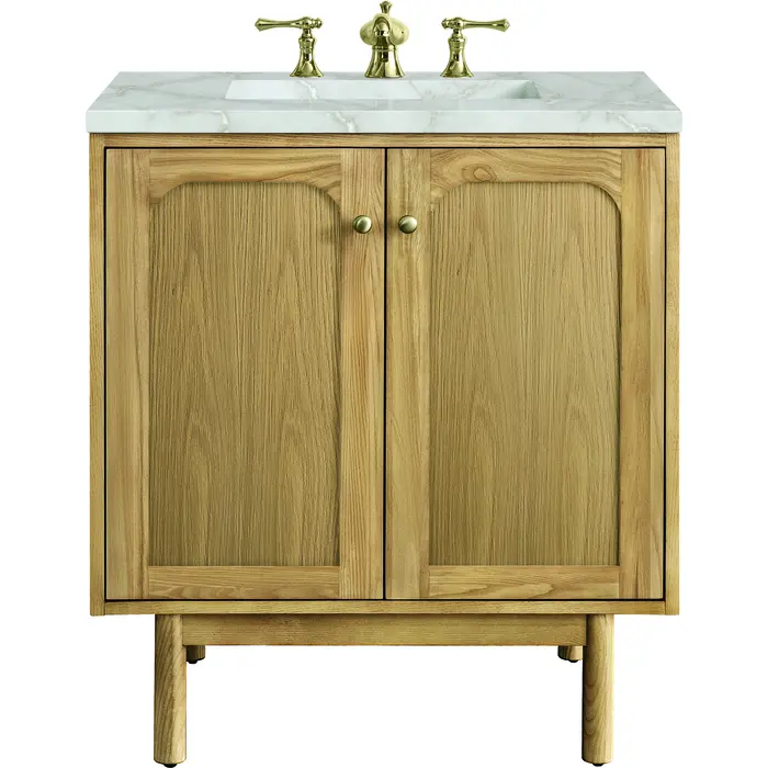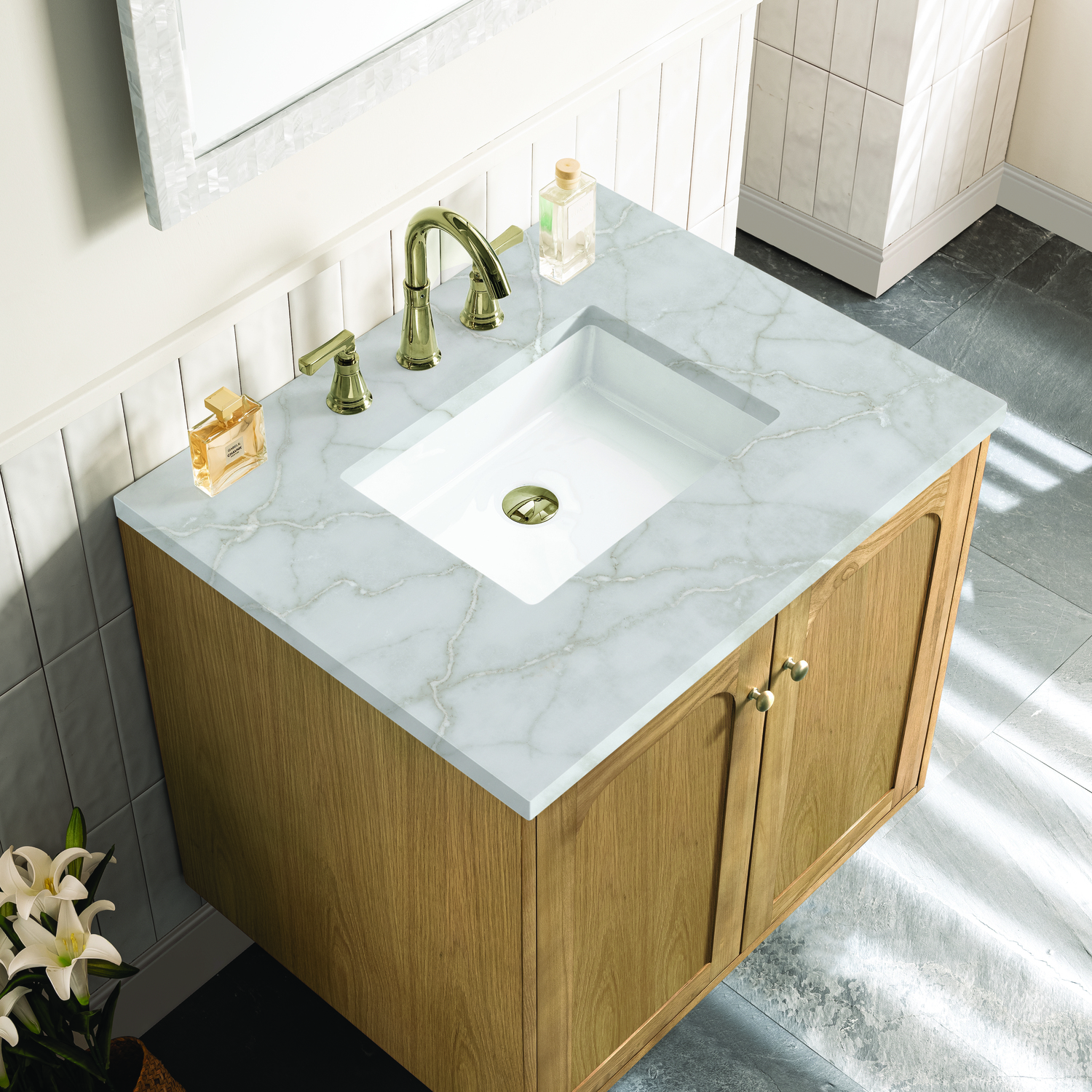 A modern interpretation of mid-century design, the Laurent 30" Single Vanity features organic charm with soft, rounded picture-frame details. Its Light Natural Oak finish over cathedral grain Ash veneers highlights the beautiful, natural wood texture, while Champagne Brass knobs lend a touch of elegance. Designed for versatility, this vanity cabinet features two doors with an adjustable shelf, a conveniently integrated USB/120V power unit, and the option to install as a freestanding or floating vanity. Perfectly crafted and beautifully appointed, Laurent brings an understated elegance to any bathroom. The light wood finish is enhanced by the neutral background of the Victorian Silver Silestone top, which boasts beautiful veining and champagne metallic accents which seamlessly complements both warm and cool tones.Two-door cabinet with one internal shelfDoors feature soft-close, adjustable door hingesCabinet features a multi-stage premium finish coat to offer UV and moisture resistanceLight Natural Oak finish with Champagne Brass hardwareCountertop is pre-drilled for an 8" widespread faucet; our 3cm eased edge countertops come with white porcelain rectangular sink that ships separately and includes mounting brackets for easy installationIntegrated 120V outlet with USB portsDual-mounted: can be installed freestanding or floatingFaucet sold separatelyDesigned with a contemporary appeal, the Laurent Collection is a modern interpretation of mid-century design, featuring rounded picture-frame detailing in a beautiful Light Natural Oak finish over cathedral grain Ash veneers. Available in six sizes, the Laurent can be installed as a floating vanity or can remain freestanding. Let the beautiful natural wood and elegant design create a beautiful focal point for any bathroom space.1 year warranty against manufacturer's defects. We will repair or replace any defective product, if the product is defective in material or workmanship at our discretion. No warranty is expressed or implied regarding damages resulting from consumer misuse.