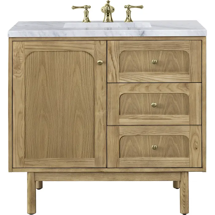 A modern interpretation of mid-century design, the Laurent 36" Single Vanity features organic charm with soft, rounded picture-frame details. Its Light Natural Oak finish over cathedral grain Ash veneers highlights the beautiful, natural wood texture, while Champagne Brass knobs lend a touch of elegance. Designed for versatility, this vanity offers a top-row tip-out drawer and two full-extension drawers with a removable bamboo drawer organizer. The single cabinet door opens to an adjustable shelf and a conveniently integrated USB/120V power unit. Choose to install the Laurent as a freestanding vanity with the modern wood base, or float it on your wall using our durable French cleat hardware. Perfectly crafted and beautifully appointed, Laurent brings an understated elegance to any bathroom. A timeless Carrara Marble top completes the look.Single-door cabinet with internal shelf; top-row tip-out drawer, and two standard drawersDrawer boxes feature English Dovetail joinery with premium, soft-close undermount drawer slides; doors feature soft-close, adjustable door hingesCabinet features a multi-stage premium finish coat to offer UV and moisture resistanceLight Natural Oak finish with Champagne Brass hardwareCountertop is pre-drilled for an 8" widespread faucet; our 3cm eased edge countertops come with white porcelain curved basin sink that ships separately and includes mounting brackets for easy installationIntegrated 120V outlet with USB portsDrawers lined with our signature brushed aluminum laminate for easy cleaningRemovable bamboo drawer organizer includedDual-mounted: can be installed freestanding or floatingFaucet sold separatelyDesigned with a contemporary appeal, the Laurent Collection is a modern interpretation of mid-century design, featuring rounded picture-frame detailing in a beautiful Light Natural Oak finish over cathedral grain Ash veneers. Available in six sizes, the Laurent can be installed as a floating vanity or can remain freestanding. Let the beautiful natural wood and elegant design create a beautiful focal point for any bathroom space.1 year warranty against manufacturer's defects. We will repair or replace any defective product, if the product is defective in material or workmanship at our discretion. No warranty is expressed or implied regarding damages resulting from consumer misuse.