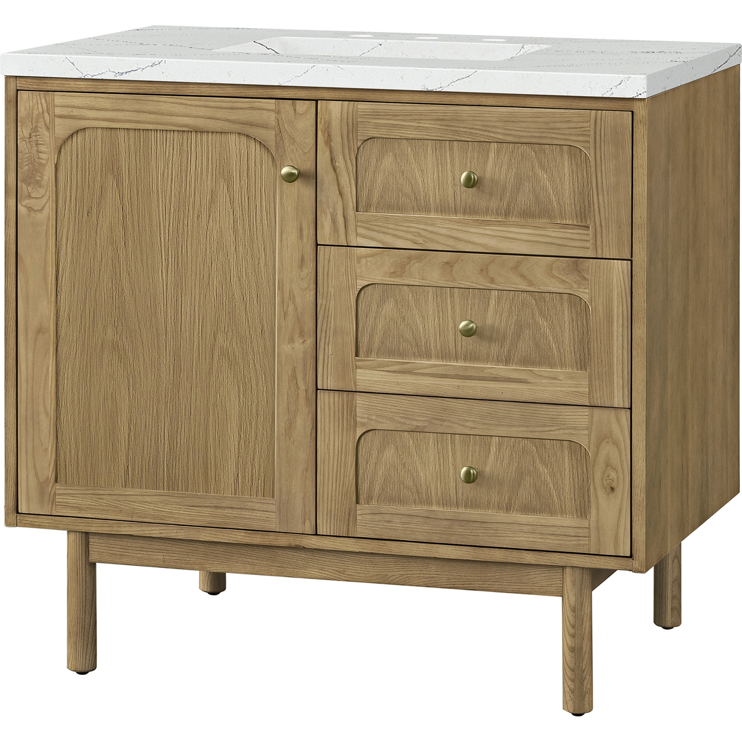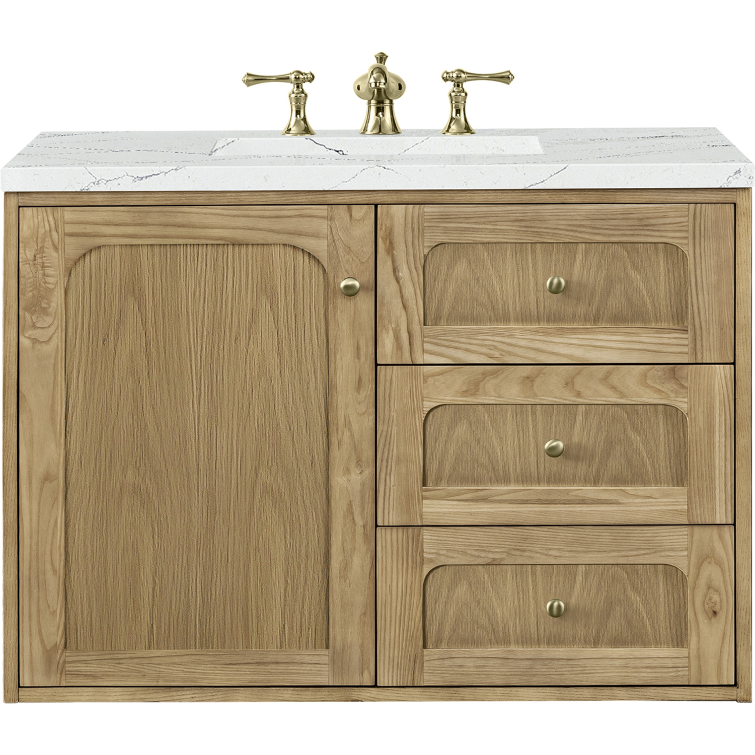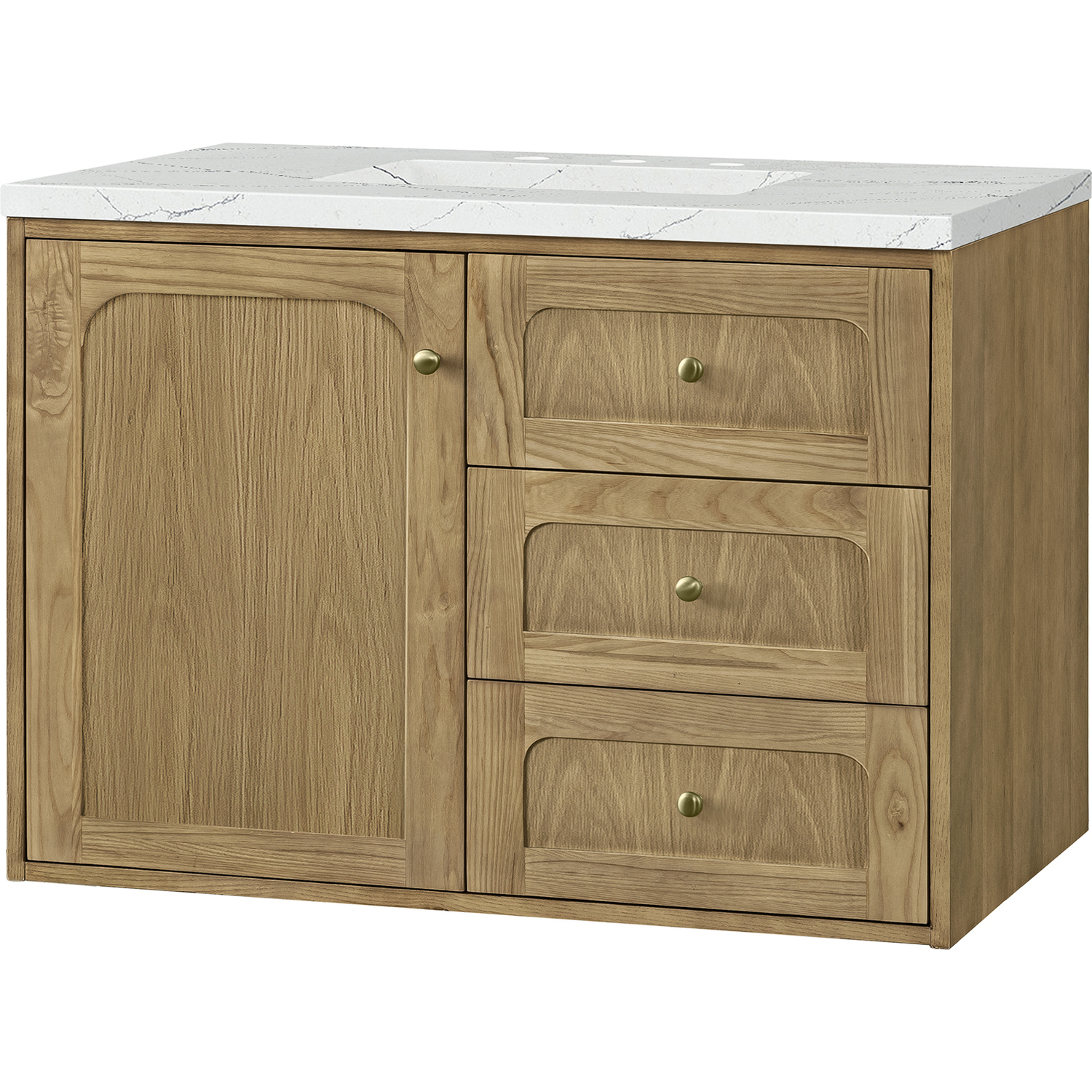 A modern interpretation of mid-century design, the Laurent 36" Single Vanity features organic charm with soft, rounded picture-frame details. Its Light Natural Oak finish over cathedral grain Ash veneers highlights the beautiful, natural wood texture, while Champagne Brass knobs lend a touch of elegance. Designed for versatility, this vanity offers a top-row tip-out drawer and two full-extension drawers with a removable bamboo drawer organizer. The single cabinet door opens to an adjustable shelf and a conveniently integrated USB/120V power unit. Choose to install the Laurent as a freestanding vanity with the modern wood base, or float it on your wall using our durable French cleat hardware. Perfectly crafted and beautifully appointed, Laurent brings an understated elegance to any bathroom. The striking Ethereal Noctis Silestone top completes the look.Single-door cabinet with internal shelf; top-row tip-out drawer, and two standard drawersDrawer boxes feature English Dovetail joinery with premium, soft-close undermount drawer slides; doors feature soft-close, adjustable door hingesCabinet features a multi-stage premium finish coat to offer UV and moisture resistanceLight Natural Oak finish with Champagne Brass hardwareCountertop is pre-drilled for an 8" widespread faucet; our 3cm eased edge countertops come with white porcelain rectangular sink that ships separately and includes mounting brackets for easy installationIntegrated 120V outlet with USB portsDrawers lined with our signature brushed aluminum laminate for easy cleaningRemovable bamboo drawer organizer includedDual-mounted: can be installed freestanding or floatingFaucet sold separatelyDesigned with a contemporary appeal, the Laurent Collection is a modern interpretation of mid-century design, featuring rounded picture-frame detailing in a beautiful Light Natural Oak finish over cathedral grain Ash veneers. Available in six sizes, the Laurent can be installed as a floating vanity or can remain freestanding. Let the beautiful natural wood and elegant design create a beautiful focal point for any bathroom space.1 year warranty against manufacturer's defects. We will repair or replace any defective product, if the product is defective in material or workmanship at our discretion. No warranty is expressed or implied regarding damages resulting from consumer misuse.