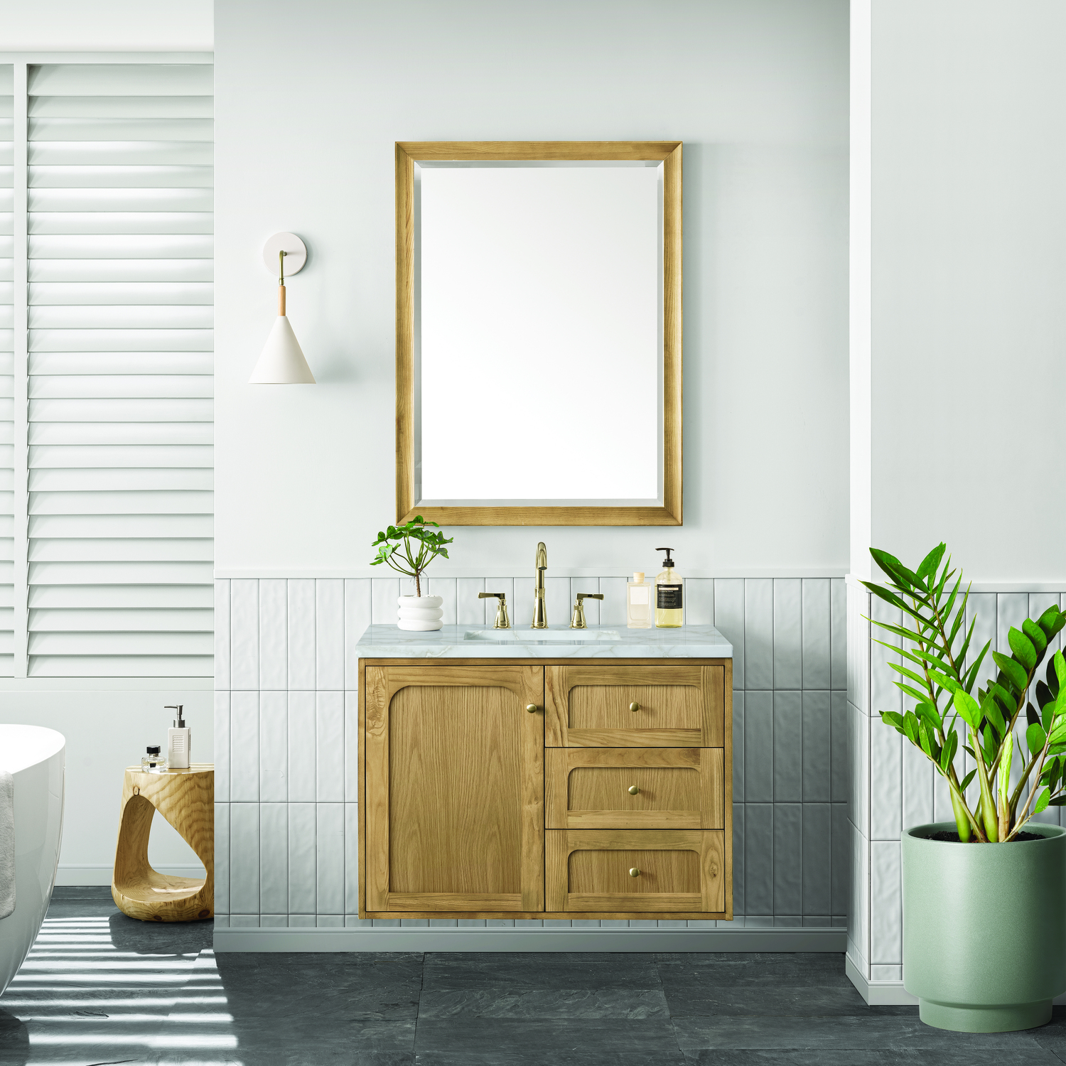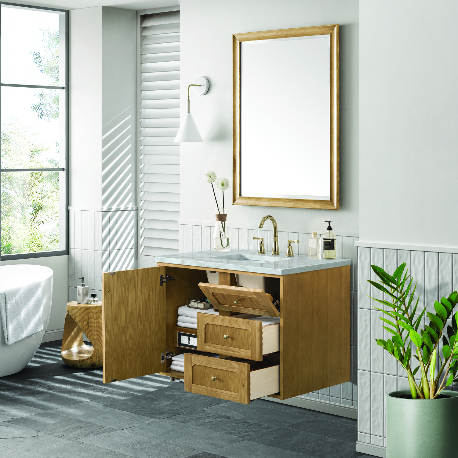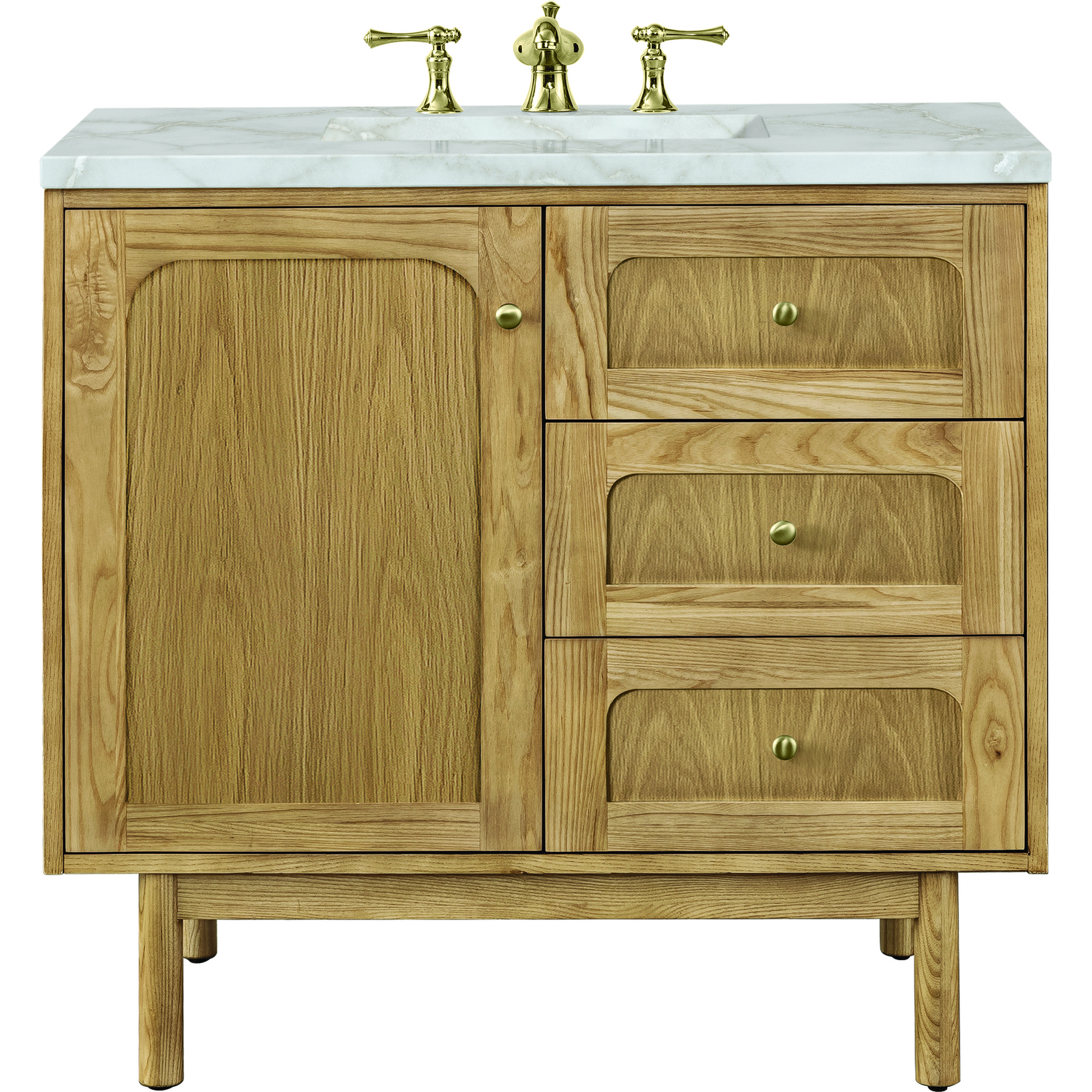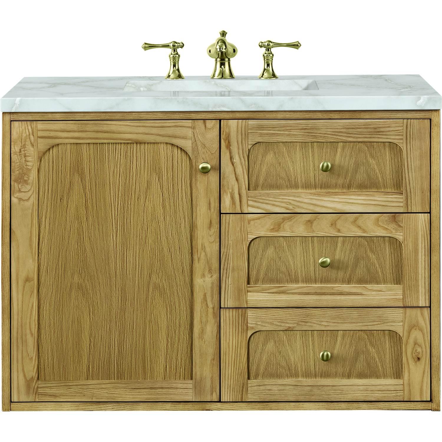 A modern interpretation of mid-century design, the Laurent 36" Single Vanity features organic charm with soft, rounded picture-frame details. Its Light Natural Oak finish over cathedral grain Ash veneers highlights the beautiful, natural wood texture, while Champagne Brass knobs lend a touch of elegance. Designed for versatility, this vanity offers a top-row tip-out drawer and two full-extension drawers with a removable bamboo drawer organizer. The single cabinet door opens to an adjustable shelf and a conveniently integrated USB/120V power unit. Choose to install the Laurent as a freestanding vanity with the modern wood base, or float it on your wall using our durable French cleat hardware. Perfectly crafted and beautifully appointed, Laurent brings an understated elegance to any bathroom. The light wood finish is enhanced by the neutral background of the Victorian Silver Silestone top, which boasts beautiful veining and champagne metallic accents which seamlessly complements both warm and cool tones.Single-door cabinet with internal shelf; top-row tip-out drawer, and two standard drawersDrawer boxes feature English Dovetail joinery with premium, soft-close undermount drawer slides; doors feature soft-close, adjustable door hingesCabinet features a multi-stage premium finish coat to offer UV and moisture resistanceLight Natural Oak finish with Champagne Brass hardwareCountertop is pre-drilled for an 8" widespread faucet; our 3cm eased edge countertops come with white porcelain rectangular sink that ships separately and includes mounting brackets for easy installationIntegrated 120V outlet with USB portsDrawers lined with our signature brushed aluminum laminate for easy cleaningRemovable bamboo drawer organizer includedDual-mounted: can be installed freestanding or floatingFaucet sold separatelyDesigned with a contemporary appeal, the Laurent Collection is a modern interpretation of mid-century design, featuring rounded picture-frame detailing in a beautiful Light Natural Oak finish over cathedral grain Ash veneers. Available in six sizes, the Laurent can be installed as a floating vanity or can remain freestanding. Let the beautiful natural wood and elegant design create a beautiful focal point for any bathroom space.1 year warranty against manufacturer's defects. We will repair or replace any defective product, if the product is defective in material or workmanship at our discretion. No warranty is expressed or implied regarding damages resulting from consumer misuse.