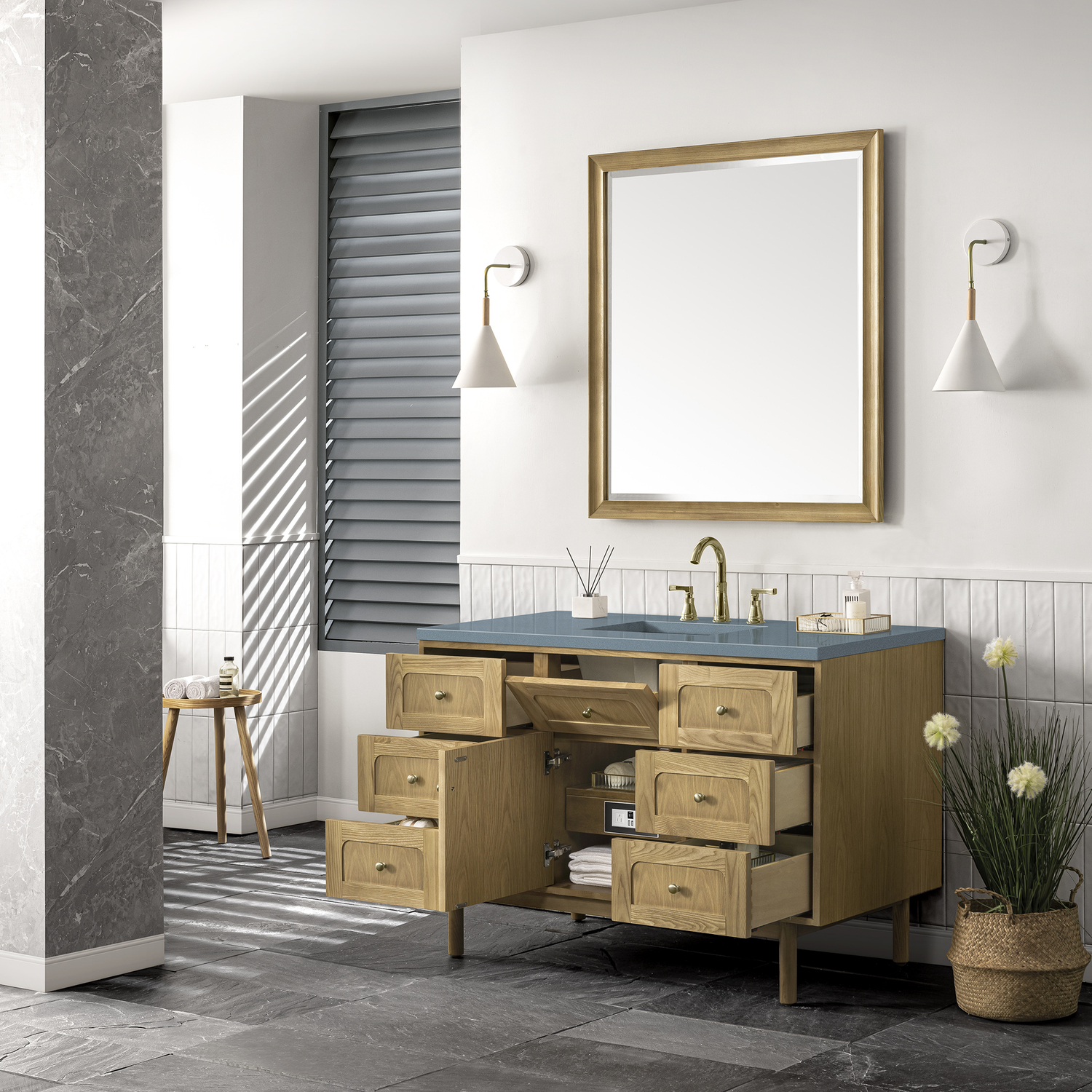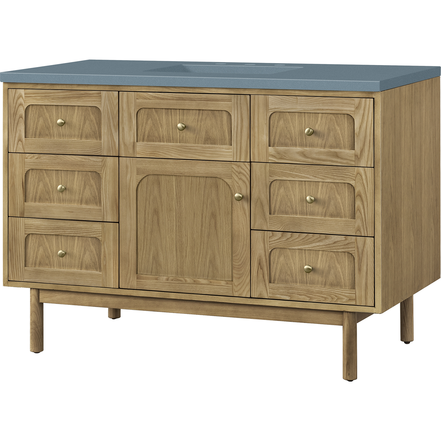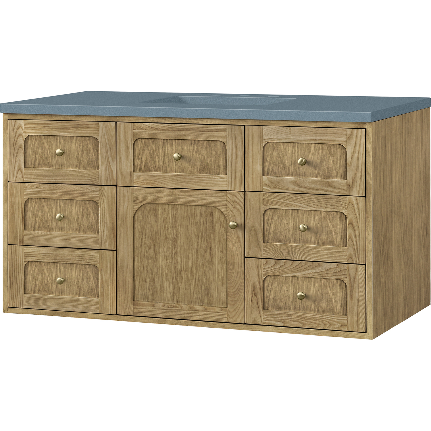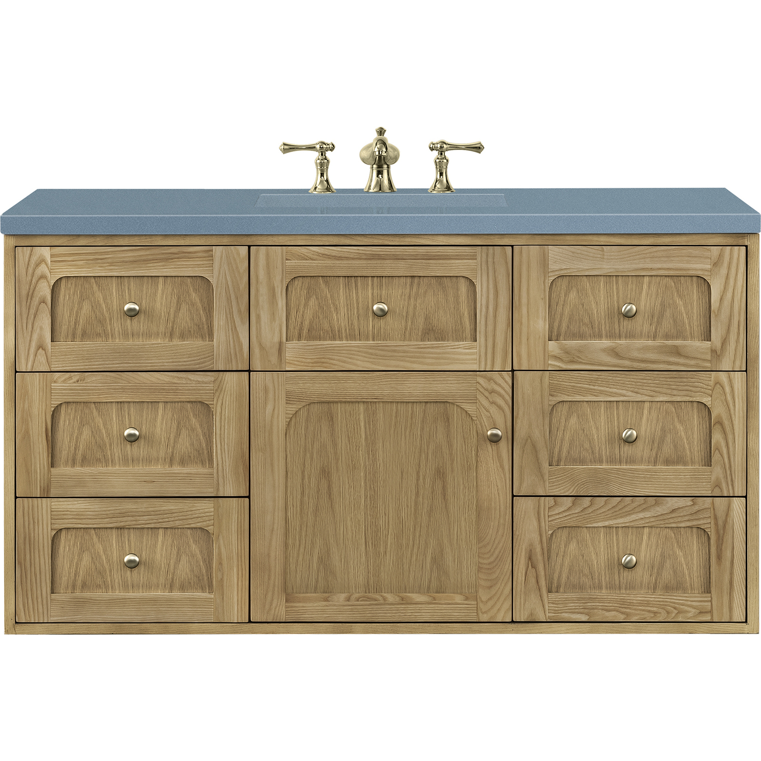 The 48" Laurent Single Vanity features picture frame detailing with unexpected soft curves. The Light Natural Oak finish over cathedral grain ash veneers creates modern rustic appeal. This vanity offers a top-row tip-out style drawer, six traditional drawers, and a removable bamboo storage tray. The single door opens to an adjustable shelf and convenient dual power and USB outlet. Choose to install it as a free-standing vanity with the modern wood base, or choose to float it on your wall using our durable French cleat hardware. The beautiful natural wood texture, elegant detailing, and Champagne Brass knobs create a point of interest in any bathroom space. The 3 CM Cala Blue Silestone top adds the final touch.3 CM eased edge Cala Blue Silestone top includes a white porcelain rectangular sink that ships separately and includes mounting brackets for easy installation. Faucet not included.This cabinet is constructed with ash solids and flat cut White Oak veneers over a plywood core and is sealed inside and outside with our premium moisture and UV-resistant coatingsOne door cabinet with one interior, adjustable height shelf and seven drawers, the middle-top row drawer is tip-out style.Plywood drawer boxes feature English Dovetail joinery and our signature brushed aluminum laminate drawer liners for easy cleaningDual Mounting OptionThis cabinet may be installed with the wood base as a free standing vanity or mounted to the wall as a floating vanity. All mounting hardware is included.Dual Power and USB portsDecorative knobs in Champagne BrassWith a design that evokes unpretentious Boho Chic charm, the Laurent features picture frame detailing with unexpected soft curves. The Light Natural Oak finish over cathedral grain ash veneers creates modern rustic appeal. Available in four sizes, this collection may be free-standing, or floating. The beautiful natural wood texture and elegant detailing create a point of interest in any bathroom space.1 year warranty against manufacturer's defects. We will repair or replace any defective product, if the product is defective in material or workmanship at our discretion. No warranty is expressed or implied regarding damages resulting from consumer misuse.