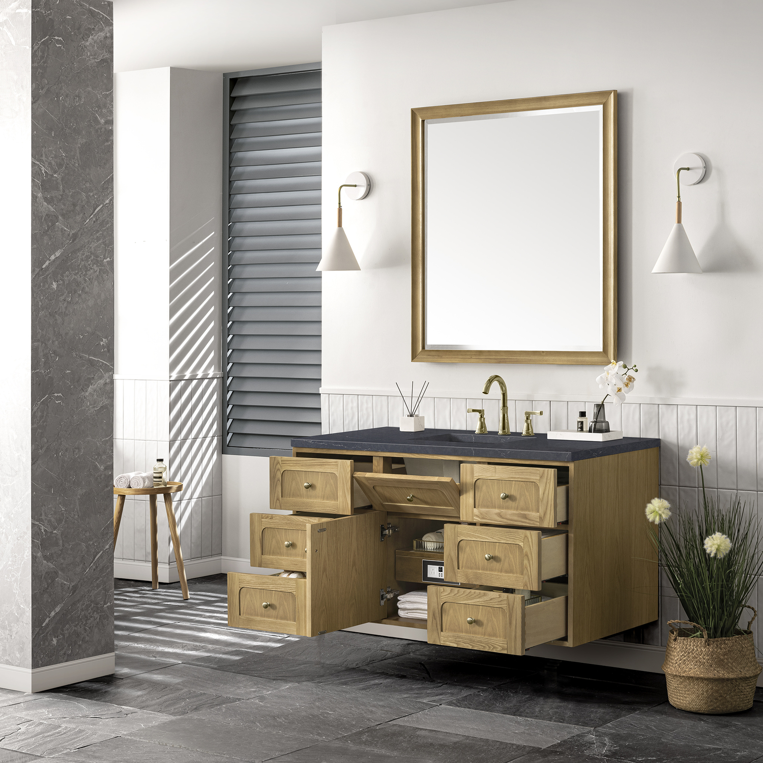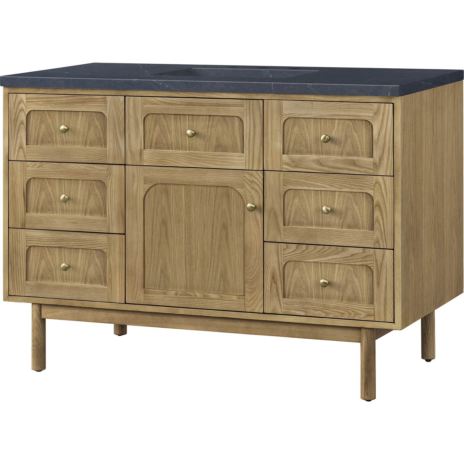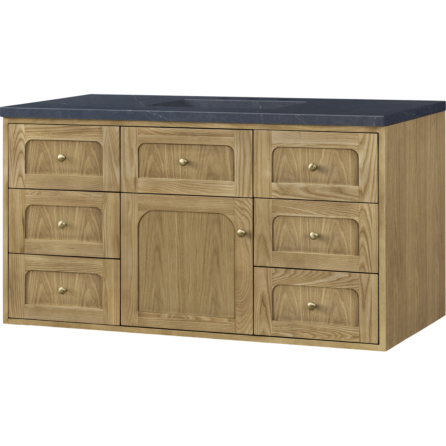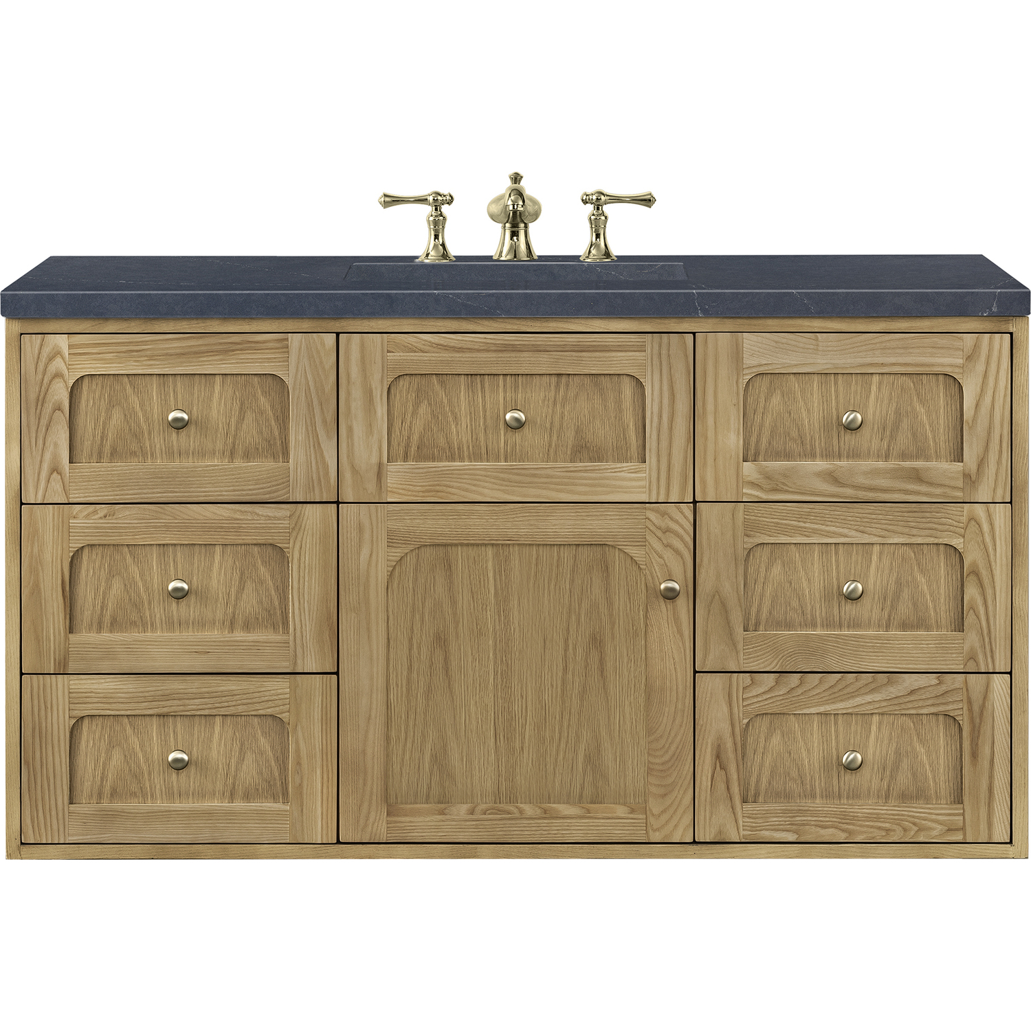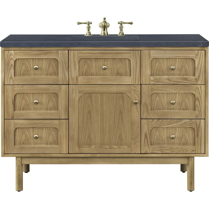 A modern interpretation of mid-century design, the Laurent 48" Single Vanity features organic charm with soft, rounded picture-frame details. Its Light Natural Oak finish over cathedral grain Ash veneers highlights the beautiful, natural wood texture, while Champagne Brass knobs lend a touch of elegance. Designed for versatility, this vanity offers a top-row tip-out drawer, six traditional full-extension drawers, and a removable bamboo drawer organizer. The single cabinet door opens to an adjustable shelf and a conveniently integrated USB/120V power unit. Choose to install the Laurent as a freestanding vanity with the modern wood base, or float it on your wall using our durable French cleat hardware. Perfectly crafted and beautifully appointed, Laurent brings an understated elegance to any bathroom. The addition of a matte Charcoal Soapstone Silestone top completes the look.Single-door cabinet with internal shelf; middle top-row tip-out drawer, and six standard drawersDrawer boxes feature English Dovetail joinery with premium, soft-close undermount drawer slides; doors feature soft-close, adjustable door hingesCabinet features a multi-stage premium finish coat to offer UV and moisture resistanceLight Natural Oak finish with Champagne Brass hardwareCountertop is pre-drilled for an 8" widespread faucet; our 3cm eased edge countertops come with white porcelain rectangular sink that ships separately and includes mounting brackets for easy installationIntegrated 120V outlet with USB portsDrawers lined with our signature brushed aluminum laminate for easy cleaningRemovable bamboo drawer organizer includedDual-mounted: can be installed freestanding or floatingFaucet sold separatelyDesigned with a contemporary appeal, the Laurent Collection is a modern interpretation of mid-century design, featuring rounded picture-frame detailing in a beautiful Light Natural Oak finish over cathedral grain Ash veneers. Available in six sizes, the Laurent can be installed as a floating vanity or can remain freestanding. Let the beautiful natural wood and elegant design create a beautiful focal point for any bathroom space.1 year warranty against manufacturer's defects. We will repair or replace any defective product, if the product is defective in material or workmanship at our discretion. No warranty is expressed or implied regarding damages resulting from consumer misuse.
