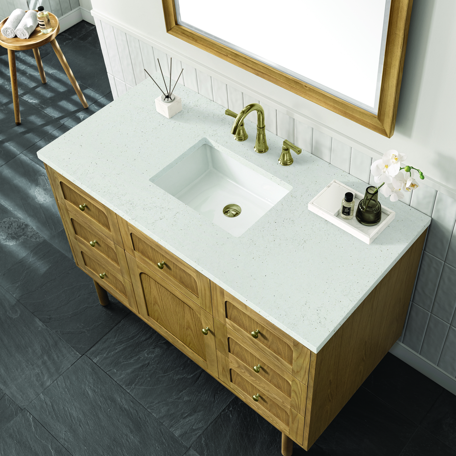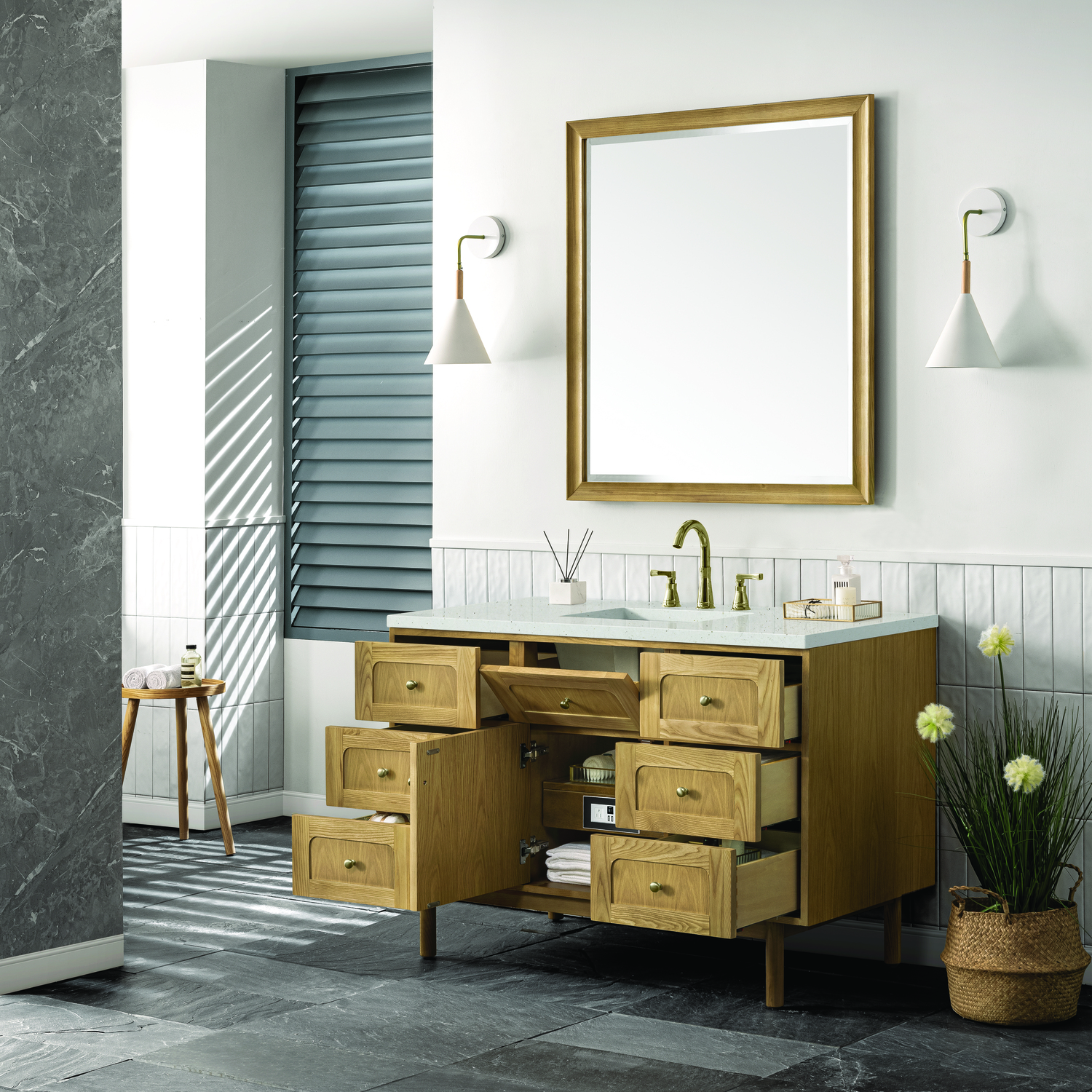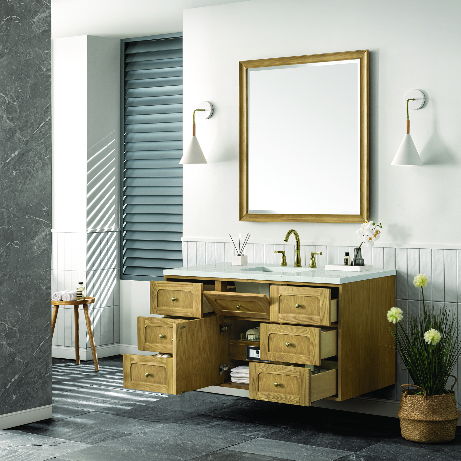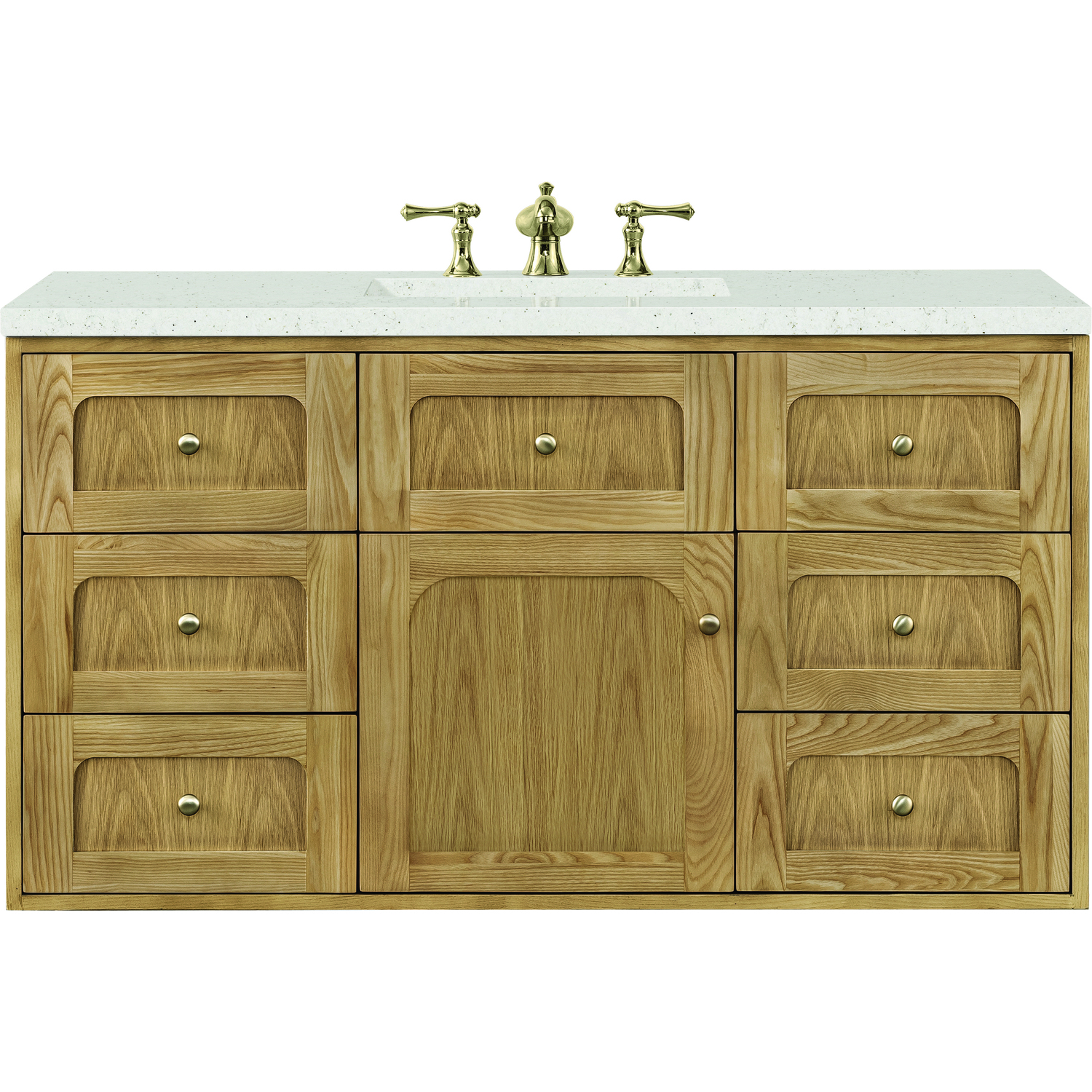 A modern interpretation of mid-century design, the Laurent 48" Single Vanity features organic charm with soft, rounded picture-frame details. Its Light Natural Oak finish over cathedral grain Ash veneers highlights the beautiful, natural wood texture, while Champagne Brass knobs lend a touch of elegance. Designed for versatility, this vanity offers a top-row tip-out drawer, six traditional full-extension drawers, and a removable bamboo drawer organizer. The single cabinet door opens to an adjustable shelf and a conveniently integrated USB/120V power unit. Choose to install the Laurent as a freestanding vanity with the modern wood base, or float it on your wall using our durable French cleat hardware. Perfectly crafted and beautifully appointed, Laurent brings an understated elegance to any bathroom. The Lime Delight Silestone top lends warm, textured beige tones to perfectly complement the Light Natural Oak finish of this vanity.Single-door cabinet with internal shelf; middle top-row tip-out drawer, and six standard drawersDrawer boxes feature English Dovetail joinery with premium, soft-close undermount drawer slides; doors feature soft-close, adjustable door hingesCabinet features a multi-stage premium finish coat to offer UV and moisture resistanceLight Natural Oak finish with Champagne Brass hardwareCountertop is pre-drilled for an 8" widespread faucet; our 3cm eased edge countertops come with white porcelain rectangular sink that ships separately and includes mounting brackets for easy installationIntegrated 120V outlet with USB portsDrawers lined with our signature brushed aluminum laminate for easy cleaningRemovable bamboo drawer organizer includedDual-mounted: can be installed freestanding or floatingFaucet sold separatelyDesigned with a contemporary appeal, the Laurent Collection is a modern interpretation of mid-century design, featuring rounded picture-frame detailing in a beautiful Light Natural Oak finish over cathedral grain Ash veneers. Available in six sizes, the Laurent can be installed as a floating vanity or can remain freestanding. Let the beautiful natural wood and elegant design create a beautiful focal point for any bathroom space.1 year warranty against manufacturer's defects. We will repair or replace any defective product, if the product is defective in material or workmanship at our discretion. No warranty is expressed or implied regarding damages resulting from consumer misuse.