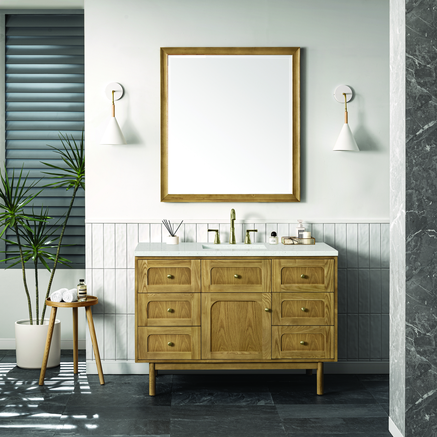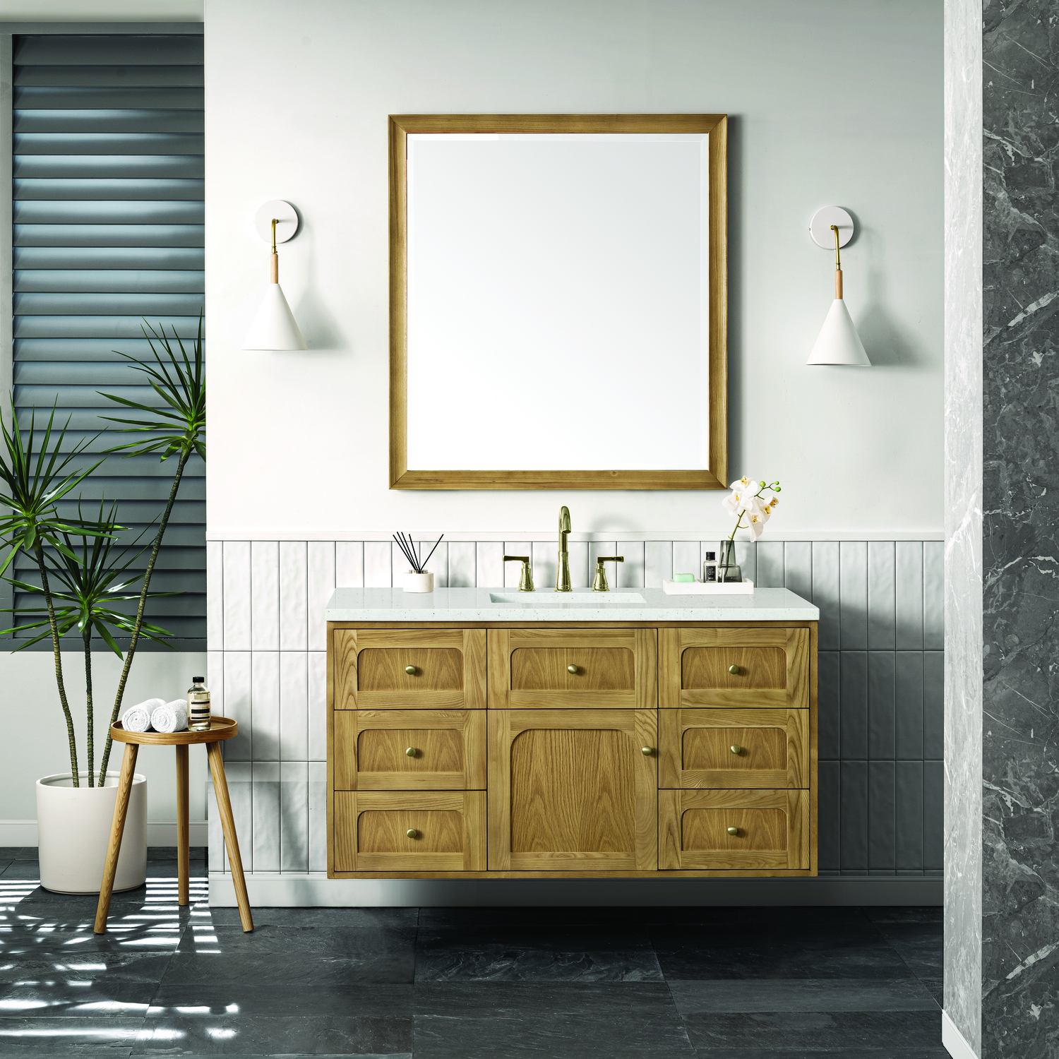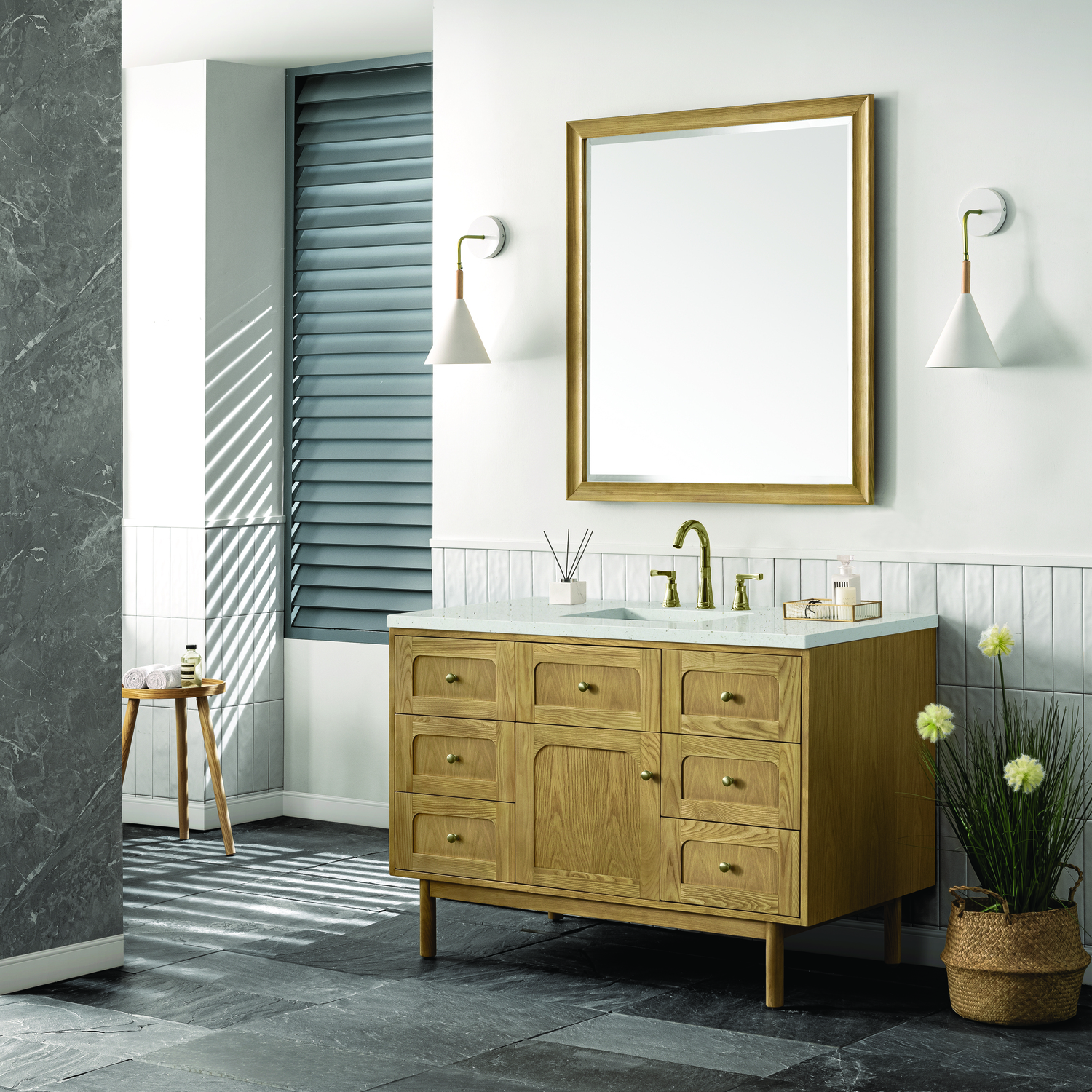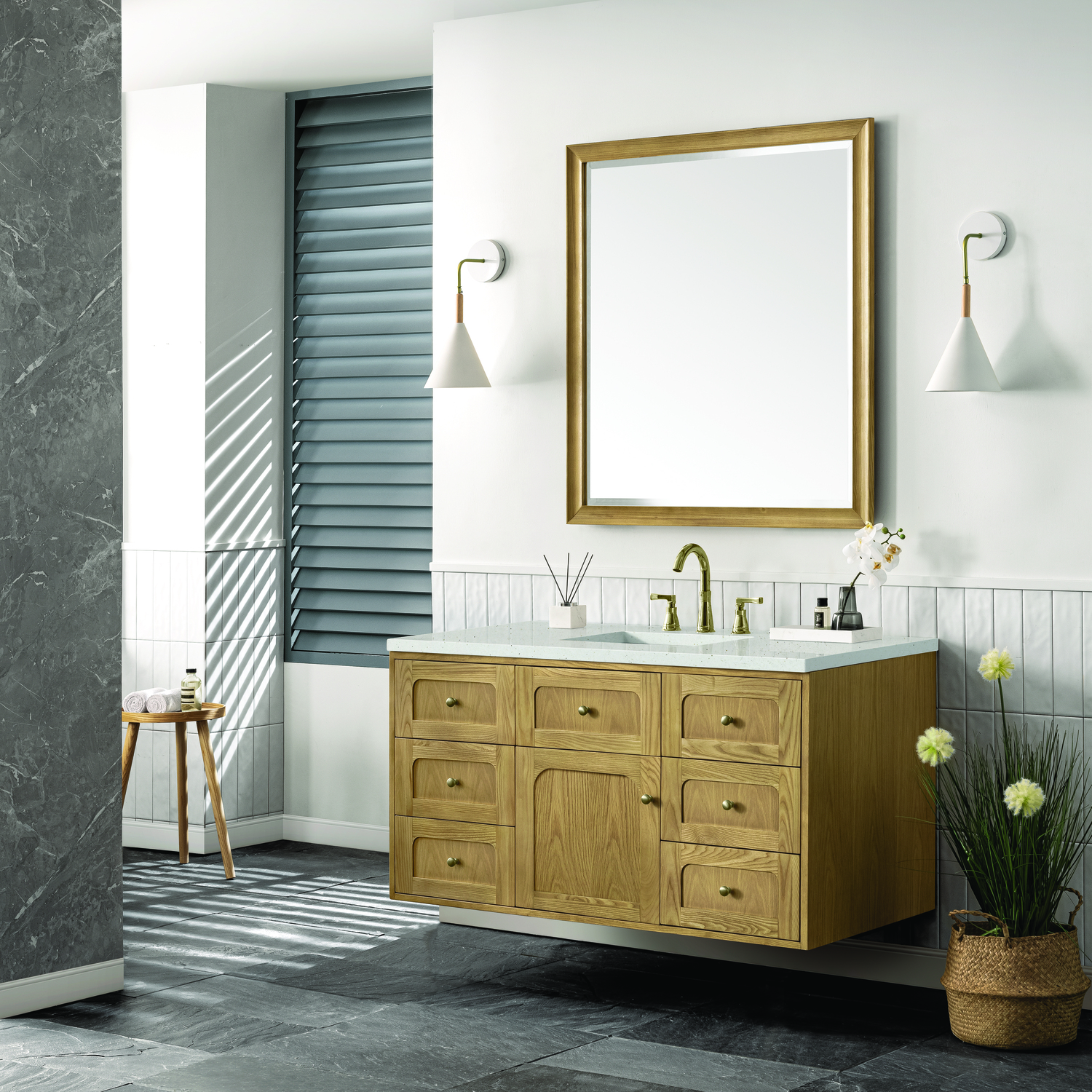 A modern interpretation of mid-century design, the Laurent 48" Single Vanity features organic charm with soft, rounded picture-frame details. Its Light Natural Oak finish over cathedral grain Ash veneers highlights the beautiful, natural wood texture, while Champagne Brass knobs lend a touch of elegance. Designed for versatility, this vanity offers a top-row tip-out drawer, six traditional full-extension drawers, and a removable bamboo drawer organizer. The single cabinet door opens to an adjustable shelf and a conveniently integrated USB/120V power unit. Choose to install the Laurent as a freestanding vanity with the modern wood base, or float it on your wall using our durable French cleat hardware. Perfectly crafted and beautifully appointed, Laurent brings an understated elegance to any bathroom. The Lime Delight Silestone top lends warm, textured beige tones to perfectly complement the Light Natural Oak finish of this vanity.Single-door cabinet with internal shelf; middle top-row tip-out drawer, and six standard drawersDrawer boxes feature English Dovetail joinery with premium, soft-close undermount drawer slides; doors feature soft-close, adjustable door hingesCabinet features a multi-stage premium finish coat to offer UV and moisture resistanceLight Natural Oak finish with Champagne Brass hardwareCountertop is pre-drilled for an 8" widespread faucet; our 3cm eased edge countertops come with white porcelain rectangular sink that ships separately and includes mounting brackets for easy installationIntegrated 120V outlet with USB portsDrawers lined with our signature brushed aluminum laminate for easy cleaningRemovable bamboo drawer organizer includedDual-mounted: can be installed freestanding or floatingFaucet sold separatelyDesigned with a contemporary appeal, the Laurent Collection is a modern interpretation of mid-century design, featuring rounded picture-frame detailing in a beautiful Light Natural Oak finish over cathedral grain Ash veneers. Available in six sizes, the Laurent can be installed as a floating vanity or can remain freestanding. Let the beautiful natural wood and elegant design create a beautiful focal point for any bathroom space.1 year warranty against manufacturer's defects. We will repair or replace any defective product, if the product is defective in material or workmanship at our discretion. No warranty is expressed or implied regarding damages resulting from consumer misuse.