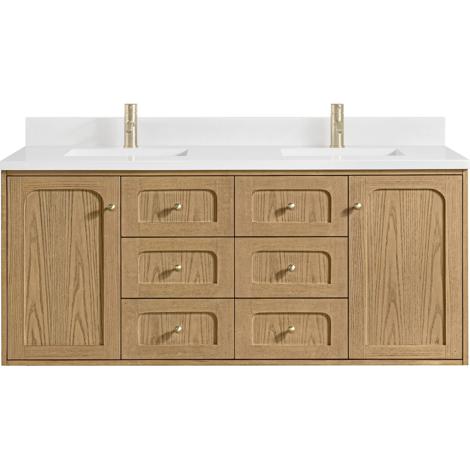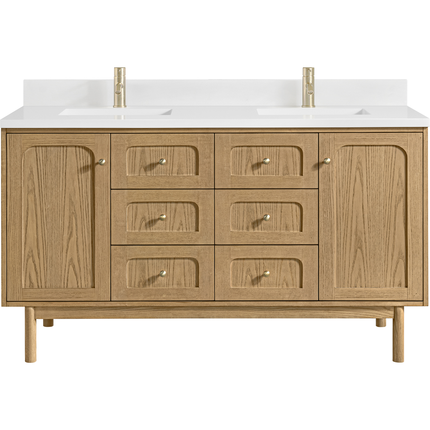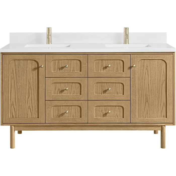 A modern interpretation of mid-century design, the Laurent 60" Double Vanity features organic charm with soft, rounded picture-frame details. Its Light Natural Oak finish over cathedral grain Ash veneers highlights the beautiful, natural wood texture, while Champagne Brass knobs lend a touch of elegance. Designed for versatility, this vanity offers two top-row tip-out drawers, four generously sized full-extension drawers, and a removable bamboo drawer organizer. The two-door cabinet door opens to adjustable shelves and a conveniently integrated USB/120V power unit. Choose to install the Laurent as a freestanding vanity with the modern wood base, or float it on your wall using our durable French cleat hardware. Perfectly crafted and beautifully appointed, Laurent brings an understated elegance to any bathroom. A classic White Zeus Silestone top and backsplash with undermount sink completes the look with a contemporary touch.Two single-door cabinets with internal shelves; two top-row tip-out drawers, and four standard drawersDrawer boxes feature English Dovetail joinery with premium, soft-close undermount drawer slides; doors feature soft-close, adjustable door hingesCabinet features a multi-stage premium finish coat to offer UV and moisture resistanceLight Natural Oak finish with Champagne Brass hardwareCountertop is pre-drilled for single-hole faucets; our 3cm eased edge countertops come with white porcelain rectangular sinks that ship separately and include mounting brackets for easy installationIntegrated 120V outlet with USB portsDrawers lined with our signature brushed aluminum laminate for easy cleaningRemovable bamboo drawer organizer includedDual-mounted: can be installed freestanding or floating with included French Cleat hardwareFaucets sold separatelyMatching White Zeus 3cm Silestone Backsplash included.Designed with a contemporary appeal, the Laurent Collection is a modern interpretation of mid-century design, featuring rounded picture-frame detailing in a beautiful Light Natural Oak finish over cathedral grain Ash veneers. Available in six sizes, the Laurent can be installed as a floating vanity or can remain freestanding. Let the beautiful natural wood and elegant design create a beautiful focal point for any bathroom space.1 year warranty against manufacturer's defects. We will repair or replace any defective product, if the product is defective in material or workmanship at our discretion. No warranty is expressed or implied regarding damages resulting from consumer misuse.