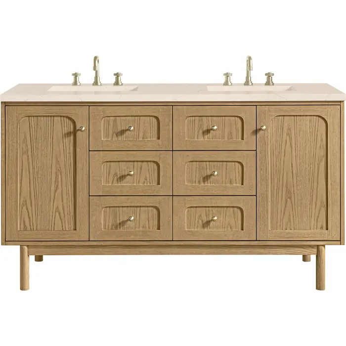 A modern interpretation of mid-century design, the Laurent 60" Double Vanity features organic charm with soft, rounded picture-frame details. Its Light Natural Oak finish over cathedral grain Ash veneers highlights the beautiful, natural wood texture, while Champagne Brass knobs lend a touch of elegance. Designed for versatility, this vanity offers two top-row tip-out drawers, four generously sized full-extension drawers, and a removable bamboo drawer organizer. The two-door cabinet door opens to adjustable shelves and a conveniently integrated USB/120V power unit. Choose to install the Laurent as a freestanding vanity with the modern wood base, or float it on your wall using our durable French cleat hardware. Perfectly crafted and beautifully appointed, Laurent brings an understated elegance to any bathroom. The Eternal Marfil Silestone top completes the look.Two single-door cabinets with internal shelves; two top-row tip-out drawers, and four standard drawersDrawer boxes feature English Dovetail joinery with premium, soft-close undermount drawer slides; doors feature soft-close, adjustable door hingesCabinet features a multi-stage premium finish coat to offer UV and moisture resistanceLight Natural Oak finish with Champagne Brass hardwareCountertop is pre-drilled for 8" widespread faucets; our 3cm eased edge countertops come with white porcelain rectangular sinks that ship separately and include mounting brackets for easy installationIntegrated 120V outlet with USB portsDrawers lined with our signature brushed aluminum laminate for easy cleaningRemovable bamboo drawer organizer includedDual-mounted: can be installed freestanding or floating with included French Cleat hardwareFaucets sold separatelyDesigned with a contemporary appeal, the Laurent Collection is a modern interpretation of mid-century design, featuring rounded picture-frame detailing in a beautiful Light Natural Oak finish over cathedral grain Ash veneers. Available in six sizes, the Laurent can be installed as a floating vanity or can remain freestanding. Let the beautiful natural wood and elegant design create a beautiful focal point for any bathroom space.1 year warranty against manufacturer's defects. We will repair or replace any defective product, if the product is defective in material or workmanship at our discretion. No warranty is expressed or implied regarding damages resulting from consumer misuse.