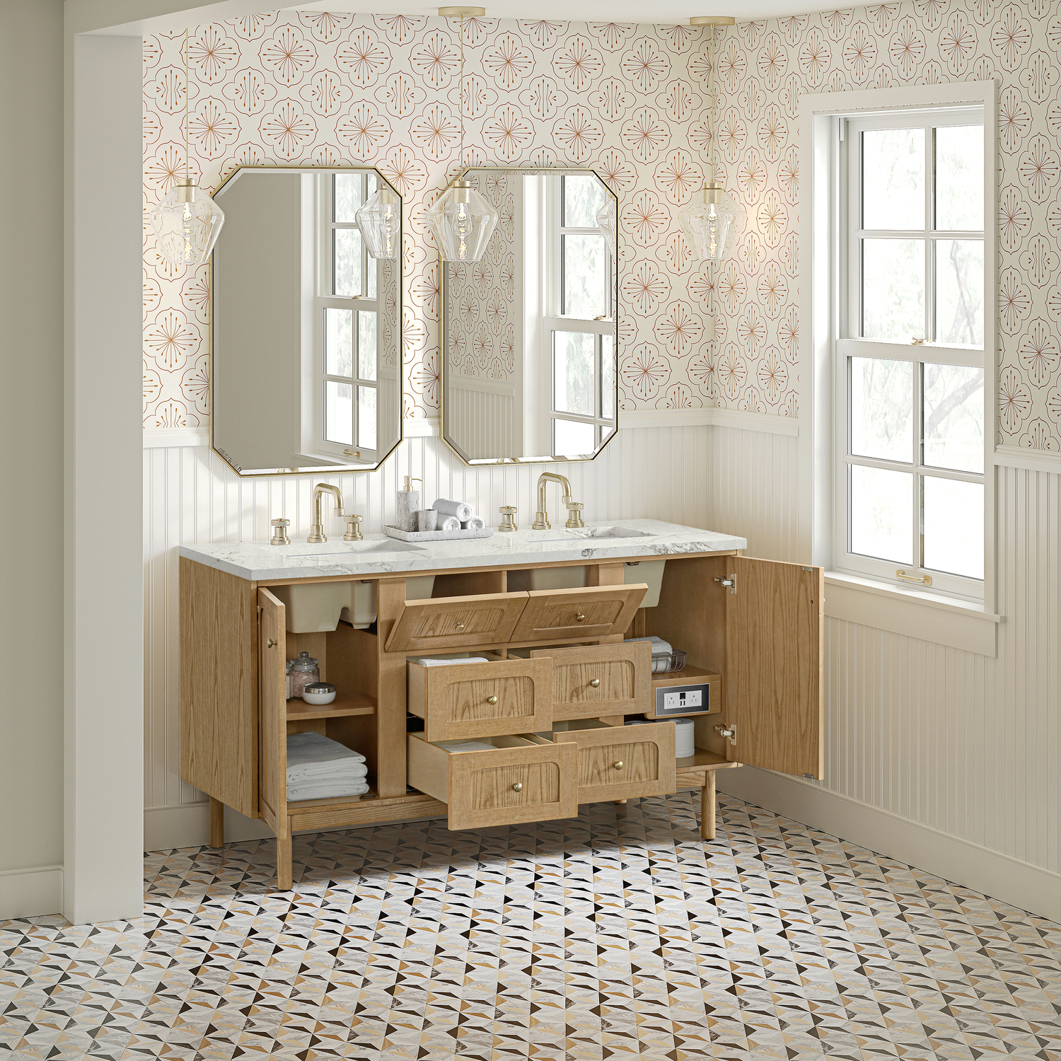 A modern interpretation of mid-century design, the Laurent 60" Double Vanity features organic charm with soft, rounded picture-frame details. Its Light Natural Oak finish over cathedral grain Ash veneers highlights the beautiful, natural wood texture, while Champagne Brass knobs lend a touch of elegance. Designed for versatility, this vanity offers two top-row tip-out drawers, four generously sized full-extension drawers, and a removable bamboo drawer organizer. The two-door cabinet door opens to adjustable shelves and a conveniently integrated USB/120V power unit. Choose to install the Laurent as a freestanding vanity with the modern wood base, or float it on your wall using our durable French cleat hardware. Perfectly crafted and beautifully appointed, Laurent brings an understated elegance to any bathroom. The light wood finish is enhanced by the neutral background of the Victorian Silver Silestone top, which boasts beautiful veining and champagne metallic accents which seamlessly complements both warm and cool tones.Two single-door cabinets with internal shelves; two top-row tip-out drawers, and four standard drawersDrawer boxes feature English Dovetail joinery with premium, soft-close undermount drawer slides; doors feature soft-close, adjustable door hingesCabinet features a multi-stage premium finish coat to offer UV and moisture resistanceLight Natural Oak finish with Champagne Brass hardwareCountertop is pre-drilled for 8" widespread faucets; our 3cm eased edge countertops come with white porcelain rectangular sinks that ship separately and include mounting brackets for easy installationIntegrated 120V outlet with USB portsDrawers lined with our signature brushed aluminum laminate for easy cleaningRemovable bamboo drawer organizer includedDual-mounted: can be installed freestanding or floating with included French Cleat hardwareFaucets sold separatelyDesigned with a contemporary appeal, the Laurent Collection is a modern interpretation of mid-century design, featuring rounded picture-frame detailing in a beautiful Light Natural Oak finish over cathedral grain Ash veneers. Available in six sizes, the Laurent can be installed as a floating vanity or can remain freestanding. Let the beautiful natural wood and elegant design create a beautiful focal point for any bathroom space.1 year warranty against manufacturer's defects. We will repair or replace any defective product, if the product is defective in material or workmanship at our discretion. No warranty is expressed or implied regarding damages resulting from consumer misuse.