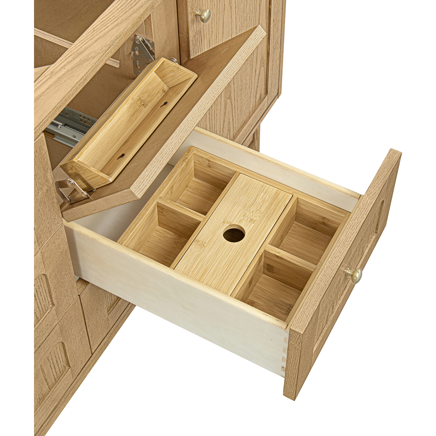A modern interpretation of mid-century design, the Laurent 60" Double Vanity features organic charm with soft, rounded picture-frame details. Its Light Natural Oak finish over cathedral grain Ash veneers highlights the beautiful, natural wood texture, while Champagne Brass knobs lend a touch of elegance. Designed for versatility, this vanity offers two top-row tip-out drawers, four generously sized full-extension drawers, and a removable bamboo drawer organizer. The two-door cabinet door opens to adjustable shelves and a conveniently integrated USB/120V power unit. Choose to install the Laurent as a freestanding vanity with the modern wood base, or float it on your wall using our durable French cleat hardware. Perfectly crafted and beautifully appointed, Laurent brings an understated elegance to any bathroom. Select one of our 3 cm tops to complete the look.Two single-door cabinets with internal shelves; two top-row tip-out drawers, and four standard drawersDrawer boxes feature English Dovetail joinery with premium, soft-close undermount drawer slides; doors feature soft-close, adjustable door hingesCabinet features a multi-stage premium finish coat to offer UV and moisture resistanceLight Natural Oak finish with Champagne Brass hardwareCabinet only; select one of our countertops to complete the vanityIntegrated 120V outlet with USB portsDrawers lined with our signature brushed aluminum laminate for easy cleaningRemovable bamboo drawer organizer includedDual-mounted: can be installed freestanding or floating with included French Cleat hardwareFaucets sold separatelyDesigned with a contemporary appeal, the Laurent Collection is a modern interpretation of mid-century design, featuring rounded picture-frame detailing in a beautiful Light Natural Oak finish over cathedral grain Ash veneers. Available in six sizes, the Laurent can be installed as a floating vanity or can remain freestanding. Let the beautiful natural wood and elegant design create a beautiful focal point for any bathroom space.1 year warranty against manufacturer's defects. We will repair or replace any defective product, if the product is defective in material or workmanship at our discretion. No warranty is expressed or implied regarding damages resulting from consumer misuse.