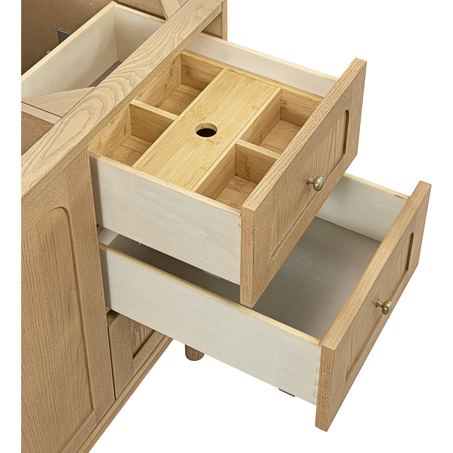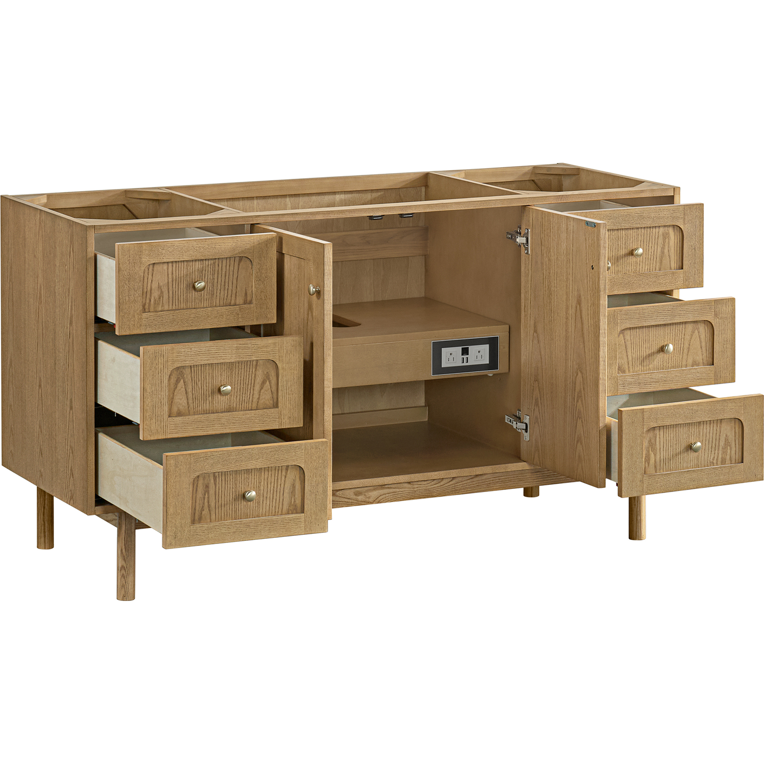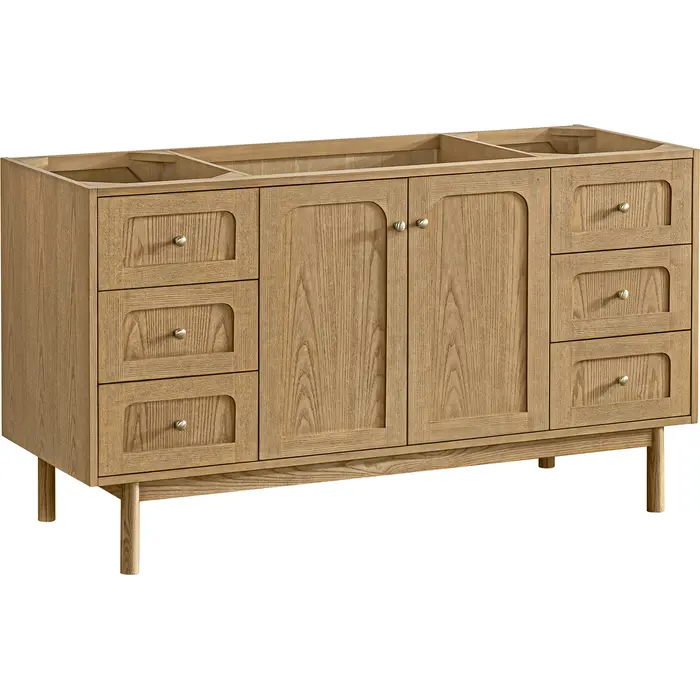 A modern interpretation of mid-century design, the Laurent 60" Single Vanity features organic charm with soft, rounded picture-frame details. Its Light Natural Oak finish over cathedral grain Ash veneers highlights the beautiful, natural wood texture, while Champagne Brass knobs lend a touch of elegance. Designed for versatility, this vanity offers six generously sized full-extension drawers and a removable bamboo drawer organizer. The two-door cabinet opens to an adjustable shelf and a conveniently integrated USB/120V power unit. Choose to install the Laurent as a freestanding vanity with the modern wood base, or float it on your wall using our durable French cleat hardware. Perfectly crafted and beautifully appointed, Laurent brings an understated elegance to any bathroom. Select one of our 3 cm tops to complete the look.Two-door cabinet with internal shelf; six standard drawersDrawer boxes feature English Dovetail joinery with premium, soft-close undermount drawer slides; doors feature soft-close, adjustable door hingesCabinet features a multi-stage premium finish coat to offer UV and moisture resistanceLight Natural Oak finish with Champagne Brass hardwareCabinet only; select one of our countertops to complete the vanityIntegrated 120V outlet with USB portsDrawers lined with our signature brushed aluminum laminate for easy cleaningRemovable bamboo drawer organizer includedDual-mounted: can be installed freestanding or floating with included French Cleat hardwareFaucet sold separatelyDesigned with a contemporary appeal, the Laurent Collection is a modern interpretation of mid-century design, featuring rounded picture-frame detailing in a beautiful Light Natural Oak finish over cathedral grain Ash veneers. Available in six sizes, the Laurent can be installed as a floating vanity or can remain freestanding. Let the beautiful natural wood and elegant design create a beautiful focal point for any bathroom space.1 year warranty against manufacturer's defects. We will repair or replace any defective product, if the product is defective in material or workmanship at our discretion. No warranty is expressed or implied regarding damages resulting from consumer misuse.
