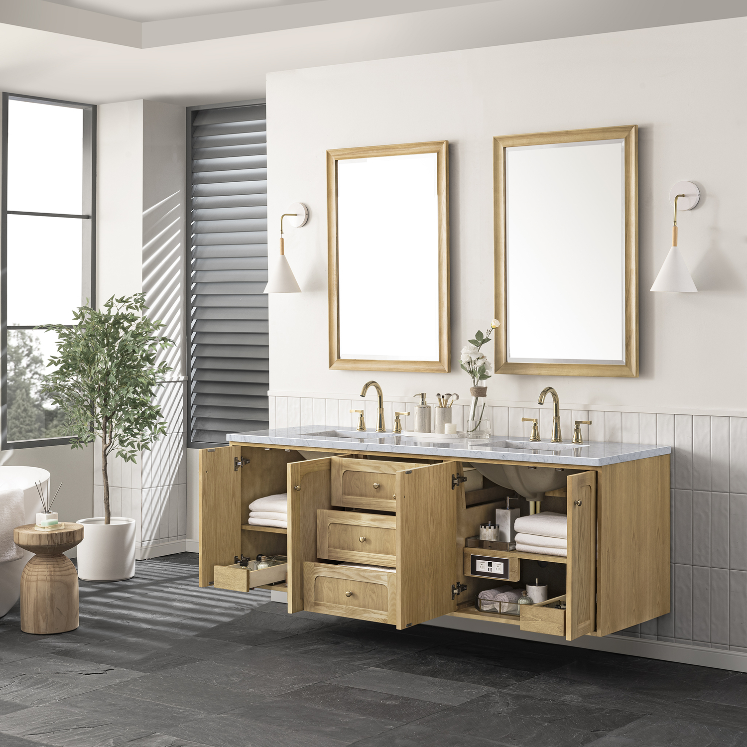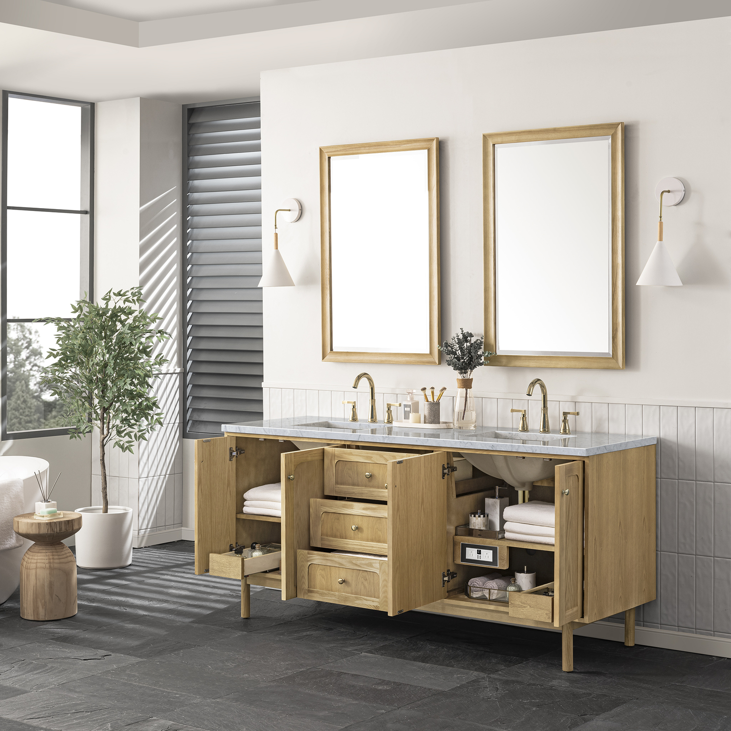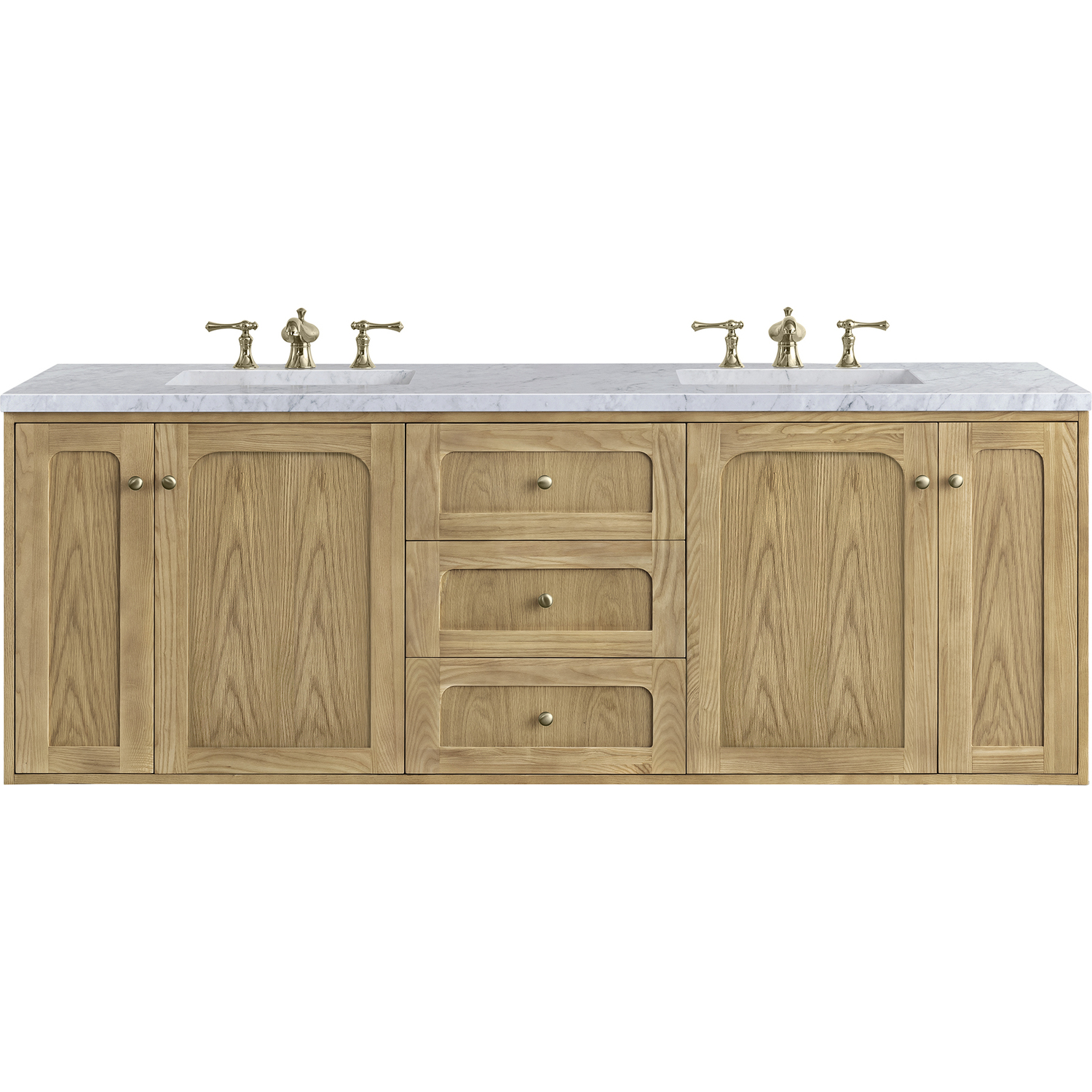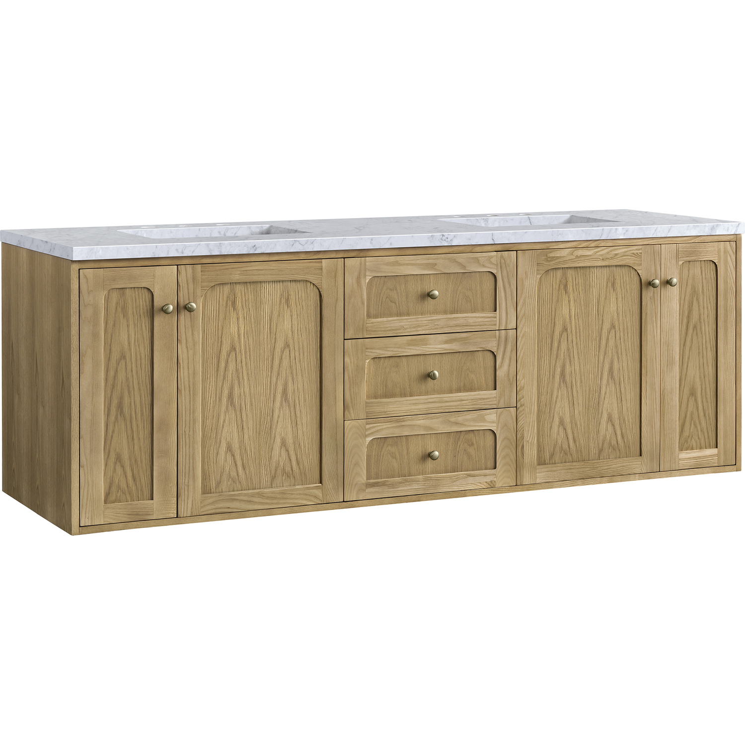A modern interpretation of mid-century design, the Laurent 60" Double Vanity features organic charm with soft, rounded picture-frame details. Its Light Natural Oak finish over cathedral grain Ash veneers highlights the beautiful, natural wood texture, while Champagne Brass knobs lend a touch of elegance. Designed for versatility, this vanity boasts three generously sized full-extension drawers and a removable bamboo drawer organizer. The two double-door cabinets open to adjustable shelves, two tray-style drawers, and a conveniently integrated USB/120V power unit. Choose to install the Laurent as a freestanding vanity with the modern wood base, or float it on your wall using our durable French cleat hardware. Perfectly crafted and beautifully appointed, Laurent brings an understated elegance to any bathroom. A timeless Carrara Marble top completes the look.Two double-door cabinets with internal shelves and two internal tray-style drawers; three standard drawersDrawer boxes feature English Dovetail joinery with premium, soft-close undermount drawer slides; doors feature soft-close, adjustable door hingesCabinet features a multi-stage premium finish coat to offer UV and moisture resistanceLight Natural Oak finish with Champagne Brass hardwareCountertop is pre-drilled for 8" widespread faucets; our 3cm eased edge countertops come with white porcelain curved basin sinks that ship separately and include mounting brackets for easy installationIntegrated 120V outlet with USB portsDrawers lined with our signature brushed aluminum laminate for easy cleaningRemovable bamboo drawer organizer includedDual-mounted: can be installed freestanding or floatingFaucets sold separatelyDesigned with a contemporary appeal, the Laurent Collection is a modern interpretation of mid-century design, featuring rounded picture-frame detailing in a beautiful Light Natural Oak finish over cathedral grain Ash veneers. Available in six sizes, the Laurent can be installed as a floating vanity or can remain freestanding. Let the beautiful natural wood and elegant design create a beautiful focal point for any bathroom space.1 year warranty against manufacturer's defects. We will repair or replace any defective product, if the product is defective in material or workmanship at our discretion. No warranty is expressed or implied regarding damages resulting from consumer misuse.