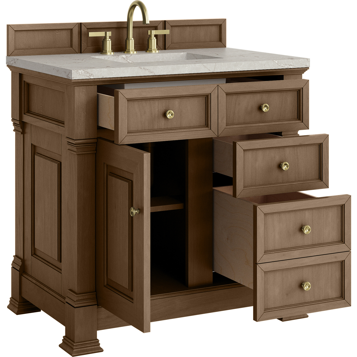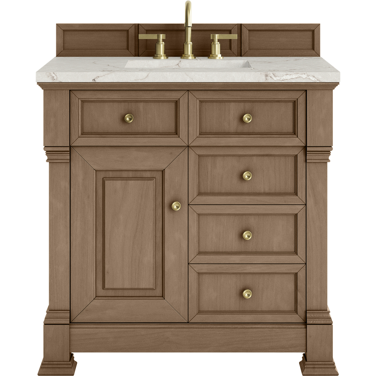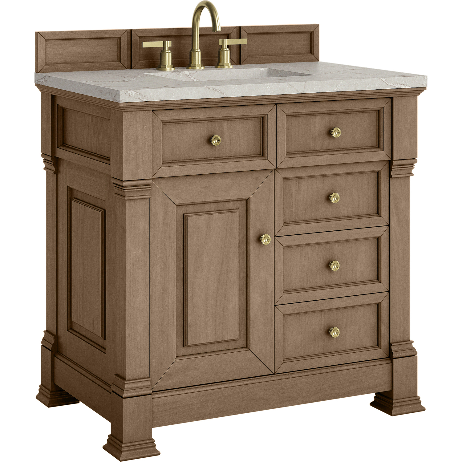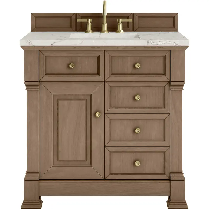 The Brookfield 36" Single Vanity in Pecan by James Martin Vanities offers a blend of traditional elegance and contemporary sophistication. The raised panel picture frame doors and detailed corner molding reflect timeless craftsmanship, while the Pecan finish and Champagne Brass hardware lend a fresh, modern appeal. This beautifully crafted vanity features a single-door cabinet with an interior shelf, a double-height drawer for added versatility, and two standard drawers for ample storage. The cool wood tones highlight the natural Oak wood grains, lending sophistication and charm to your space. The addition of a Victorian Silver Silestone® top featuring a neutral white and gray background with fine silver veining, along with an undermount sink, completes the look.Single door cabinet with interior shelf, one double height drawer and two standard drawersDrawer boxes feature English Dovetail joinery with premium, soft-close undermount drawer slides; doors feature soft-close, adjustable door hingesCabinet features a multi-stage premium finish coat to offer UV and moisture resistancePecan finish with Champagne Brass hardwareCountertop is pre-drilled for an 8" widespread faucet; our 3cm eased edge countertop comes with a white porcelain sink that ships separately and includes mounting brackets for easy installationDrawers lined with our signature brushed aluminum laminate for easy cleaningFreestanding VanityMatching wood backsplash includedFaucet sold separatelyInspired by statement heirloom pieces, the Brookfield Collection has a fresh new look! Featuring raised panel doors and corner molding, we've updated Brookfield's traditional design to feel more contemporary. Available in three beautiful finishes, this collection offers a functional storage solution with a sophisticated, hand-crafted appeal.1 year warranty against manufacturer's defects. We will repair or replace any defective product, if the product is defective in material or workmanship at our discretion. No warranty is expressed or implied regarding damages resulting from consumer misuse.