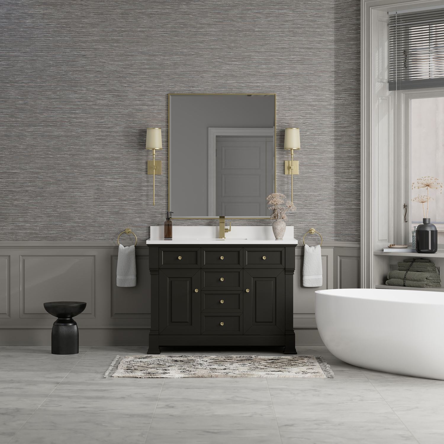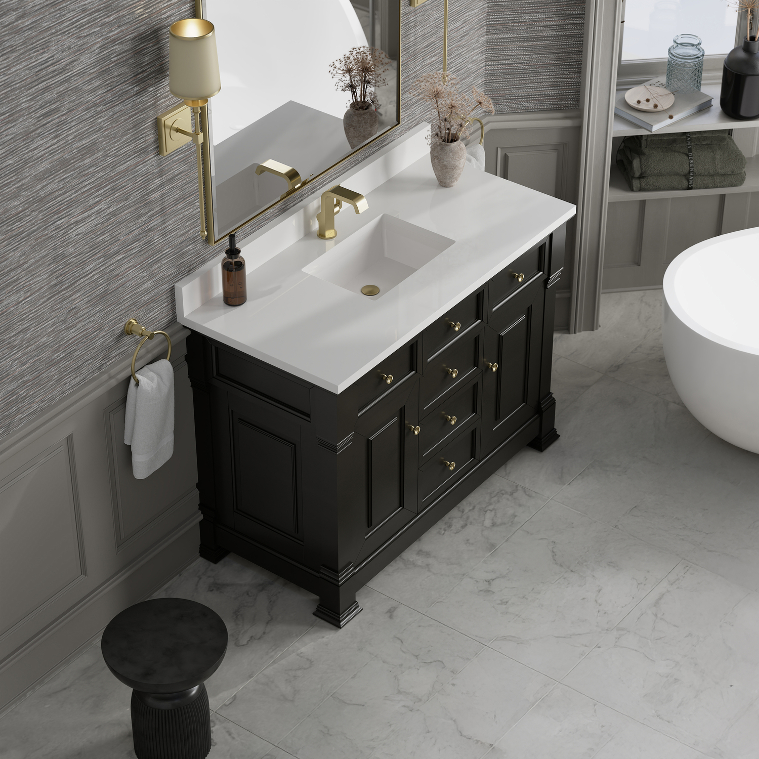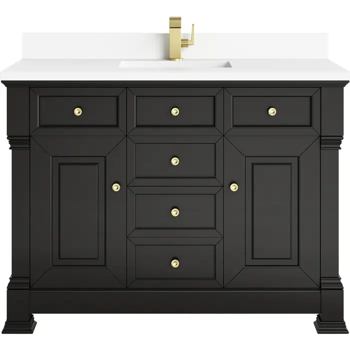 The Brookfield 48" Single Vanity in Black Onyx by James Martin Vanities offers a blend of traditional elegance and contemporary sophistication. The raised panel picture frame doors and detailed corner molding reflect timeless craftsmanship, while the rich Black Onyx vanity finish and Champagne Brass hardware lend a fresh, modern appeal. This beautifully crafted piece features two single-door cabinets that open to interior shelves, three standard drawers and one double height drawer for ample storage. The timeless Black Onyx finish lends sophistication and charm to your space. The vanity is completed by a classic White Zeus Silestone® top and backsplash with undermount sink.Two single door cabinets that open to interior shelves; three standard drawers and one double height drawerDrawer boxes feature English Dovetail joinery with premium, soft-close undermount drawer slides; doors feature soft-close, adjustable door hingesCabinet features a multi-stage premium finish coat to offer UV and moisture resistanceBlack Onyx finish with Champagne Brass hardwareWhite Zeus Silestone® top with backsplash is pre-drilled for single-hole faucet; our 3cm eased edge countertop comes with a white porcelain undermount sink that ships separately and includes mounting brackets for easy installationDrawers lined with our signature brushed aluminum laminate for easy cleaningFreestanding VanityMatching wood backsplash includedFaucet sold separatelyInspired by statement heirloom pieces, the Brookfield Collection has a fresh new look! Featuring raised panel doors and corner molding, we've updated Brookfield's traditional design to feel more contemporary. Available in three beautiful finishes, this collection offers a functional storage solution with a sophisticated, hand-crafted appeal.1 year warranty against manufacturer's defects. We will repair or replace any defective product, if the product is defective in material or workmanship at our discretion. No warranty is expressed or implied regarding damages resulting from consumer misuse.