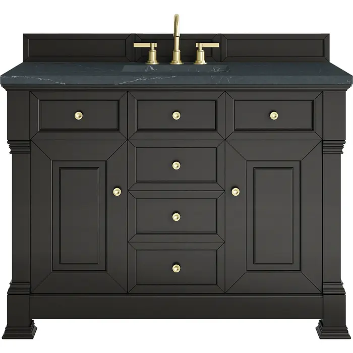 The Brookfield 48" Single Vanity in Black Onyx by James Martin Vanities offers a blend of traditional elegance and contemporary sophistication. The raised panel picture frame doors and detailed corner molding reflect timeless craftsmanship, while the rich Black Onyx vanity finish and Champagne Brass hardware lend a fresh, modern appeal. This beautifully crafted piece features two single-door cabinets that open to interior shelves, three standard drawers and one double height drawer for ample storage. The timeless Black Onyx finish lends sophistication and charm to your space. The addition of a matte Charcoal Soapstone Silestone® top with undermount sink completes the look.Two single door cabinets that open to interior shelves; three standard drawers and one double height drawerDrawer boxes feature English Dovetail joinery with premium, soft-close undermount drawer slides; doors feature soft-close, adjustable door hingesCabinet features a multi-stage premium finish coat to offer UV and moisture resistanceBlack Onyx finish with Champagne Brass hardwareCountertop is pre-drilled for an 8" widespread faucet; our 3cm eased edge countertop comes with a white porcelain sink that ships separately and includes mounting brackets for easy installationDrawers lined with our signature brushed aluminum laminate for easy cleaningFreestanding VanityMatching wood backsplash includedFaucet sold separatelyInspired by statement heirloom pieces, the Brookfield Collection has a fresh new look! Featuring raised panel doors and corner molding, we've updated Brookfield's traditional design to feel more contemporary. Available in three beautiful finishes, this collection offers a functional storage solution with a sophisticated, hand-crafted appeal.1 year warranty against manufacturer's defects. We will repair or replace any defective product, if the product is defective in material or workmanship at our discretion. No warranty is expressed or implied regarding damages resulting from consumer misuse.