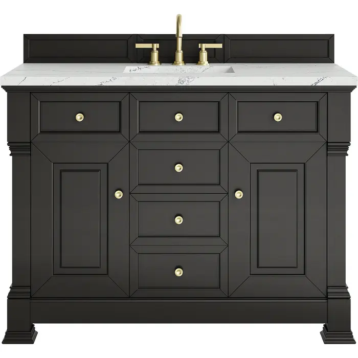 The Brookfield 48" Single Vanity in Black Onyx by James Martin Vanities offers a blend of traditional elegance and contemporary sophistication. The raised panel picture frame doors and detailed corner molding reflect timeless craftsmanship, while the rich Black Onyx vanity finish and Champagne Brass hardware lend a fresh, modern appeal. This beautifully crafted piece features two single-door cabinets that open to interior shelves, three standard drawers and one double height drawer for ample storage. The timeless Black Onyx finish lends sophistication and charm to your space. The addition of an Ethereal Noctis Silestone® top with undermount sink completes the look. This unit is enabled with FreePower wireless charging; featuring a single-device charger seamlessly embedded into the countertop, indicated by a light-up halo to the left of the sink. Designed for modern living, FreePower offers convenient, integrated, wireless charging when and where you need it.Two single door cabinets that open to interior shelves; three standard drawers and one double height drawerDrawer boxes feature English Dovetail joinery with premium, soft-close undermount drawer slides; doors feature soft-close, adjustable door hingesCabinet features a multi-stage premium finish coat to offer UV and moisture resistanceBlack Onyx finish with Champagne Brass hardwareCountertop is pre-drilled for an 8" widespread faucet; our 3cm eased edge countertops come with white porcelain rectangular sink(s) that ship separately and include mounting brackets for easy installationFaucet sold separatelyDrawers lined with our signature brushed aluminum laminate for easy cleaningFreestanding VanityMatching wood backsplash includedMatching stone backsplash available as add-on purchaseFreePower Wireless Charging; single-device unit left of sinkInspired by statement heirloom pieces, the Brookfield Collection has a fresh new look! Featuring raised panel doors and corner molding, we've updated Brookfield's traditional design to feel more contemporary. Available in three beautiful finishes, this collection offers a functional storage solution with a sophisticated, hand-crafted appeal.1 year warranty against manufacturer's defects. We will repair or replace any defective product, if the product is defective in material or workmanship at our discretion. No warranty is expressed or implied regarding damages resulting from consumer misuse.