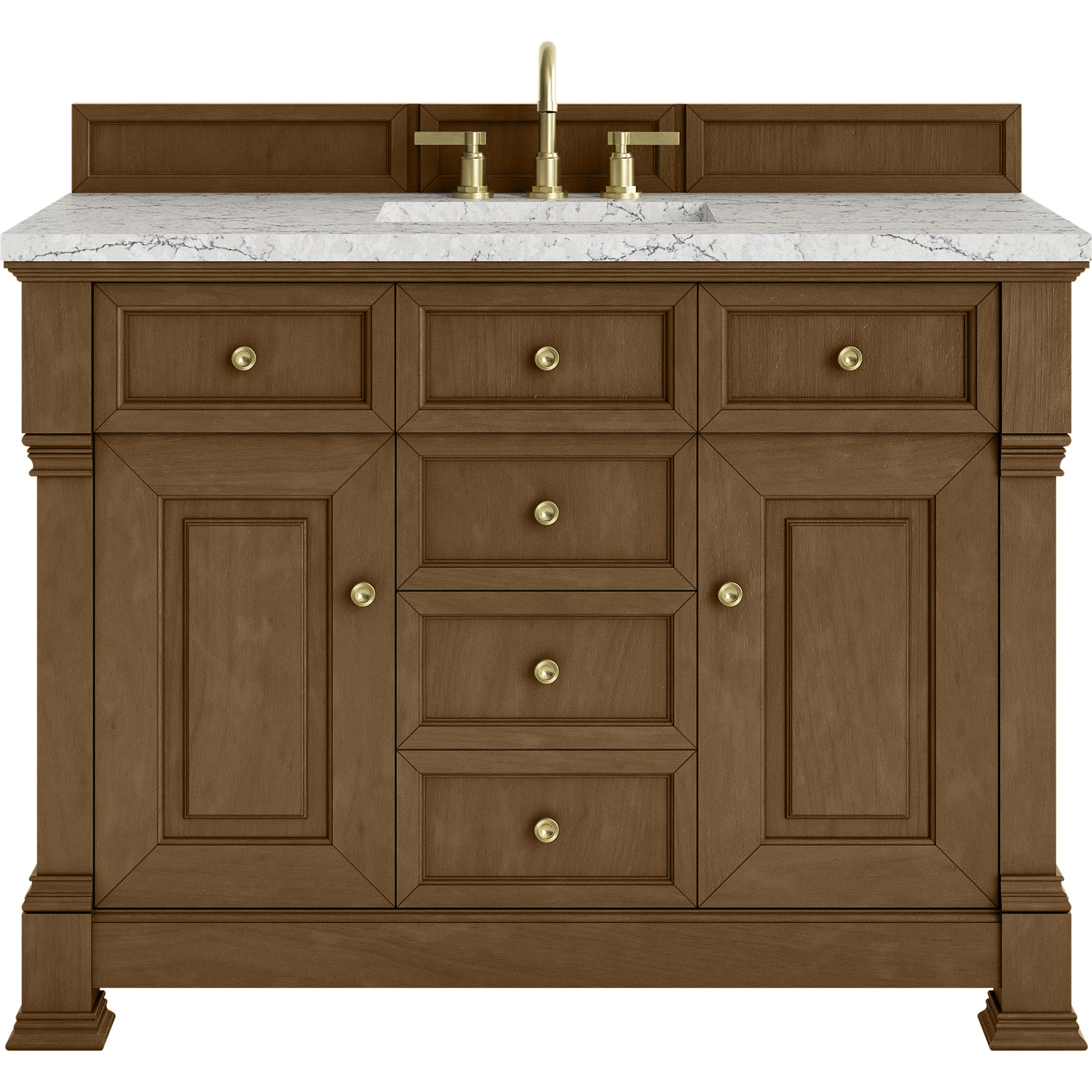 The Brookfield 48" Single Vanity in Honey Oak by James Martin Vanities offers a blend of traditional elegance and contemporary sophistication. The raised panel picture frame doors and detailed corner molding reflect timeless craftsmanship, while the warm Honey Oak vanity finish and Champagne Brass hardware lend a fresh, modern appeal. This beautifully crafted piece features two single-door cabinets that open to interior shelves, three standard drawers and one double height drawer for ample storage. The warm wood tones highlight the natural Oak wood grains, lending sophistication and charm to your space. The addition of an Eternal Jasmine Pearl Silestone® top with undermount sink completes the look. This unit is enabled with FreePower wireless charging; featuring a single-device charger seamlessly embedded into the countertop, indicated by a light-up halo to the left of the sink. Designed for modern living, FreePower offers convenient, integrated, wireless charging when and where you need it.Two single door cabinets that open to interior shelves; three standard drawers and one double height drawerDrawer boxes feature English Dovetail joinery with premium, soft-close undermount drawer slides; doors feature soft-close, adjustable door hingesCabinet features a multi-stage premium finish coat to offer UV and moisture resistanceHoney Oak finish with Champagne Brass hardwareCountertop is pre-drilled for an 8" widespread faucet; our 3cm eased edge countertops come with white porcelain rectangular sink(s) that ship separately and include mounting brackets for easy installationFaucet sold separatelyDrawers lined with our signature brushed aluminum laminate for easy cleaningFreestanding VanityMatching wood backsplash includedMatching stone backsplash available as add-on purchaseFreePower Wireless Charging; single-device unit left of sinkInspired by statement heirloom pieces, the Brookfield Collection has a fresh new look! Featuring raised panel doors and corner molding, we've updated Brookfield's traditional design to feel more contemporary. Available in three beautiful finishes, this collection offers a functional storage solution with a sophisticated, hand-crafted appeal.1 year warranty against manufacturer's defects. We will repair or replace any defective product, if the product is defective in material or workmanship at our discretion. No warranty is expressed or implied regarding damages resulting from consumer misuse.