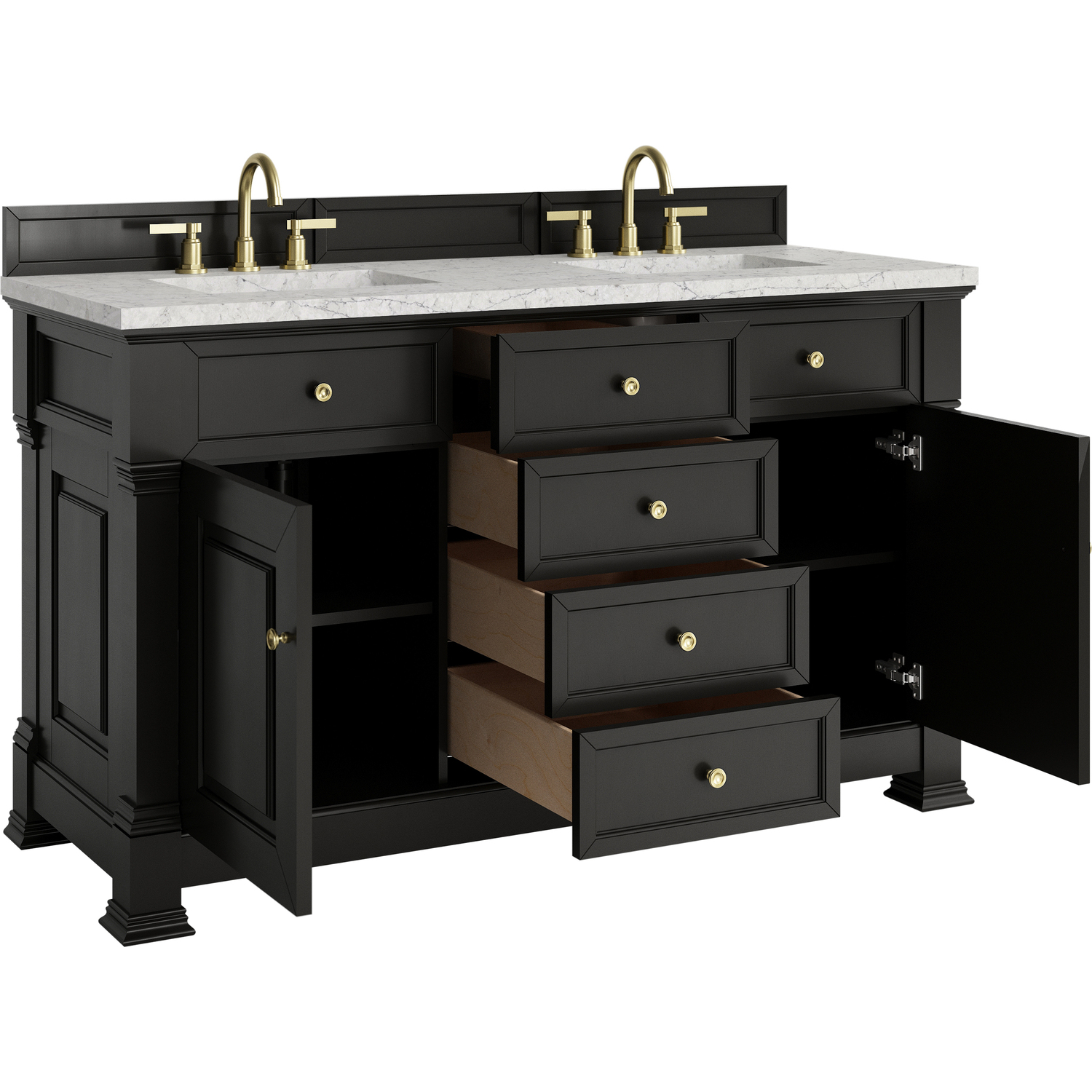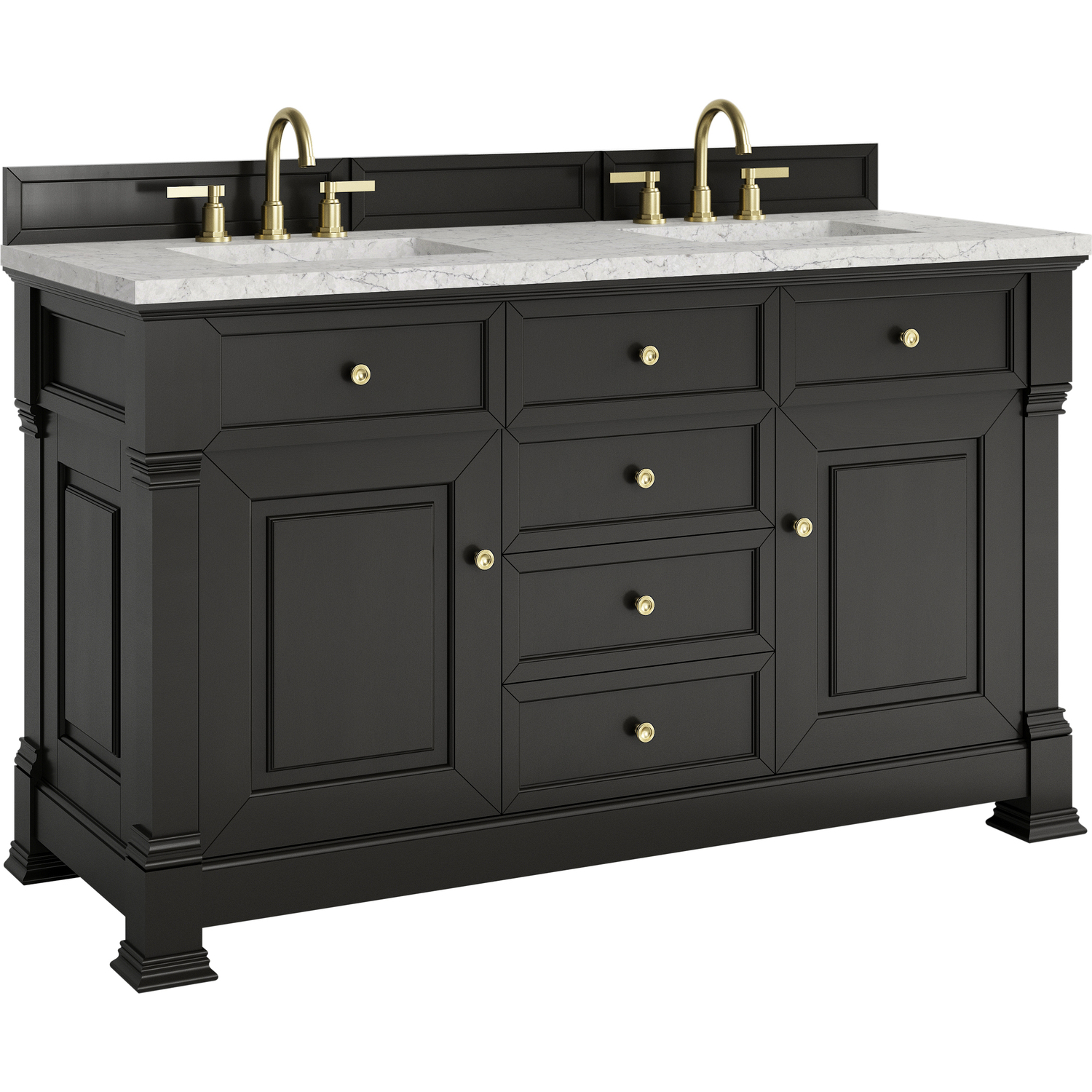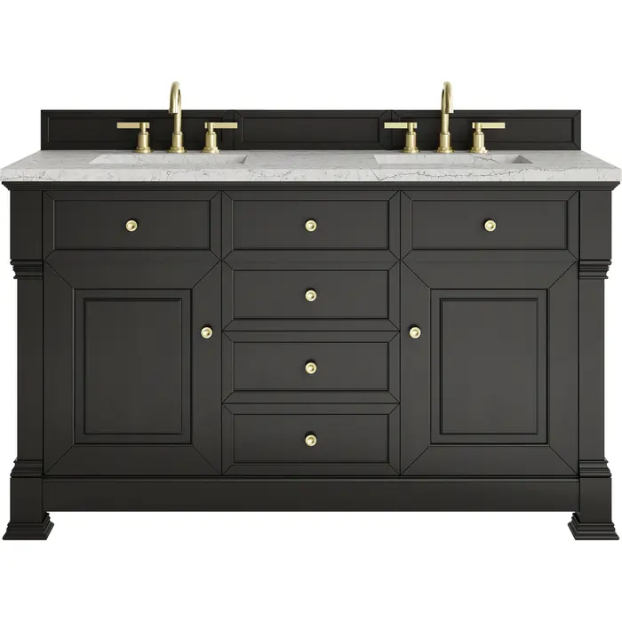 The Brookfield 60" Double Vanity in Black Onyx by James Martin Vanities offers a blend of traditional elegance and contemporary sophistication. The raised panel picture frame doors and detailed corner molding reflect timeless craftsmanship, while the rich Black Onyx finish and Champagne Brass hardware lend a fresh, modern appeal. This beautifully crafted vanity features two single door cabinets that open to interior shelves, along with four standard drawers for ample storage. The timeless Black Onyx finish lends sophistication and charm to your space. The addition of an Eternal Jasmine Pearl Silestone® top with undermount sinks completes the look.Two single door cabinets that open to interior shelves; four standard drawersDrawer boxes feature English Dovetail joinery with premium, soft-close undermount drawer slides; doors feature soft-close, adjustable door hingesCabinet features a multi-stage premium finish coat to offer UV and moisture resistanceBlack Onyx finish with Champagne Brass hardwareCountertop is pre-drilled for 8" widespread faucets; our 3cm eased edge countertops come with white porcelain sinks that ship separately and include mounting brackets for easy installationDrawers lined with our signature brushed aluminum laminate for easy cleaningFreestanding VanityMatching wood backsplash includedFaucet sold separatelyInspired by statement heirloom pieces, the Brookfield Collection has a fresh new look! Featuring raised panel doors and corner molding, we've updated Brookfield's traditional design to feel more contemporary. Available in three beautiful finishes, this collection offers a functional storage solution with a sophisticated, hand-crafted appeal.1 year warranty against manufacturer's defects. We will repair or replace any defective product, if the product is defective in material or workmanship at our discretion. No warranty is expressed or implied regarding damages resulting from consumer misuse.