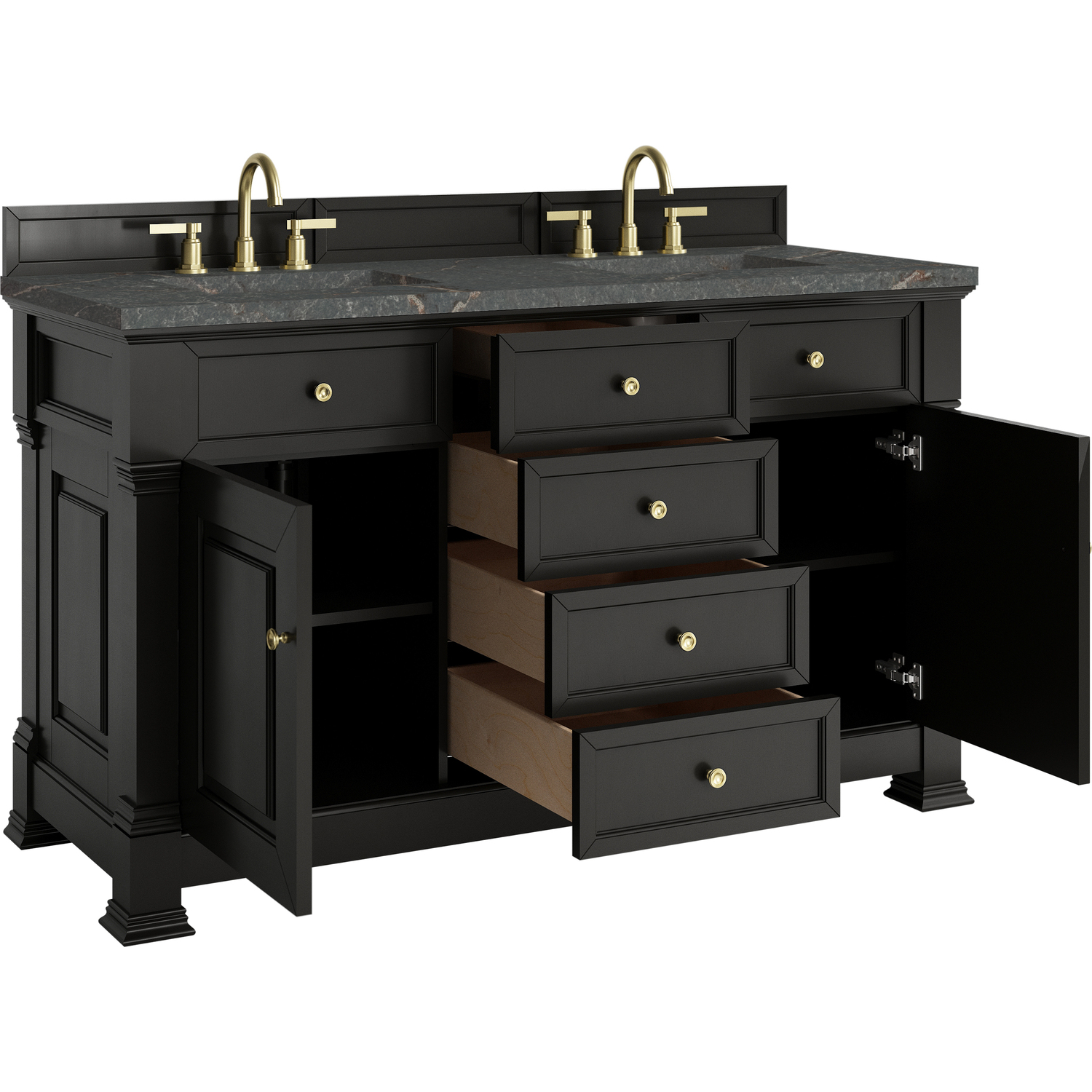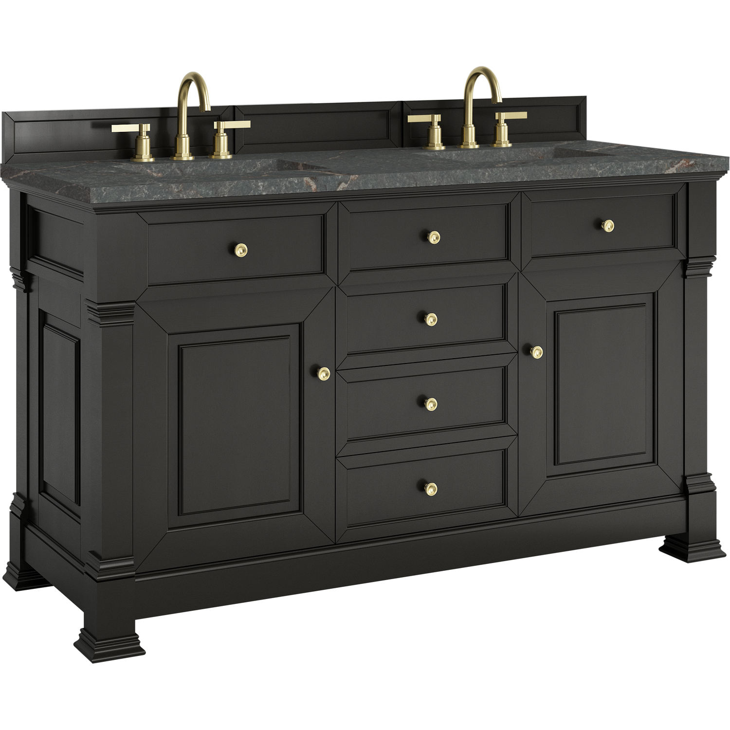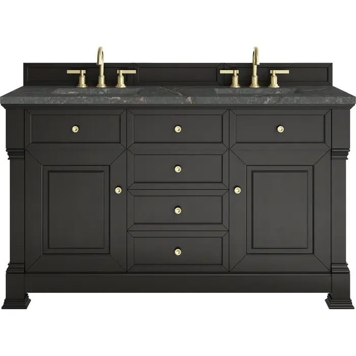 The Brookfield 60" Double Vanity in Black Onyx by James Martin Vanities offers a blend of traditional elegance and contemporary sophistication. The raised panel picture frame doors and detailed corner molding reflect timeless craftsmanship, while the rich Black Onyx finish and Champagne Brass hardware lend a fresh, modern appeal. This beautifully crafted vanity features two single door cabinets that open to interior shelves, along with four standard drawers for ample storage. The timeless Black Onyx finish lends sophistication and charm to your space. The addition of a Parisien Bleu Silestone® top and undermount sinks completes the look.Two single door cabinets that open to interior shelves; four standard drawersDrawer boxes feature English Dovetail joinery with premium, soft-close undermount drawer slides; doors feature soft-close, adjustable door hingesCabinet features a multi-stage premium finish coat to offer UV and moisture resistanceBlack Onyx finish with Champagne Brass hardwareCountertop is pre-drilled for 8" widespread faucets; our 3cm eased edge countertops come with white porcelain sinks that ship separately and include mounting brackets for easy installationDrawers lined with our signature brushed aluminum laminate for easy cleaningFreestanding VanityMatching wood backsplash includedFaucet sold separatelyInspired by statement heirloom pieces, the Brookfield Collection has a fresh new look! Featuring raised panel doors and corner molding, we've updated Brookfield's traditional design to feel more contemporary. Available in three beautiful finishes, this collection offers a functional storage solution with a sophisticated, hand-crafted appeal.1 year warranty against manufacturer's defects. We will repair or replace any defective product, if the product is defective in material or workmanship at our discretion. No warranty is expressed or implied regarding damages resulting from consumer misuse.