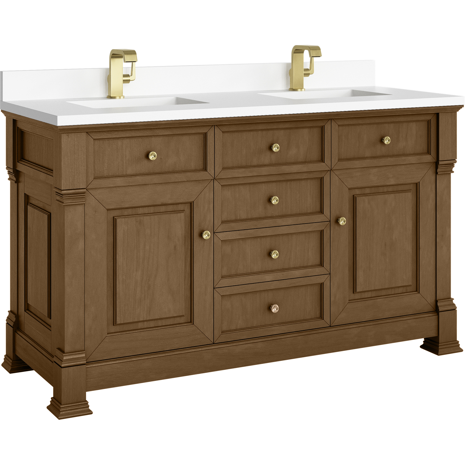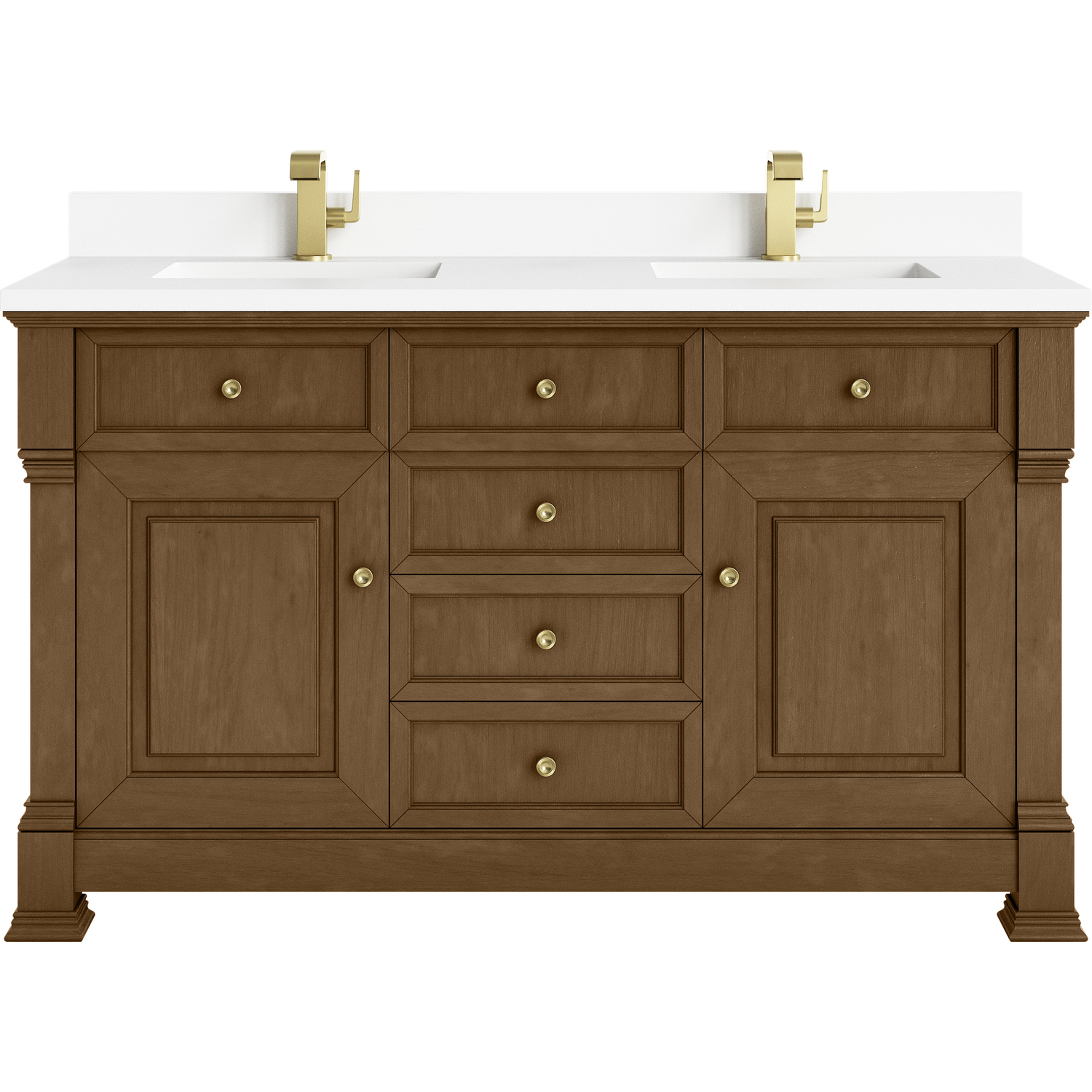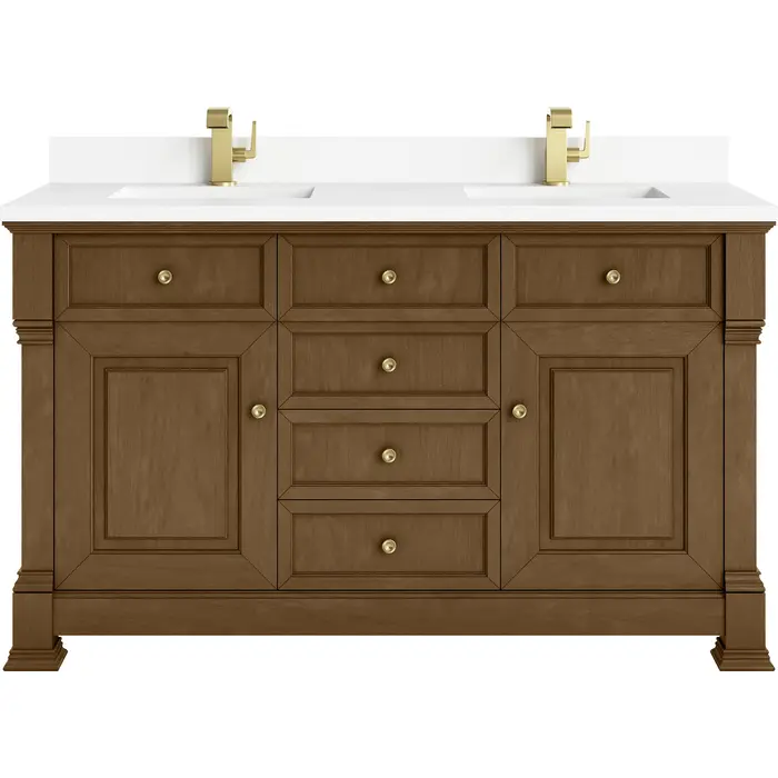 The Brookfield 60" Double Vanity in Honey Oak by James Martin Vanities offers a blend of traditional elegance and contemporary sophistication. The raised panel picture frame doors and detailed corner molding reflect timeless craftsmanship, while the warm Honey Oak finish and Champagne Brass hardware lend a fresh, modern appeal. This beautifully crafted vanity features two single door cabinets that open to interior shelves, along with four standard drawers for ample storage. The warm wood tones highlight the natural Oak wood grains, lending sophistication and charm to your space. The vanity is completed by a classic White Zeus Silestone® top and backsplash with undermount sinks.Two single door cabinets that open to interior shelves; four standard drawersDrawer boxes feature English Dovetail joinery with premium, soft-close undermount drawer slides; doors feature soft-close, adjustable door hingesCabinet features a multi-stage premium finish coat to offer UV and moisture resistanceHoney Oak finish with Champagne Brass hardwareWhite Zeus Silestone® top with backsplash is pre-drilled for single-hole faucets; our 3cm eased edge countertop comes with white porcelain undermount sinks that ship separately and include mounting brackets for easy installationDrawers lined with our signature brushed aluminum laminate for easy cleaningFreestanding VanityMatching wood backsplash includedFaucet sold separatelyInspired by statement heirloom pieces, the Brookfield Collection has a fresh new look! Featuring raised panel doors and corner molding, we've updated Brookfield's traditional design to feel more contemporary. Available in three beautiful finishes, this collection offers a functional storage solution with a sophisticated, hand-crafted appeal.1 year warranty against manufacturer's defects. We will repair or replace any defective product, if the product is defective in material or workmanship at our discretion. No warranty is expressed or implied regarding damages resulting from consumer misuse.