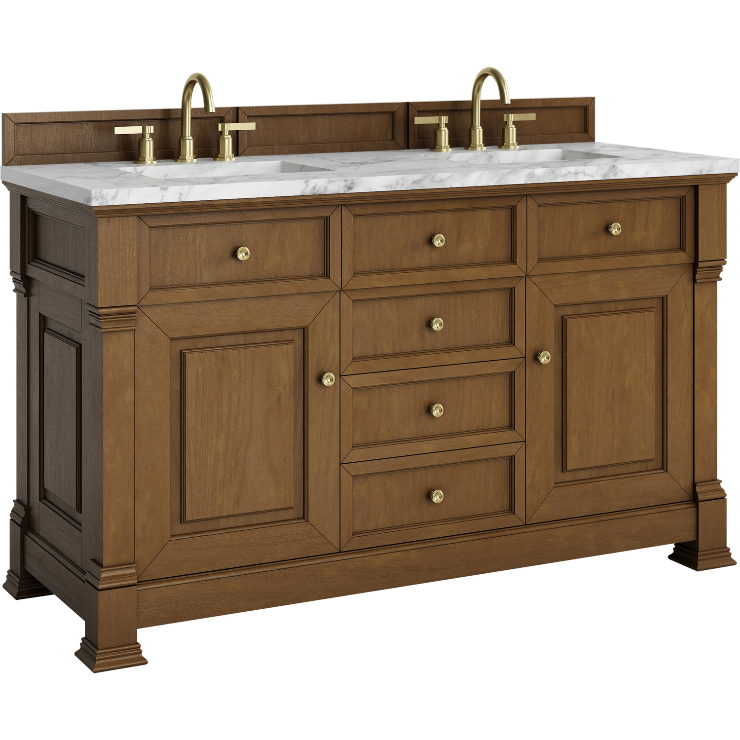 The Brookfield 60" Double Vanity in Honey Oak by James Martin Vanities offers a blend of traditional elegance and contemporary sophistication. The raised panel picture frame doors and detailed corner molding reflect timeless craftsmanship, while the warm Honey Oak finish and Champagne Brass hardware lend a fresh, modern appeal. This beautifully crafted vanity features two single door cabinets that open to interior shelves, along with four standard drawers for ample storage. The warm wood tones highlight the natural Oak wood grains, lending sophistication and charm to your space. The look is completed by a classic Carrara Marble top with white porcelain undermount sinks.Two single door cabinets that open to interior shelves; four standard drawersDrawer boxes feature English Dovetail joinery with premium, soft-close undermount drawer slides; doors feature soft-close, adjustable door hingesCabinet features a multi-stage premium finish coat to offer UV and moisture resistanceHoney Oak finish with Champagne Brass hardwareCountertop is pre-drilled for 8" widespread faucets; our 3cm eased edge countertops come with white porcelain sinks that ship separately and include mounting brackets for easy installationDrawers lined with our signature brushed aluminum laminate for easy cleaningFreestanding VanityMatching wood backsplash includedFaucet sold separatelyInspired by statement heirloom pieces, the Brookfield Collection has a fresh new look! Featuring raised panel doors and corner molding, we've updated Brookfield's traditional design to feel more contemporary. Available in three beautiful finishes, this collection offers a functional storage solution with a sophisticated, hand-crafted appeal.1 year warranty against manufacturer's defects. We will repair or replace any defective product, if the product is defective in material or workmanship at our discretion. No warranty is expressed or implied regarding damages resulting from consumer misuse.