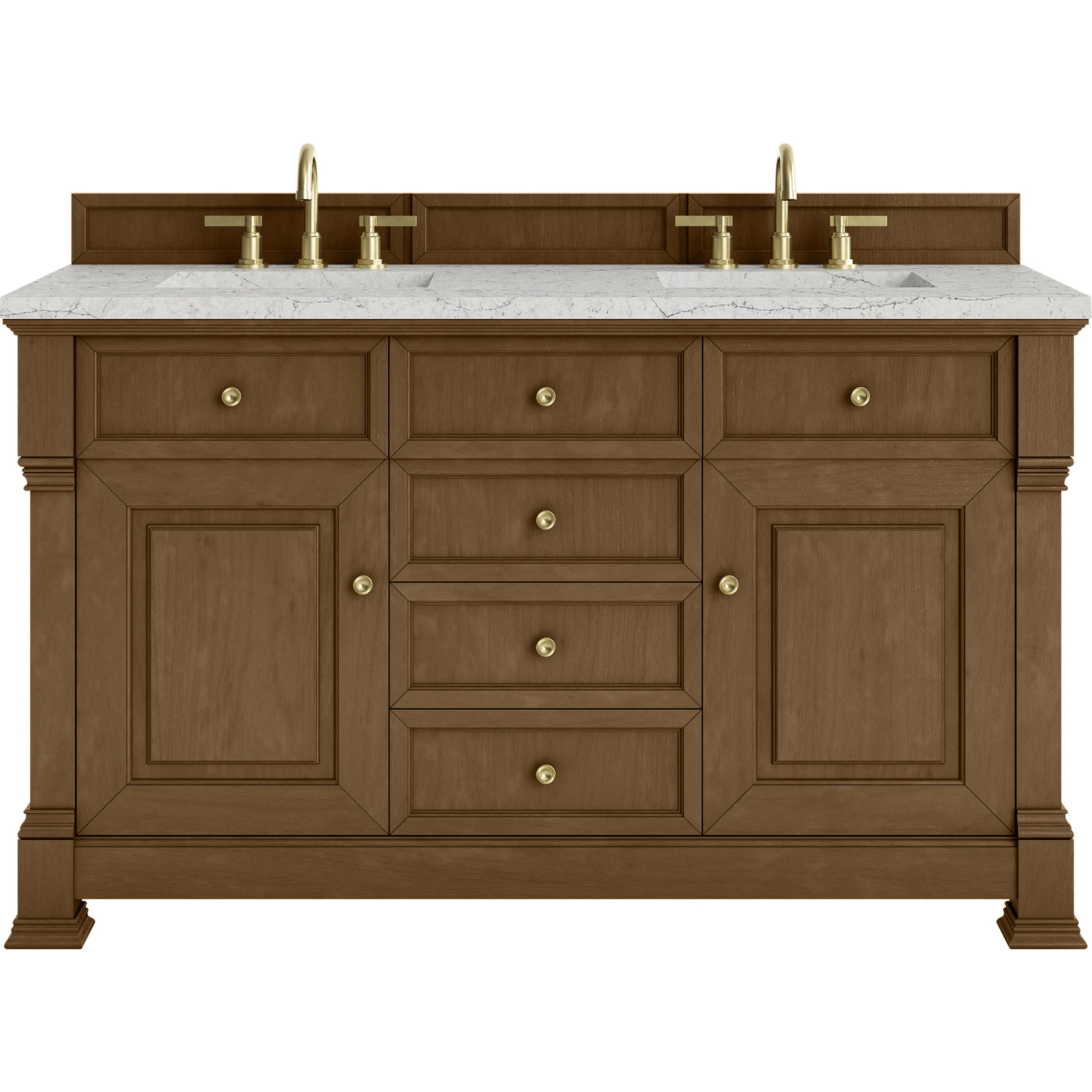 The Brookfield 60" Double Vanity in Honey Oak by James Martin Vanities offers a blend of traditional elegance and contemporary sophistication. The raised panel picture frame doors and detailed corner molding reflect timeless craftsmanship, while the warm Honey Oak finish and Champagne Brass hardware lend a fresh, modern appeal. This beautifully crafted vanity features two single-door cabinets that open to interior shelves, along with four standard drawers for ample storage. The warm wood tones highlight the natural Oak wood grains, lending sophistication and charm to your space. The addition of an Eternal Jasmine Pearl Silestone® top with undermount sinks completes the look. This unit is enabled with FreePower wireless charging; featuring a single-device charger seamlessly embedded into the countertop, indicated by a light-up halo in between the sinks. Designed for modern living, FreePower offers convenient, integrated, wireless charging when and where you need it.FreePower Wireless Charging; single-device unit in between sinksTwo single-door cabinets that open to interior shelves; four standard full-extension drawersDrawer boxes feature English Dovetail joinery with premium, soft-close undermount drawer slides; doors feature soft-close, adjustable door hingesCabinet features a multi-stage premium finish coat to offer UV and moisture resistanceHoney Oak finish with Champagne Brass hardwareCountertop is pre-drilled for 8" widespread faucet(s); our 3cm eased edge countertops come with white porcelain rectangular sink(s) that ship separately and include mounting brackets for easy installationFaucet(s) sold separatelyDrawers lined with our signature brushed aluminum laminate for easy cleaningFreestanding VanityComes with optional, coordinating wood backsplash; matching stone backsplash available as add-on purchaseInspired by statement heirloom pieces, the Brookfield Collection has a fresh new look! Featuring raised panel doors and corner molding, we've updated Brookfield's traditional design to feel more contemporary. Available in three beautiful finishes, this collection offers a functional storage solution with a sophisticated, hand-crafted appeal.1 year warranty against manufacturer's defects. We will repair or replace any defective product, if the product is defective in material or workmanship at our discretion. No warranty is expressed or implied regarding damages resulting from consumer misuse.