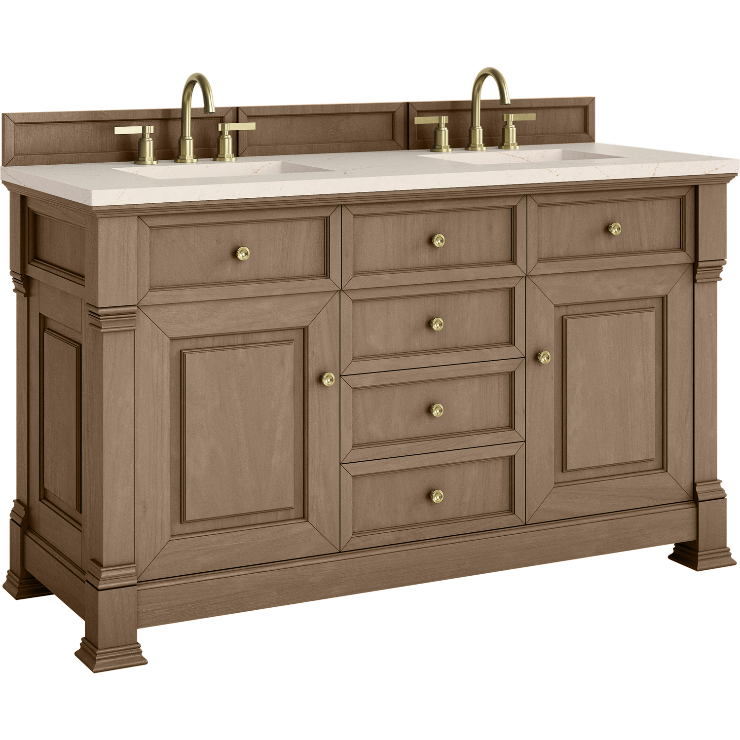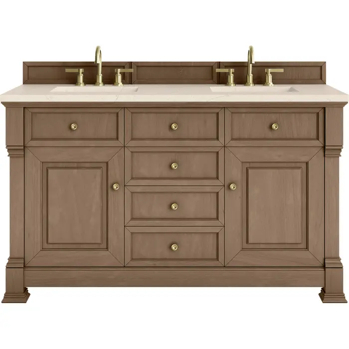 The Brookfield 60" Double Vanity in Pecan by James Martin Vanities offers a blend of traditional elegance and contemporary sophistication. The raised panel picture frame doors and detailed corner molding reflect timeless craftsmanship, while the Pecan finish and Champagne Brass hardware lend a fresh, modern appeal. This beautifully crafted vanity features two single door cabinets that open to interior shelves, along with four standard drawers for ample storage. The cool wood tones highlight the natural Oak wood grains, lending sophistication and charm to your space. The addition of an Eternal Marfil Silestone® top with undermount sinks completes the look.Two single door cabinets that open to interior shelves; four standard drawersDrawer boxes feature English Dovetail joinery with premium, soft-close undermount drawer slides; doors feature soft-close, adjustable door hingesCabinet features a multi-stage premium finish coat to offer UV and moisture resistancePecan finish with Champagne Brass hardwareCountertop is pre-drilled for 8" widespread faucets; our 3cm eased edge countertops come with white porcelain sinks that ship separately and include mounting brackets for easy installationDrawers lined with our signature brushed aluminum laminate for easy cleaningFreestanding VanityMatching wood backsplash includedFaucet sold separatelyInspired by statement heirloom pieces, the Brookfield Collection has a fresh new look! Featuring raised panel doors and corner molding, we've updated Brookfield's traditional design to feel more contemporary. Available in three beautiful finishes, this collection offers a functional storage solution with a sophisticated, hand-crafted appeal.1 year warranty against manufacturer's defects. We will repair or replace any defective product, if the product is defective in material or workmanship at our discretion. No warranty is expressed or implied regarding damages resulting from consumer misuse.