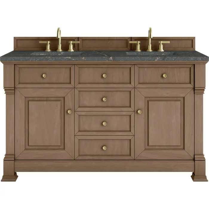 The Brookfield 60" Double Vanity in Pecan by James Martin Vanities offers a blend of traditional elegance and contemporary sophistication. The raised panel picture frame doors and detailed corner molding reflect timeless craftsmanship, while the Pecan finish and Champagne Brass hardware lend a fresh, modern appeal. This beautifully crafted vanity features two single-door cabinets that open to interior shelves, along with four standard drawers for ample storage. The cool wood tones highlight the natural Oak wood grains, lending sophistication and charm to your space. The addition of a Parisien Bleu Silestone® top featuring copper veining and an undermount sinks completes the look. This unit is enabled with FreePower wireless charging; featuring a single-device charger seamlessly embedded into the countertop, indicated by a light-up halo in between the sinks. Designed for modern living, FreePower offers convenient, integrated, wireless charging when and where you need it.FreePower Wireless Charging; single-device unit in between sinksTwo single-door cabinets that open to interior shelves; four standard full-extension drawersDrawer boxes feature English Dovetail joinery with premium, soft-close undermount drawer slides; doors feature soft-close, adjustable door hingesCabinet features a multi-stage premium finish coat to offer UV and moisture resistancePecan finish with Champagne Brass hardwareCountertop is pre-drilled for 8" widespread faucet(s); our 3cm eased edge countertops come with white porcelain rectangular sink(s) that ship separately and include mounting brackets for easy installationFaucet(s) sold separatelyDrawers lined with our signature brushed aluminum laminate for easy cleaningFreestanding VanityComes with optional, coordinating wood backsplash; matching stone backsplash available as add-on purchaseInspired by statement heirloom pieces, the Brookfield Collection has a fresh new look! Featuring raised panel doors and corner molding, we've updated Brookfield's traditional design to feel more contemporary. Available in three beautiful finishes, this collection offers a functional storage solution with a sophisticated, hand-crafted appeal.1 year warranty against manufacturer's defects. We will repair or replace any defective product, if the product is defective in material or workmanship at our discretion. No warranty is expressed or implied regarding damages resulting from consumer misuse.