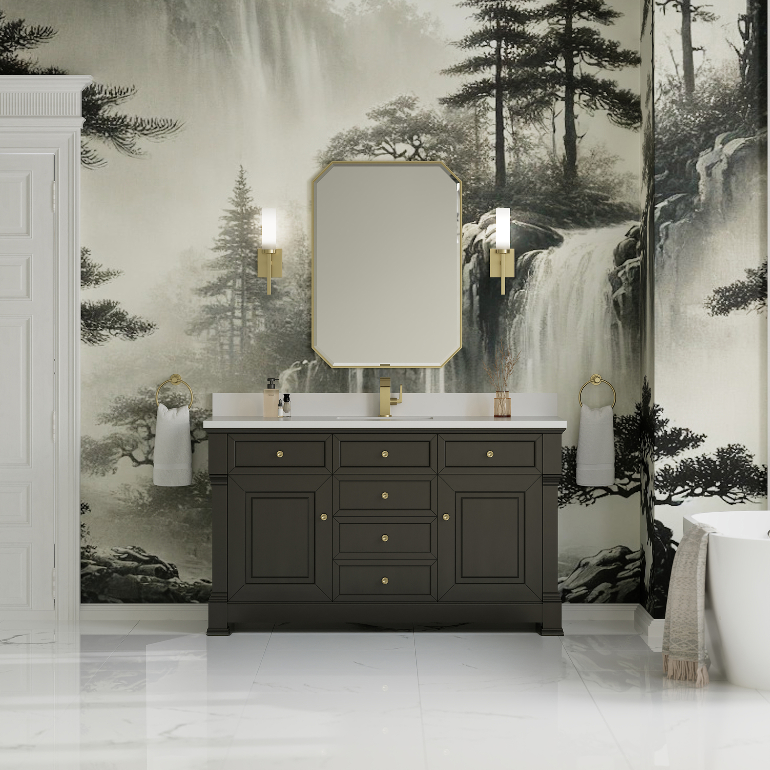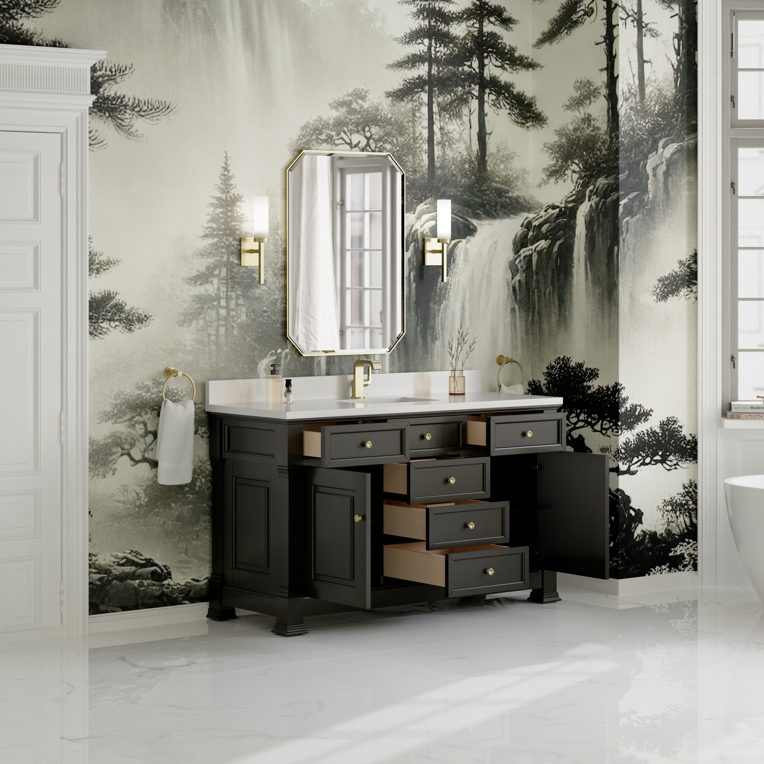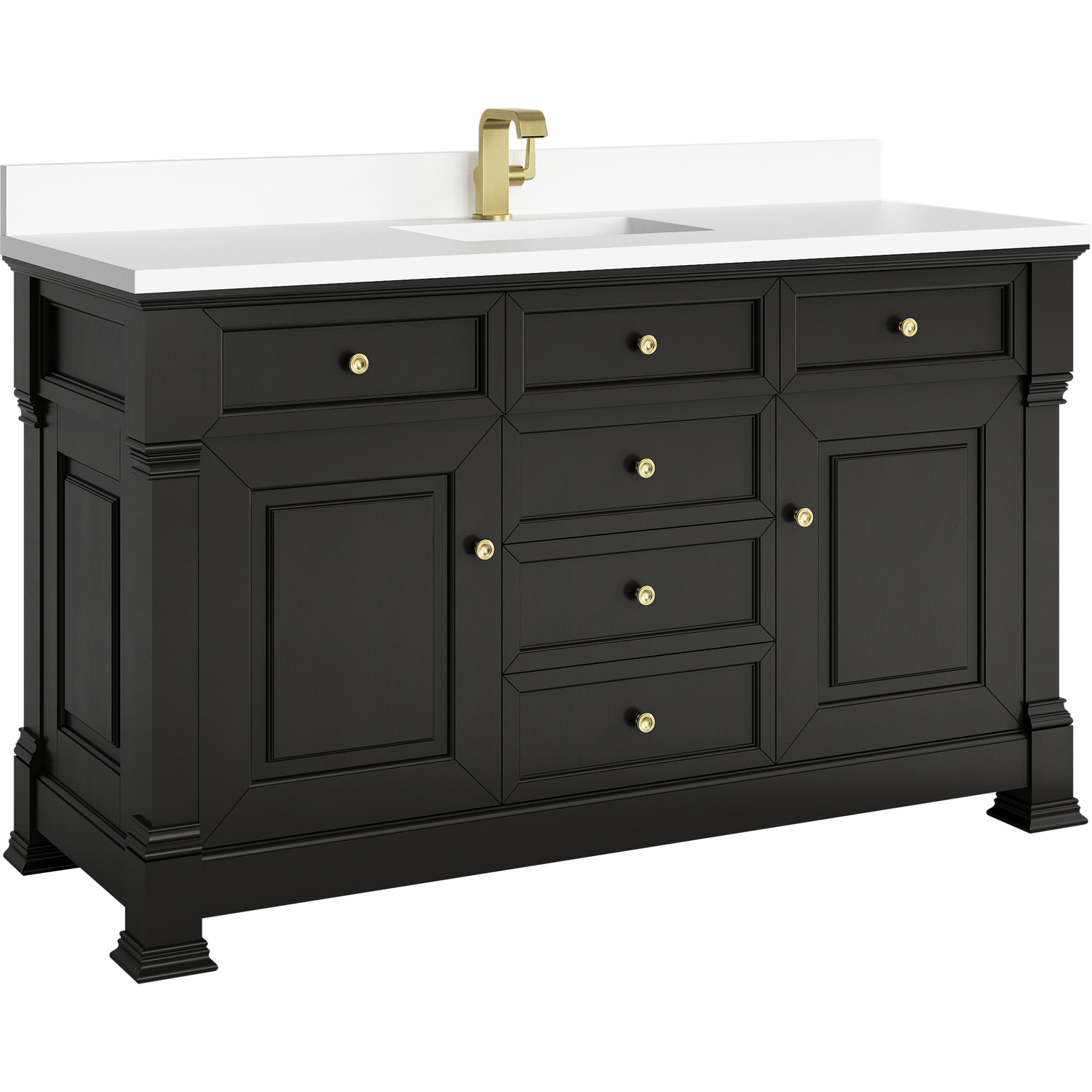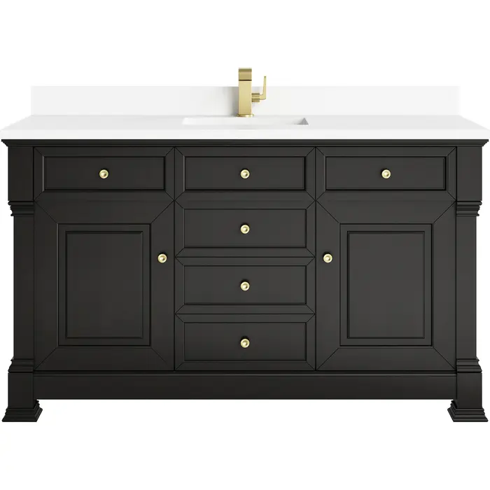 The Brookfield 60" Single Vanity in Black Onyx by James Martin Vanities offers a blend of traditional elegance and contemporary sophistication. The raised panel picture frame doors and detailed corner molding reflect timeless craftsmanship, while the rich Black Onyx finish and Champagne Brass hardware lend a fresh, modern appeal. This beautifully crafted vanity features two single door cabinets that open to interior shelves, along with five standard drawers for ample storage. The timeless Black Onyx finish lends sophistication and charm to your space. The vanity is completed by a classic White Zeus Silestone® top and backsplash with undermount sink.Two single door cabinets that open to interior shelves; five standard drawersDrawer boxes feature English Dovetail joinery with premium, soft-close undermount drawer slides; doors feature soft-close, adjustable door hingesCabinet features a multi-stage premium finish coat to offer UV and moisture resistanceBlack Onyx finish with Champagne Brass hardwareWhite Zeus Silestone® top with backsplash is pre-drilled for single-hole faucet; our 3cm eased edge countertop comes with a white porcelain undermount sink that ships separately and includes mounting brackets for easy installationDrawers lined with our signature brushed aluminum laminate for easy cleaningFreestanding VanityMatching wood backsplash includedFaucet sold separatelyInspired by statement heirloom pieces, the Brookfield Collection has a fresh new look! Featuring raised panel doors and corner molding, we've updated Brookfield's traditional design to feel more contemporary. Available in three beautiful finishes, this collection offers a functional storage solution with a sophisticated, hand-crafted appeal.1 year warranty against manufacturer's defects. We will repair or replace any defective product, if the product is defective in material or workmanship at our discretion. No warranty is expressed or implied regarding damages resulting from consumer misuse.