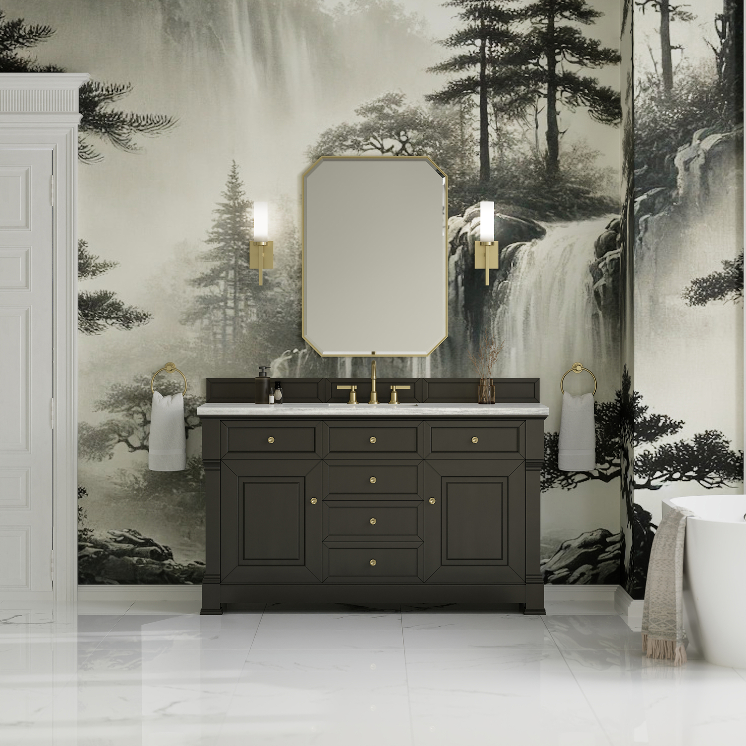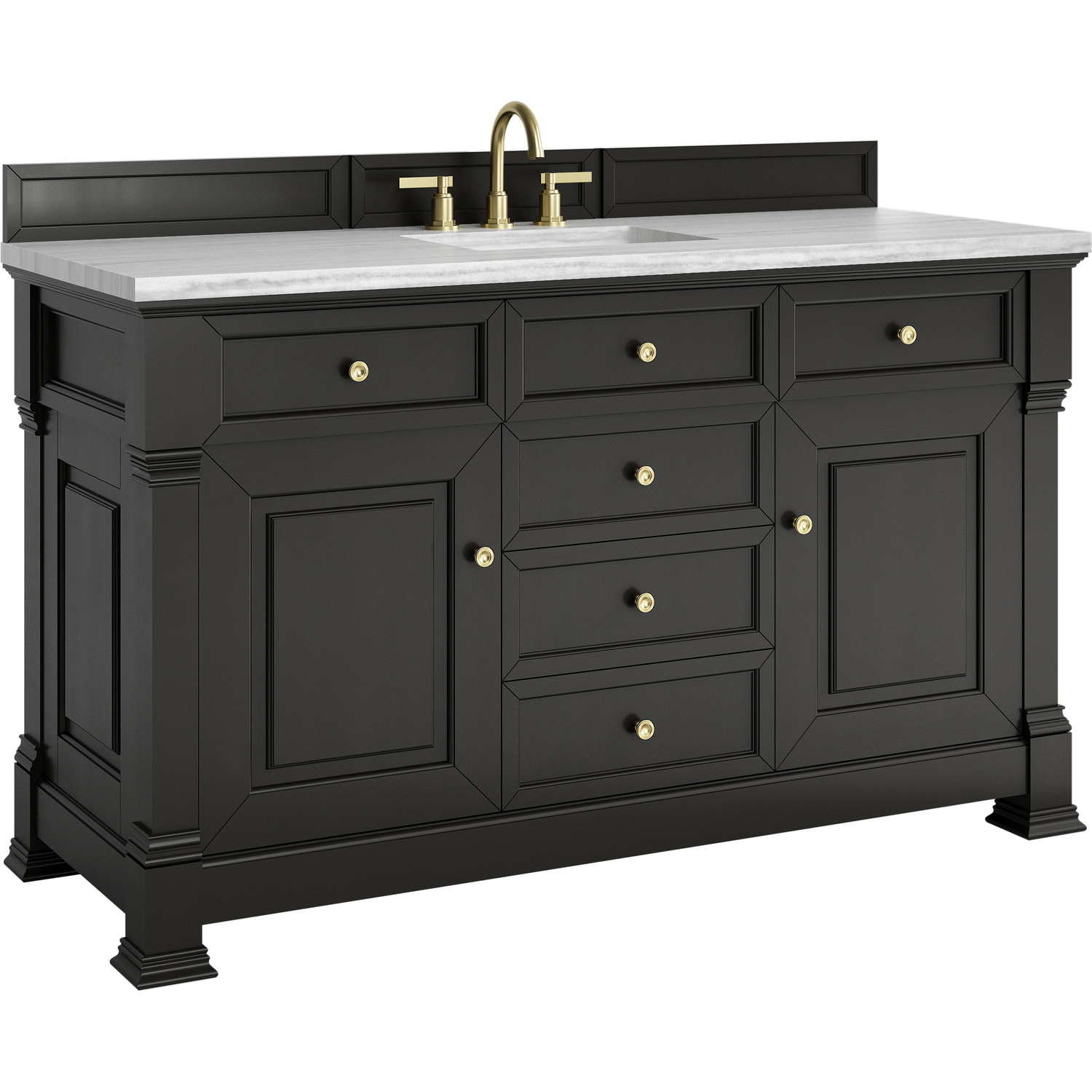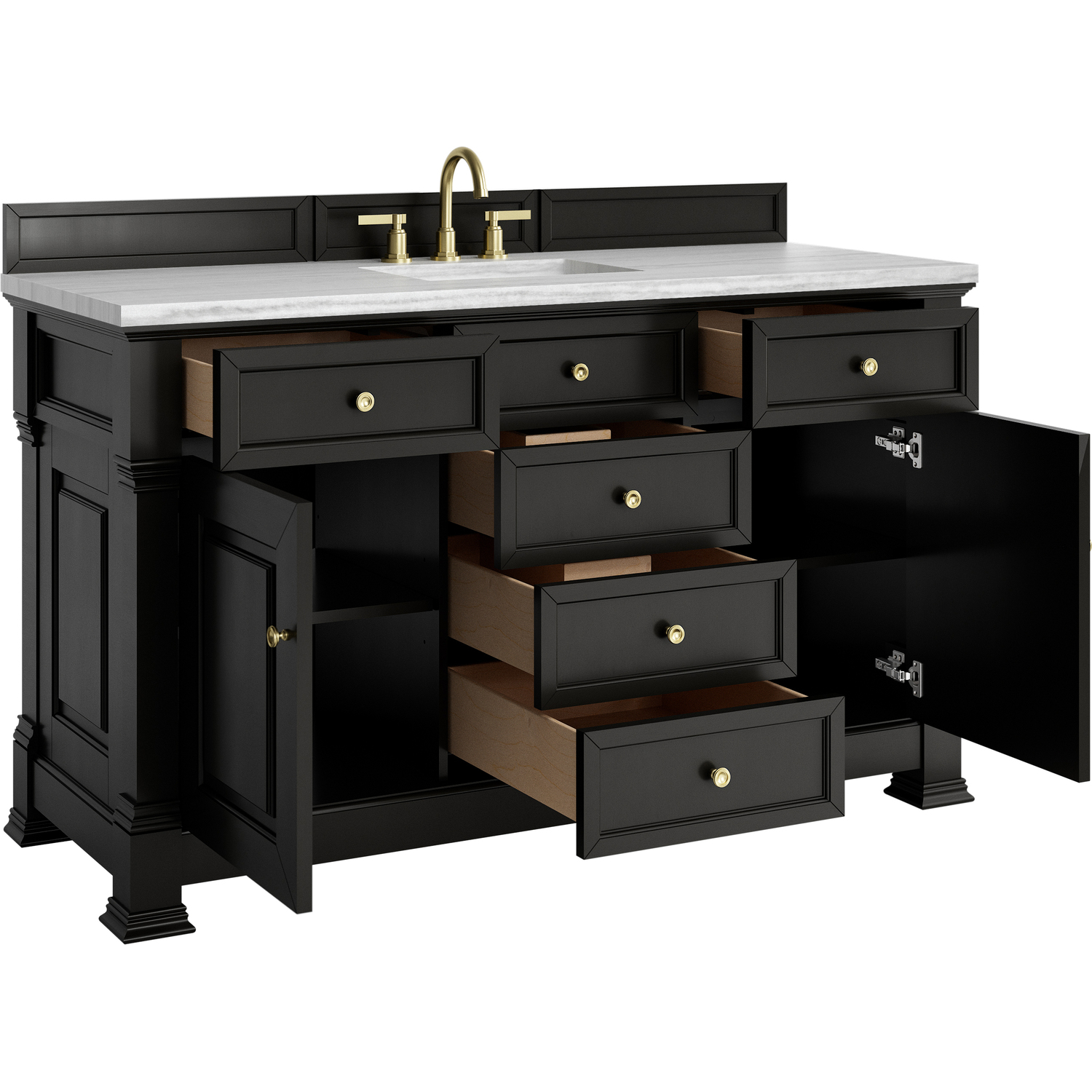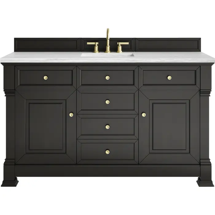 The Brookfield 60" Single Vanity in Black Onyx by James Martin Vanities offers a blend of traditional elegance and contemporary sophistication. The raised panel picture frame doors and detailed corner molding reflect timeless craftsmanship, while the rich Black Onyx finish and Champagne Brass hardware lend a fresh, modern appeal. This beautifully crafted vanity features two single door cabinets that open to interior shelves, along with five standard drawers for ample storage. The timeless Black Onyx finish lends sophistication and charm to your space, while the addition of an Arctic Fall Solid Surface top with white porcelain undermount sink completes the look.Two single door cabinets that open to interior shelves; five standard drawersDrawer boxes feature English Dovetail joinery with premium, soft-close undermount drawer slides; doors feature soft-close, adjustable door hingesCabinet features a multi-stage premium finish coat to offer UV and moisture resistanceBlack Onyx finish with Champagne Brass hardwareCountertop is pre-drilled for an 8" widespread faucet; our 3cm eased edge countertop comes with a white porcelain sink that ships separately and includes mounting brackets for easy installationDrawers lined with our signature brushed aluminum laminate for easy cleaningFreestanding VanityMatching wood backsplash includedFaucet sold separatelyInspired by statement heirloom pieces, the Brookfield Collection has a fresh new look! Featuring raised panel doors and corner molding, we've updated Brookfield's traditional design to feel more contemporary. Available in three beautiful finishes, this collection offers a functional storage solution with a sophisticated, hand-crafted appeal.1 year warranty against manufacturer's defects. We will repair or replace any defective product, if the product is defective in material or workmanship at our discretion. No warranty is expressed or implied regarding damages resulting from consumer misuse.
