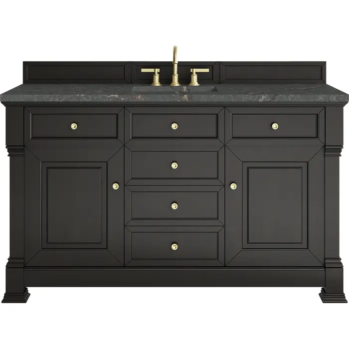 The Brookfield 60" Single Vanity in Black Onyx by James Martin Vanities offers a blend of traditional elegance and contemporary sophistication. The raised panel picture frame doors and detailed corner molding reflect timeless craftsmanship, while the rich Black Onyx finish and Champagne Brass hardware lend a fresh, modern appeal. This beautifully crafted vanity features two single-door cabinets that open to interior shelves, along with five standard drawers for ample storage. The timeless Black Onyx finish lends sophistication and charm to your space. The addition of a Parisien Bleu Silestone® top and undermount sink completes the look. This unit is enabled with FreePower wireless charging; featuring a single-device charger seamlessly embedded into the countertop, indicated by a light-up halo to the left of the sink. Designed for modern living, FreePower offers convenient, integrated, wireless charging when and where you need it.Two single-door cabinets that open to interior shelves; five standard drawersDrawer boxes feature English Dovetail joinery with premium, soft-close undermount drawer slides; doors feature soft-close, adjustable door hingesCabinet features a multi-stage premium finish coat to offer UV and moisture resistanceBlack Onyx finish with Champagne Brass hardwareCountertop is pre-drilled for an 8" widespread faucet; our 3cm eased edge countertops come with white porcelain rectangular sink(s) that ship separately and include mounting brackets for easy installationFaucet sold separatelyDrawers lined with our signature brushed aluminum laminate for easy cleaningFreestanding VanityMatching wood backsplash includedMatching stone backsplash available as add-on purchaseFreePower Wireless Charging; single-device unit left of sinkInspired by statement heirloom pieces, the Brookfield Collection has a fresh new look! Featuring raised panel doors and corner molding, we've updated Brookfield's traditional design to feel more contemporary. Available in three beautiful finishes, this collection offers a functional storage solution with a sophisticated, hand-crafted appeal.1 year warranty against manufacturer's defects. We will repair or replace any defective product, if the product is defective in material or workmanship at our discretion. No warranty is expressed or implied regarding damages resulting from consumer misuse.