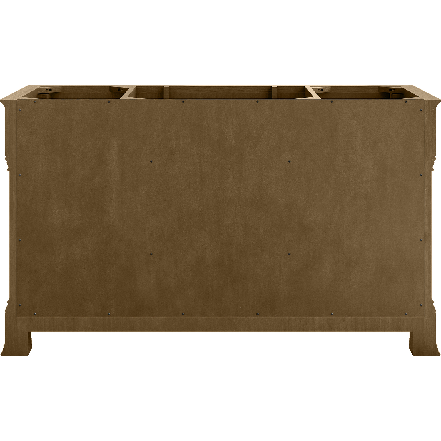 The Brookfield 60" Single Vanity in Honey Oak by James Martin Vanities offers a blend of traditional elegance and contemporary sophistication. The raised panel picture frame doors and detailed corner molding reflect timeless craftsmanship, while the warm Honey Oak finish and Champagne Brass hardware lend a fresh, modern appeal. This beautifully crafted vanity features two single door cabinets that open to interior shelves, along with five standard drawers for ample storage. The warm wood tones highlight the natural Oak wood grains, lending sophistication and charm to your space. The addition of an Eternal Jasmine Pearl Silestone® top with undermount sink completes the look.Two single door cabinets that open to interior shelves; five standard drawersDrawer boxes feature English Dovetail joinery with premium, soft-close undermount drawer slides; doors feature soft-close, adjustable door hingesCabinet features a multi-stage premium finish coat to offer UV and moisture resistanceHoney Oak finish with Champagne Brass hardwareCountertop is pre-drilled for an 8" widespread faucet; our 3cm eased edge countertop comes with a white porcelain sink that ships separately and includes mounting brackets for easy installationDrawers lined with our signature brushed aluminum laminate for easy cleaningFreestanding VanityMatching wood backsplash includedFaucet sold separatelyInspired by statement heirloom pieces, the Brookfield Collection has a fresh new look! Featuring raised panel doors and corner molding, we've updated Brookfield's traditional design to feel more contemporary. Available in three beautiful finishes, this collection offers a functional storage solution with a sophisticated, hand-crafted appeal.1 year warranty against manufacturer's defects. We will repair or replace any defective product, if the product is defective in material or workmanship at our discretion. No warranty is expressed or implied regarding damages resulting from consumer misuse.