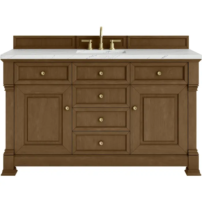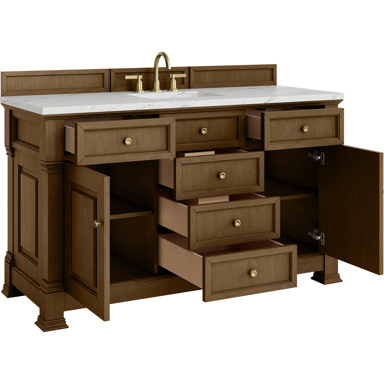 The Brookfield 60" Single Vanity in Honey Oak by James Martin Vanities offers a blend of traditional elegance and contemporary sophistication. The raised panel picture frame doors and detailed corner molding reflect timeless craftsmanship, while the warm Honey Oak finish and Champagne Brass hardware lend a fresh, modern appeal. This beautifully crafted vanity features two single door cabinets that open to interior shelves, along with five standard drawers for ample storage. The warm wood tones highlight the natural Oak wood grains, lending sophistication and charm to your space. The addition of an Ethereal Noctis Silestone® top with undermount sink completes the look.Two single door cabinets that open to interior shelves; five standard drawersDrawer boxes feature English Dovetail joinery with premium, soft-close undermount drawer slides; doors feature soft-close, adjustable door hingesCabinet features a multi-stage premium finish coat to offer UV and moisture resistanceHoney Oak finish with Champagne Brass hardwareCountertop is pre-drilled for an 8" widespread faucet; our 3cm eased edge countertop comes with a white porcelain sink that ships separately and includes mounting brackets for easy installationDrawers lined with our signature brushed aluminum laminate for easy cleaningFreestanding VanityMatching wood backsplash includedFaucet sold separatelyInspired by statement heirloom pieces, the Brookfield Collection has a fresh new look! Featuring raised panel doors and corner molding, we've updated Brookfield's traditional design to feel more contemporary. Available in three beautiful finishes, this collection offers a functional storage solution with a sophisticated, hand-crafted appeal.1 year warranty against manufacturer's defects. We will repair or replace any defective product, if the product is defective in material or workmanship at our discretion. No warranty is expressed or implied regarding damages resulting from consumer misuse.