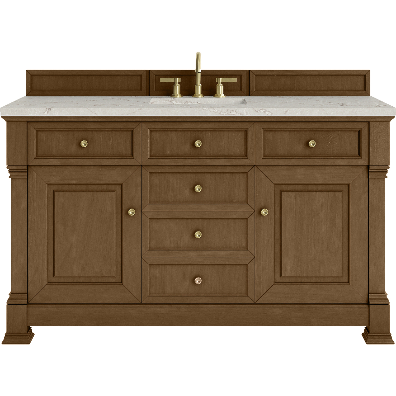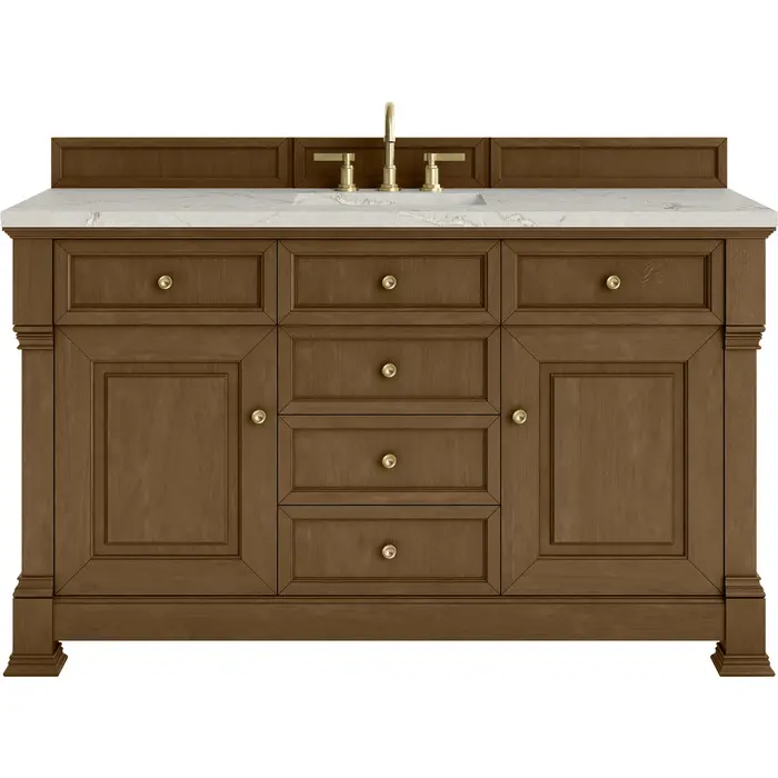 The Brookfield 60" Single Vanity in Honey Oak by James Martin Vanities offers a blend of traditional elegance and contemporary sophistication. The raised panel picture frame doors and detailed corner molding reflect timeless craftsmanship, while the warm Honey Oak finish and Champagne Brass hardware lend a fresh, modern appeal. This beautifully crafted vanity features two single-door cabinets that open to interior shelves, along with five standard drawers for ample storage. The warm wood tones highlight the natural Oak wood grains, lending sophistication and charm to your space. The addition of a Victorian Silver Silestone® top featuring a neutral white and gray background with fine silver veining, along with an undermount sink, completes the look. This unit is enabled with FreePower wireless charging; featuring a single-device charger seamlessly embedded into the countertop, indicated by a light-up halo to the left of the sink. Designed for modern living, FreePower offers convenient, integrated, wireless charging when and where you need it.Two single-door cabinets that open to interior shelves; five standard drawersDrawer boxes feature English Dovetail joinery with premium, soft-close undermount drawer slides; doors feature soft-close, adjustable door hingesCabinet features a multi-stage premium finish coat to offer UV and moisture resistanceHoney Oak finish with Champagne Brass hardwareCountertop is pre-drilled for an 8" widespread faucet; our 3cm eased edge countertops come with white porcelain rectangular sink(s) that ship separately and include mounting brackets for easy installationFaucet sold separatelyDrawers lined with our signature brushed aluminum laminate for easy cleaningFreestanding VanityMatching wood backsplash includedMatching stone backsplash available as add-on purchaseFreePower Wireless Charging; single-device unit left of sinkInspired by statement heirloom pieces, the Brookfield Collection has a fresh new look! Featuring raised panel doors and corner molding, we've updated Brookfield's traditional design to feel more contemporary. Available in three beautiful finishes, this collection offers a functional storage solution with a sophisticated, hand-crafted appeal.1 year warranty against manufacturer's defects. We will repair or replace any defective product, if the product is defective in material or workmanship at our discretion. No warranty is expressed or implied regarding damages resulting from consumer misuse.