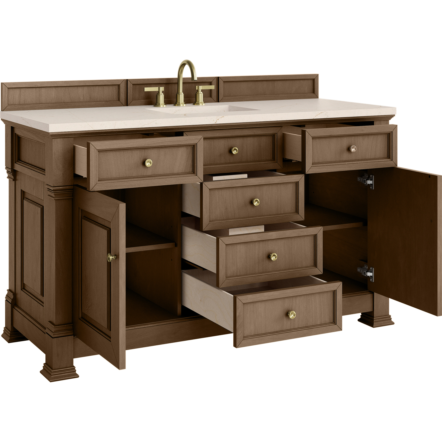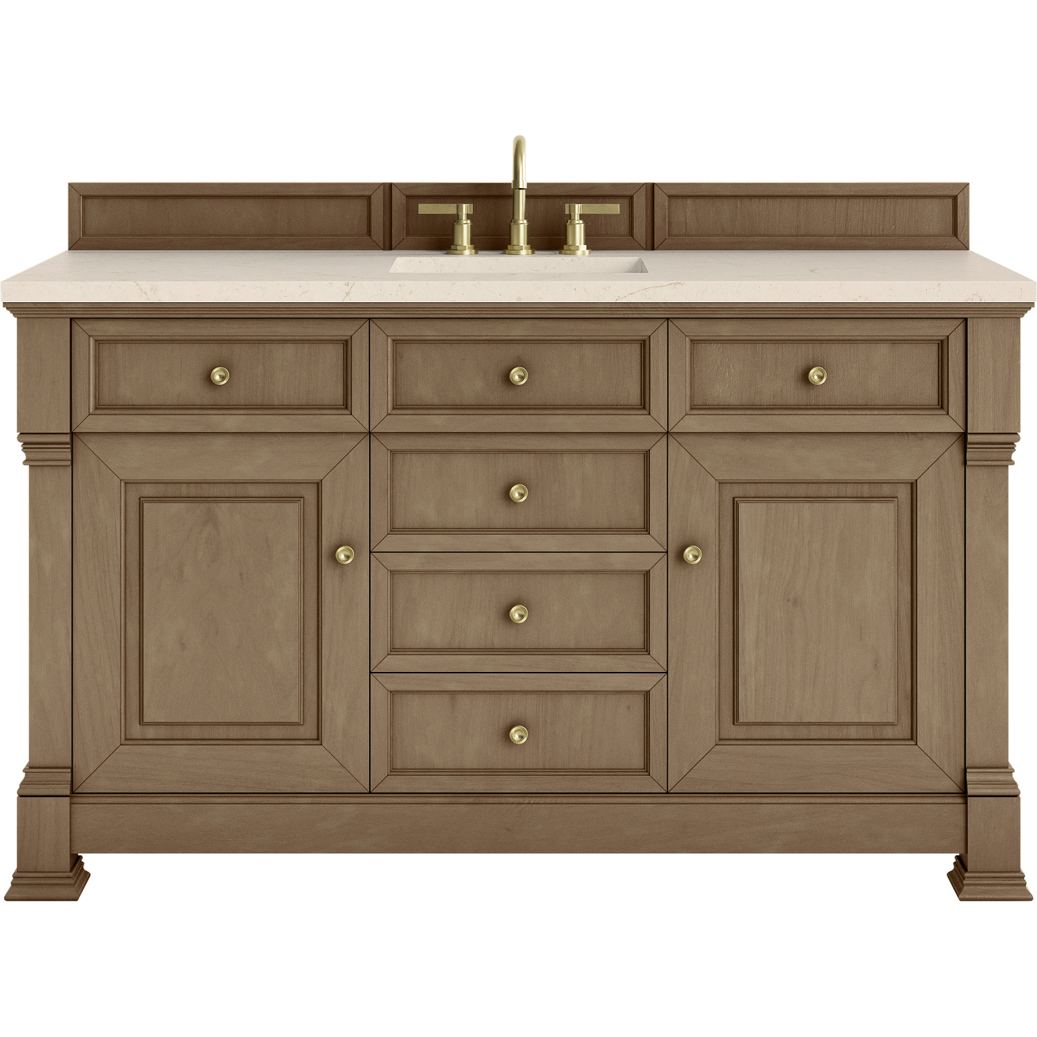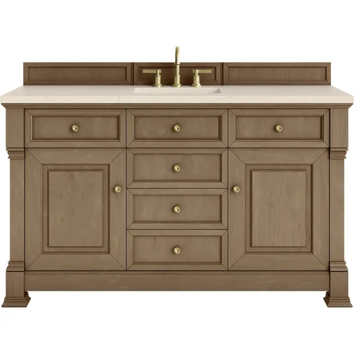 The Brookfield 60" Single Vanity in Pecan by James Martin Vanities offers a blend of traditional elegance and contemporary sophistication. The raised panel picture frame doors and detailed corner molding reflect timeless craftsmanship, while the Pecan finish and Champagne Brass hardware lend a fresh, modern appeal. This beautifully crafted vanity features two single door cabinets that open to interior shelves, along with five standard drawers for ample storage. The cool wood tones highlight the natural Oak wood grains, lending sophistication and charm to your space. The addition of an Eternal Marfil Silestone® top with undermount sink completes the look.Two single door cabinets that open to interior shelves; five standard drawersDrawer boxes feature English Dovetail joinery with premium, soft-close undermount drawer slides; doors feature soft-close, adjustable door hingesCabinet features a multi-stage premium finish coat to offer UV and moisture resistancePecan finish with Champagne Brass hardwareCountertop is pre-drilled for an 8" widespread faucet; our 3cm eased edge countertop comes with a white porcelain sink that ships separately and includes mounting brackets for easy installationDrawers lined with our signature brushed aluminum laminate for easy cleaningFreestanding VanityMatching wood backsplash includedFaucet sold separatelyInspired by statement heirloom pieces, the Brookfield Collection has a fresh new look! Featuring raised panel doors and corner molding, we've updated Brookfield's traditional design to feel more contemporary. Available in three beautiful finishes, this collection offers a functional storage solution with a sophisticated, hand-crafted appeal.1 year warranty against manufacturer's defects. We will repair or replace any defective product, if the product is defective in material or workmanship at our discretion. No warranty is expressed or implied regarding damages resulting from consumer misuse.