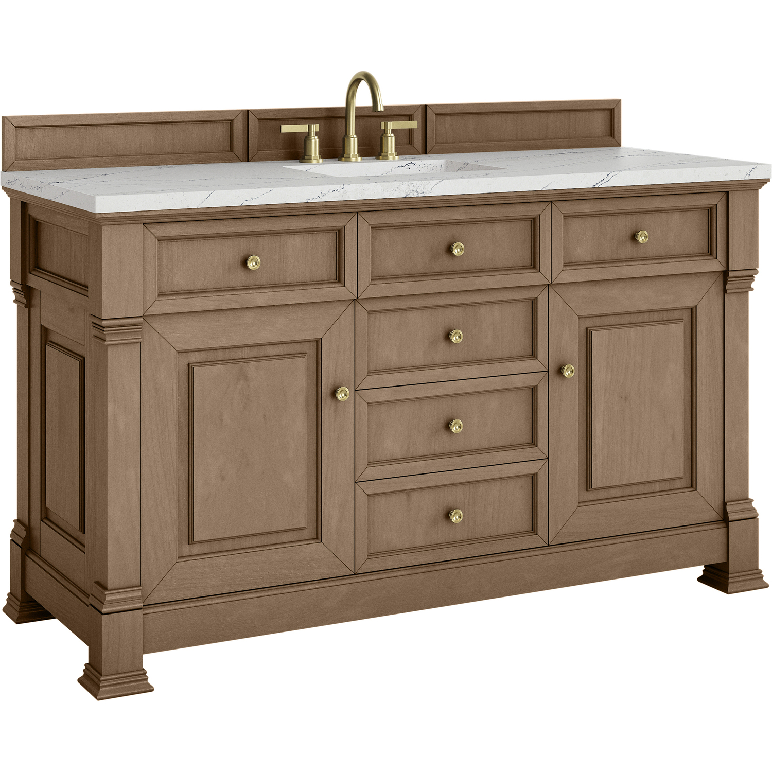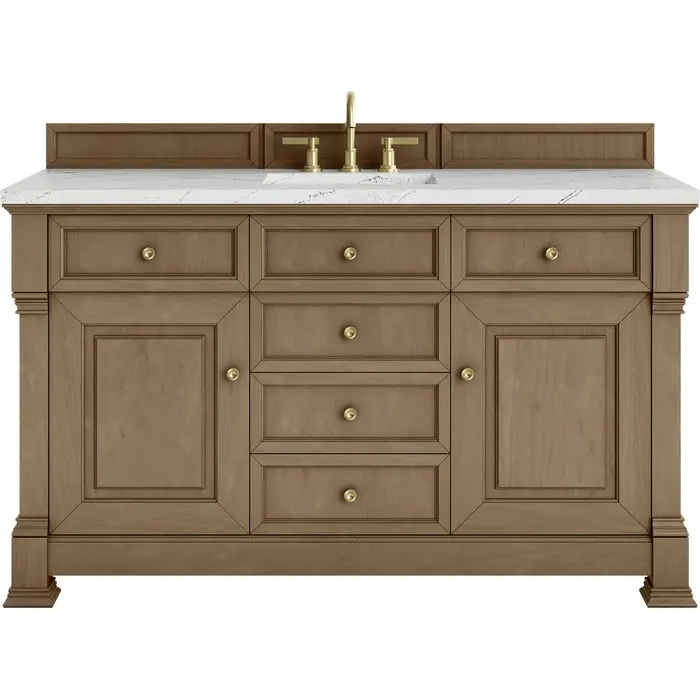 The Brookfield 60" Single Vanity in Pecan by James Martin Vanities offers a blend of traditional elegance and contemporary sophistication. The raised panel picture frame doors and detailed corner molding reflect timeless craftsmanship, while the Pecan finish and Champagne Brass hardware lend a fresh, modern appeal. This beautifully crafted vanity features two single door cabinets that open to interior shelves, along with five standard drawers for ample storage. The cool wood tones highlight the natural Oak wood grains, lending sophistication and charm to your space. The addition of an Ethereal Noctis Silestone® top with undermount sink completes the look.Two single door cabinets that open to interior shelves; five standard drawersDrawer boxes feature English Dovetail joinery with premium, soft-close undermount drawer slides; doors feature soft-close, adjustable door hingesCabinet features a multi-stage premium finish coat to offer UV and moisture resistancePecan finish with Champagne Brass hardwareCountertop is pre-drilled for an 8" widespread faucet; our 3cm eased edge countertop comes with a white porcelain sink that ships separately and includes mounting brackets for easy installationDrawers lined with our signature brushed aluminum laminate for easy cleaningFreestanding VanityMatching wood backsplash includedFaucet sold separatelyInspired by statement heirloom pieces, the Brookfield Collection has a fresh new look! Featuring raised panel doors and corner molding, we've updated Brookfield's traditional design to feel more contemporary. Available in three beautiful finishes, this collection offers a functional storage solution with a sophisticated, hand-crafted appeal.1 year warranty against manufacturer's defects. We will repair or replace any defective product, if the product is defective in material or workmanship at our discretion. No warranty is expressed or implied regarding damages resulting from consumer misuse.