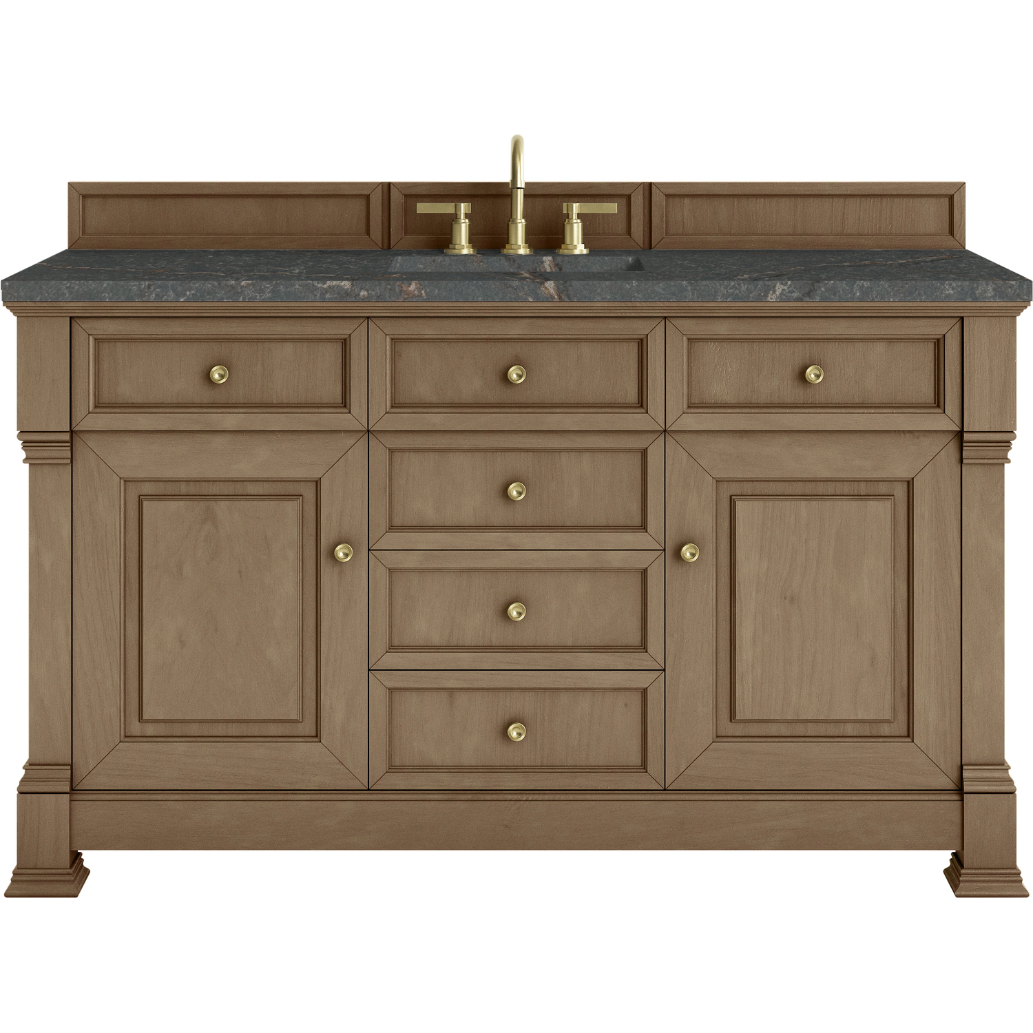 The Brookfield 60" Single Vanity in Pecan by James Martin Vanities offers a blend of traditional elegance and contemporary sophistication. The raised panel picture frame doors and detailed corner molding reflect timeless craftsmanship, while the Pecan finish and Champagne Brass hardware lend a fresh, modern appeal. This beautifully crafted vanity features two single-door cabinets that open to interior shelves, along with five standard drawers for ample storage. The cool wood tones highlight the natural Oak wood grains, lending sophistication and charm to your space. The addition of a Parisien Bleu Silestone® top featuring copper veining and an undermount sink completes the look. This unit is enabled with FreePower wireless charging; featuring a single-device charger seamlessly embedded into the countertop, indicated by a light-up halo to the left of the sink. Designed for modern living, FreePower offers convenient, integrated, wireless charging when and where you need it.Two single-door cabinets that open to interior shelves; five standard drawersDrawer boxes feature English Dovetail joinery with premium, soft-close undermount drawer slides; doors feature soft-close, adjustable door hingesCabinet features a multi-stage premium finish coat to offer UV and moisture resistancePecan finish with Champagne Brass hardwareCountertop is pre-drilled for an 8" widespread faucet; our 3cm eased edge countertops come with white porcelain rectangular sink(s) that ship separately and include mounting brackets for easy installationFaucet sold separatelyDrawers lined with our signature brushed aluminum laminate for easy cleaningFreestanding VanityMatching wood backsplash includedMatching stone backsplash available as add-on purchaseFreePower Wireless Charging; single-device unit left of sinkInspired by statement heirloom pieces, the Brookfield Collection has a fresh new look! Featuring raised panel doors and corner molding, we've updated Brookfield's traditional design to feel more contemporary. Available in three beautiful finishes, this collection offers a functional storage solution with a sophisticated, hand-crafted appeal.1 year warranty against manufacturer's defects. We will repair or replace any defective product, if the product is defective in material or workmanship at our discretion. No warranty is expressed or implied regarding damages resulting from consumer misuse.