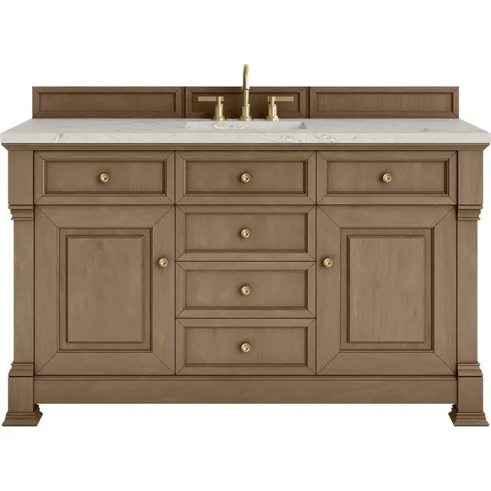 The Brookfield 60" Single Vanity in Pecan by James Martin Vanities offers a blend of traditional elegance and contemporary sophistication. The raised panel picture frame doors and detailed corner molding reflect timeless craftsmanship, while the Pecan finish and Champagne Brass hardware lend a fresh, modern appeal. This beautifully crafted vanity features two single-door cabinets that open to interior shelves, along with five standard drawers for ample storage. The cool wood tones highlight the natural Oak wood grains, lending sophistication and charm to your space. The addition of a Victorian Silver Silestone® top featuring a neutral white and gray background with fine silver veining, along with an undermount sink, completes the look. This unit is enabled with FreePower wireless charging; featuring a single-device charger seamlessly embedded into the countertop, indicated by a light-up halo to the left of the sink. Designed for modern living, FreePower offers convenient, integrated, wireless charging when and where you need it.Two single-door cabinets that open to interior shelves; five standard drawersDrawer boxes feature English Dovetail joinery with premium, soft-close undermount drawer slides; doors feature soft-close, adjustable door hingesCabinet features a multi-stage premium finish coat to offer UV and moisture resistancePecan finish with Champagne Brass hardwareCountertop is pre-drilled for an 8" widespread faucet; our 3cm eased edge countertops come with white porcelain rectangular sink(s) that ship separately and include mounting brackets for easy installationFaucet sold separatelyDrawers lined with our signature brushed aluminum laminate for easy cleaningFreestanding VanityMatching wood backsplash includedMatching stone backsplash available as add-on purchaseFreePower Wireless Charging; single-device unit left of sinkInspired by statement heirloom pieces, the Brookfield Collection has a fresh new look! Featuring raised panel doors and corner molding, we've updated Brookfield's traditional design to feel more contemporary. Available in three beautiful finishes, this collection offers a functional storage solution with a sophisticated, hand-crafted appeal.1 year warranty against manufacturer's defects. We will repair or replace any defective product, if the product is defective in material or workmanship at our discretion. No warranty is expressed or implied regarding damages resulting from consumer misuse.