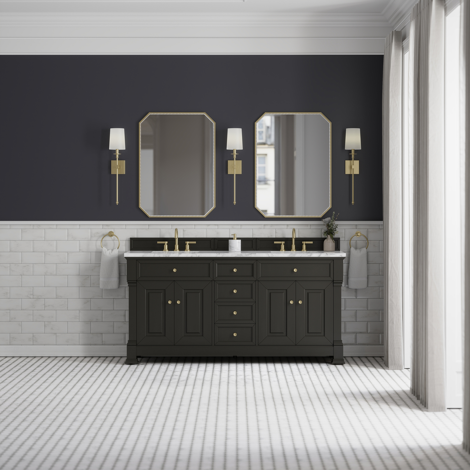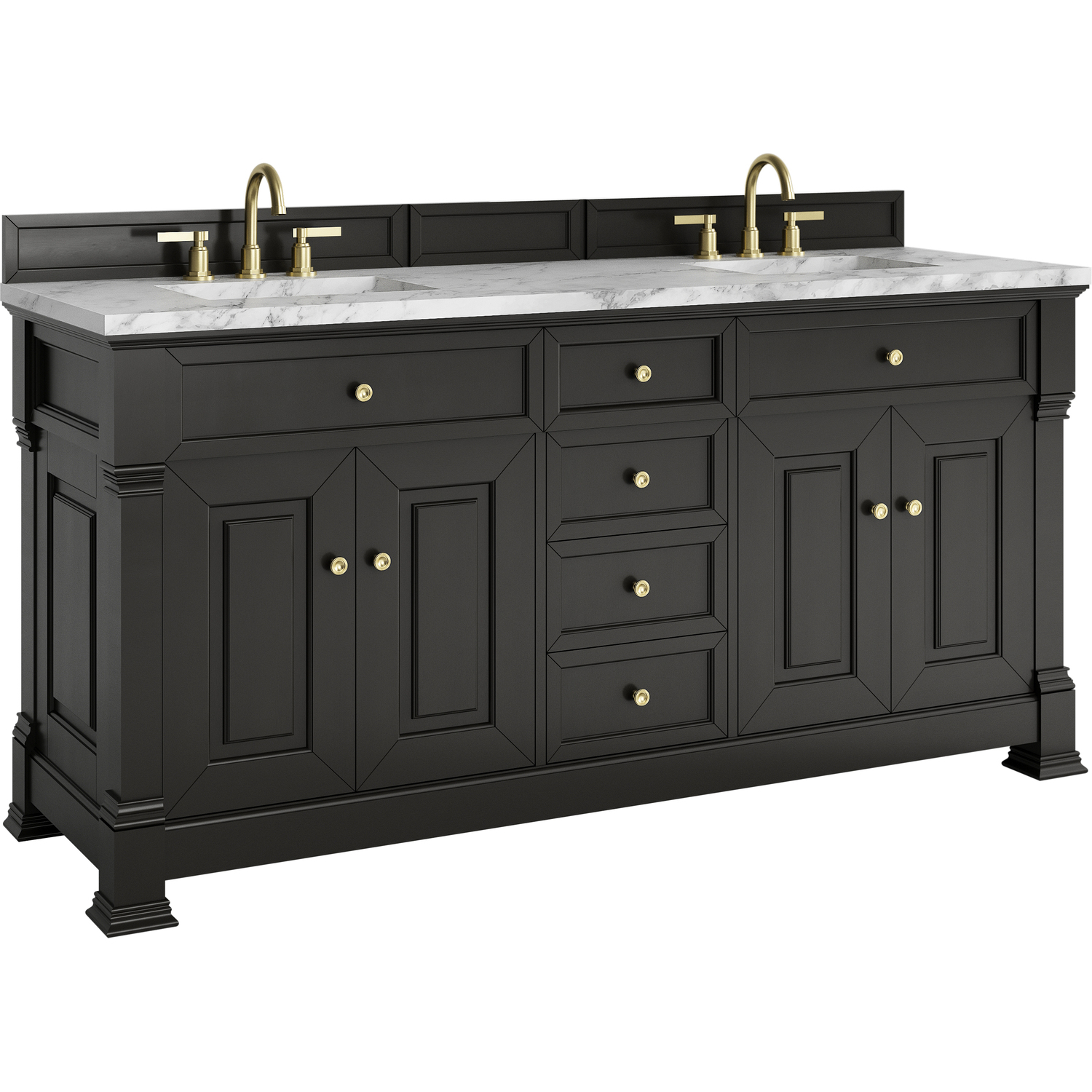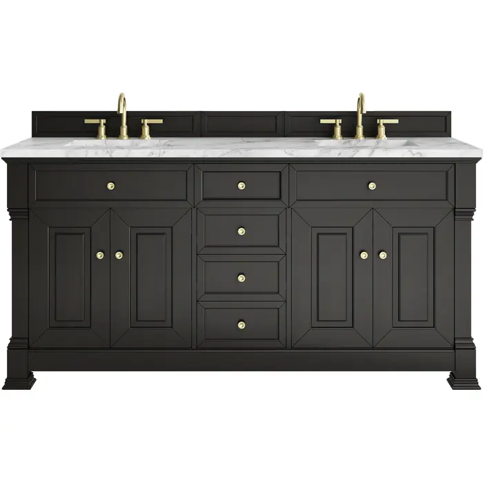 The Brookfield 72" Double Vanity in Black Onyx by James Martin Vanities offers a blend of traditional elegance and contemporary sophistication. The raised panel picture frame doors and detailed corner molding reflect timeless craftsmanship, while the rich Black Onyx finish and Champagne Brass hardware lend a fresh, modern appeal. This beautifully crafted vanity features two double-door cabinets that open to interior shelves, along with four standard drawers for ample storage. The timeless Black Onyx finish lends sophistication and charm to your space. The look is completed by a classic Carrara Marble top with white porcelain undermount sinks.Two double-door cabinets that open to interior shelves; four standard drawersDrawer boxes feature English Dovetail joinery with premium, soft-close undermount drawer slides; doors feature soft-close, adjustable door hingesCabinet features a multi-stage premium finish coat to offer UV and moisture resistanceBlack Onyx finish with Champagne Brass hardwareCountertop is pre-drilled for 8" widespread faucets; our 3cm eased edge countertops come with white porcelain sinks that ship separately and include mounting brackets for easy installationDrawers lined with our signature brushed aluminum laminate for easy cleaningFreestanding VanityMatching wood backsplash includedFaucet sold separatelyInspired by statement heirloom pieces, the Brookfield Collection has a fresh new look! Featuring raised panel doors and corner molding, we've updated Brookfield's traditional design to feel more contemporary. Available in three beautiful finishes, this collection offers a functional storage solution with a sophisticated, hand-crafted appeal.1 year warranty against manufacturer's defects. We will repair or replace any defective product, if the product is defective in material or workmanship at our discretion. No warranty is expressed or implied regarding damages resulting from consumer misuse.