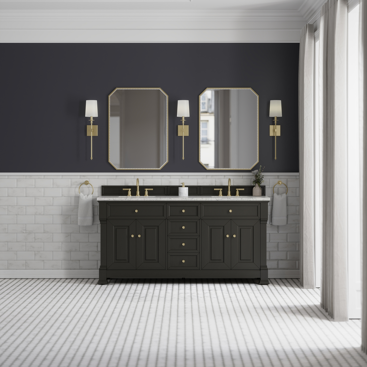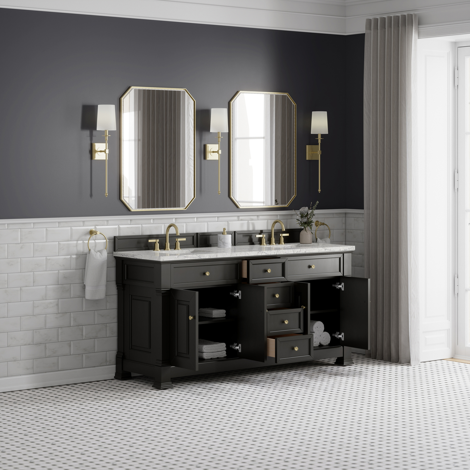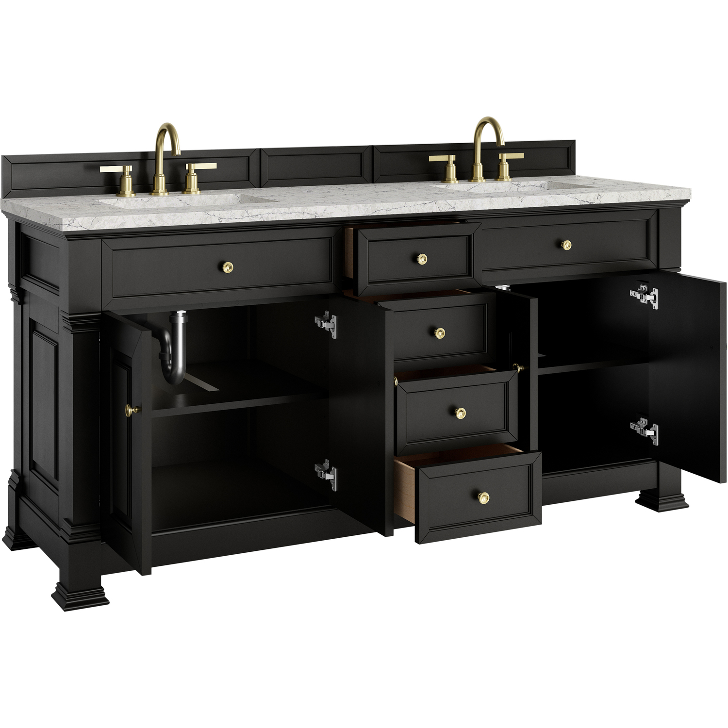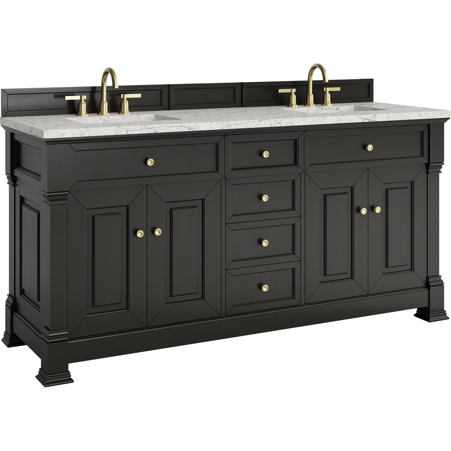 The Brookfield 72" Double Vanity in Black Onyx by James Martin Vanities offers a blend of traditional elegance and contemporary sophistication. The raised panel picture frame doors and detailed corner molding reflect timeless craftsmanship, while the rich Black Onyx finish and Champagne Brass hardware lend a fresh, modern appeal. This beautifully crafted vanity features two double-door cabinets that open to interior shelves, along with four standard drawers for ample storage. The timeless Black Onyx finish lends sophistication and charm to your space. The addition of an Eternal Jasmine Pearl Silestone® top with undermount sinks completes the look.Two double-door cabinets that open to interior shelves; four standard drawersDrawer boxes feature English Dovetail joinery with premium, soft-close undermount drawer slides; doors feature soft-close, adjustable door hingesCabinet features a multi-stage premium finish coat to offer UV and moisture resistanceBlack Onyx finish with Champagne Brass hardwareCountertop is pre-drilled for 8" widespread faucets; our 3cm eased edge countertops come with white porcelain sinks that ship separately and include mounting brackets for easy installationDrawers lined with our signature brushed aluminum laminate for easy cleaningFreestanding VanityMatching wood backsplash includedFaucet sold separatelyInspired by statement heirloom pieces, the Brookfield Collection has a fresh new look! Featuring raised panel doors and corner molding, we've updated Brookfield's traditional design to feel more contemporary. Available in three beautiful finishes, this collection offers a functional storage solution with a sophisticated, hand-crafted appeal.1 year warranty against manufacturer's defects. We will repair or replace any defective product, if the product is defective in material or workmanship at our discretion. No warranty is expressed or implied regarding damages resulting from consumer misuse.