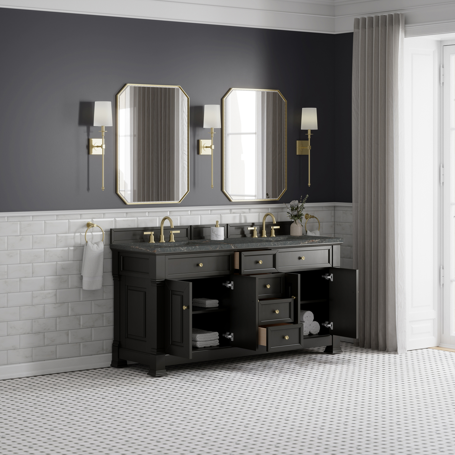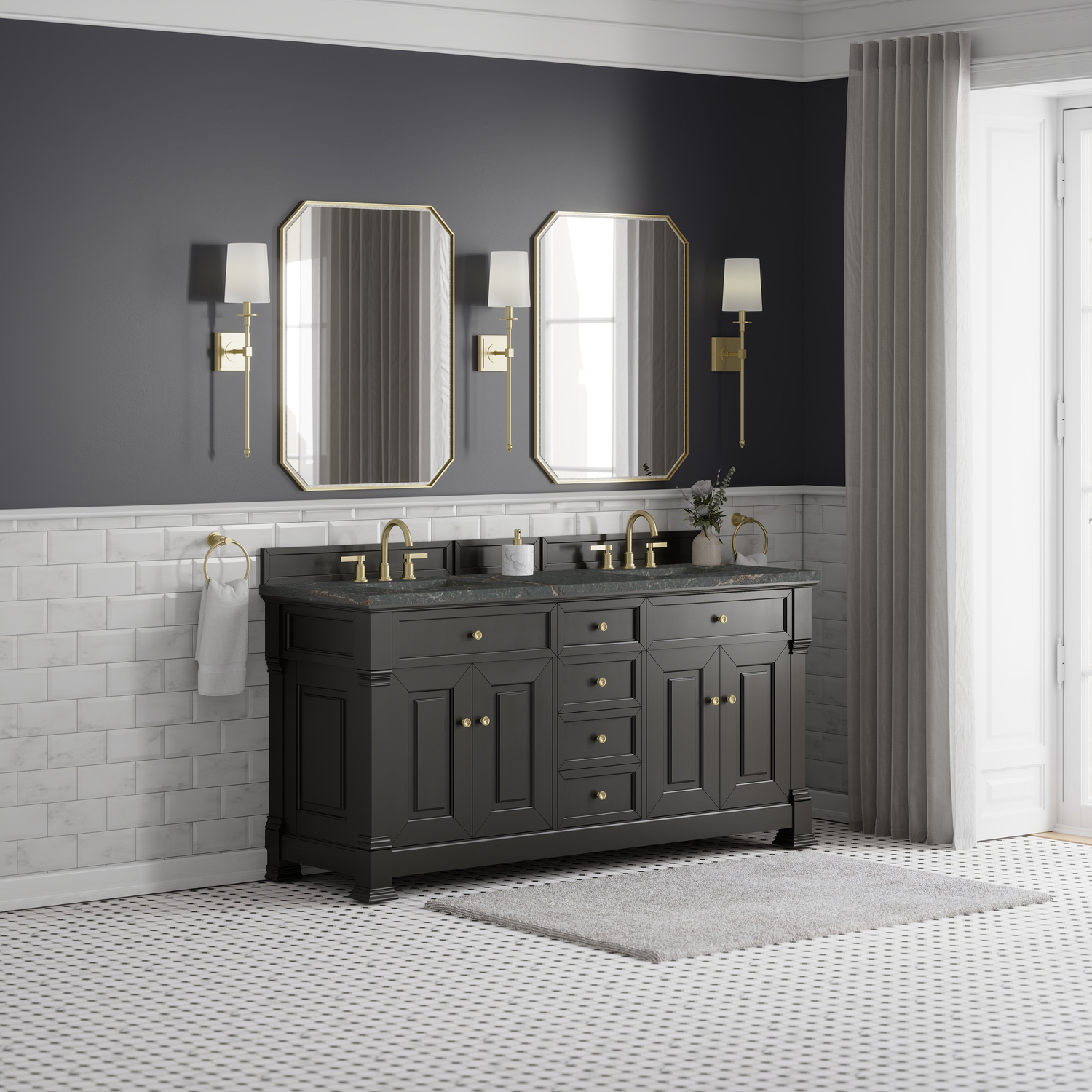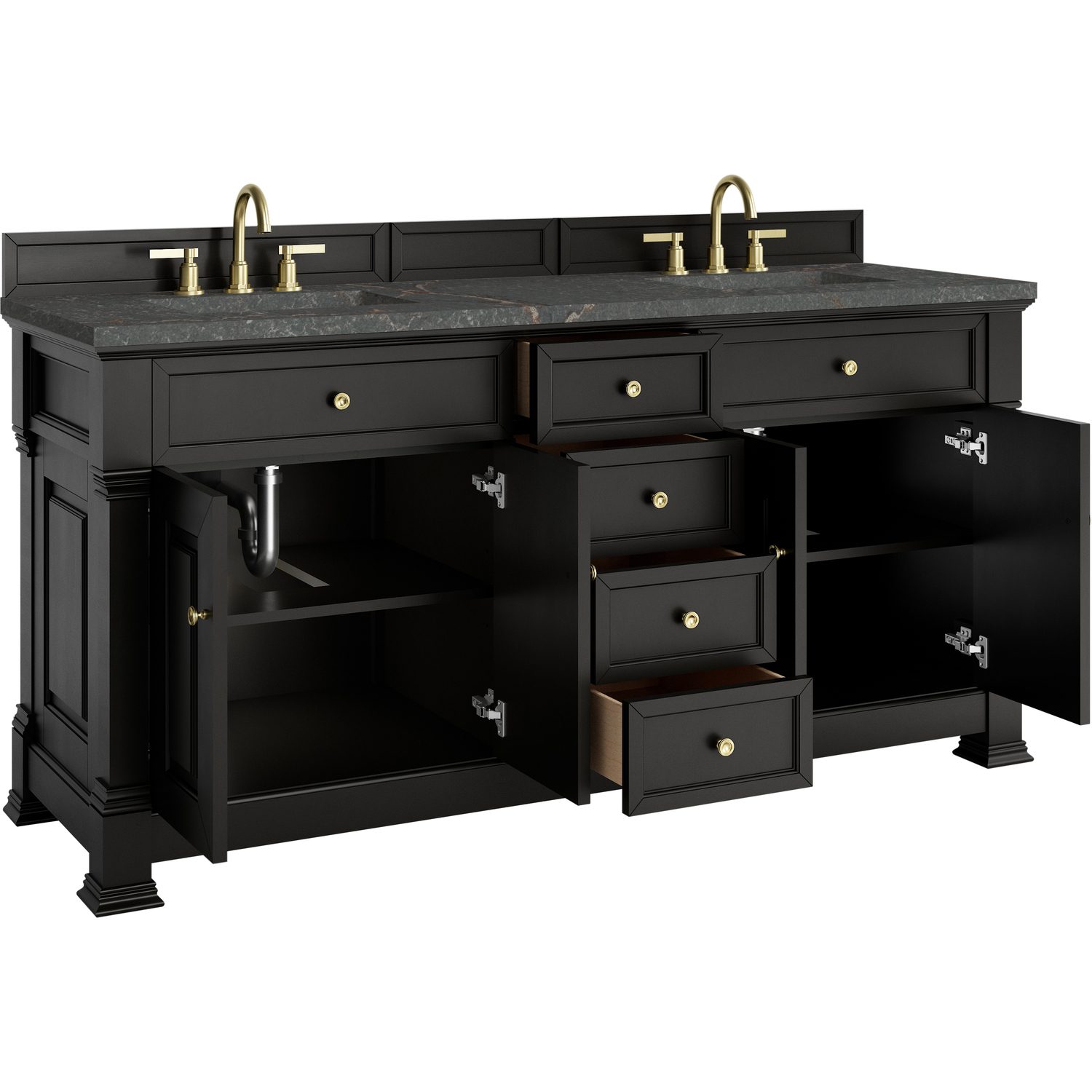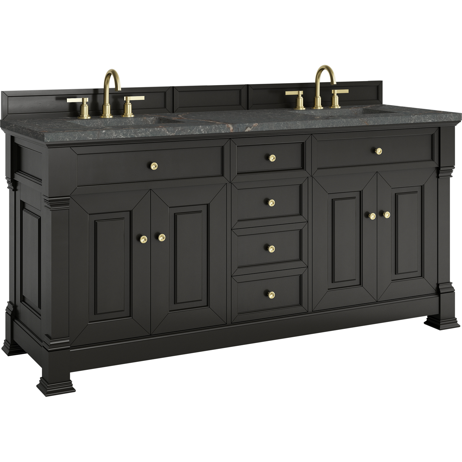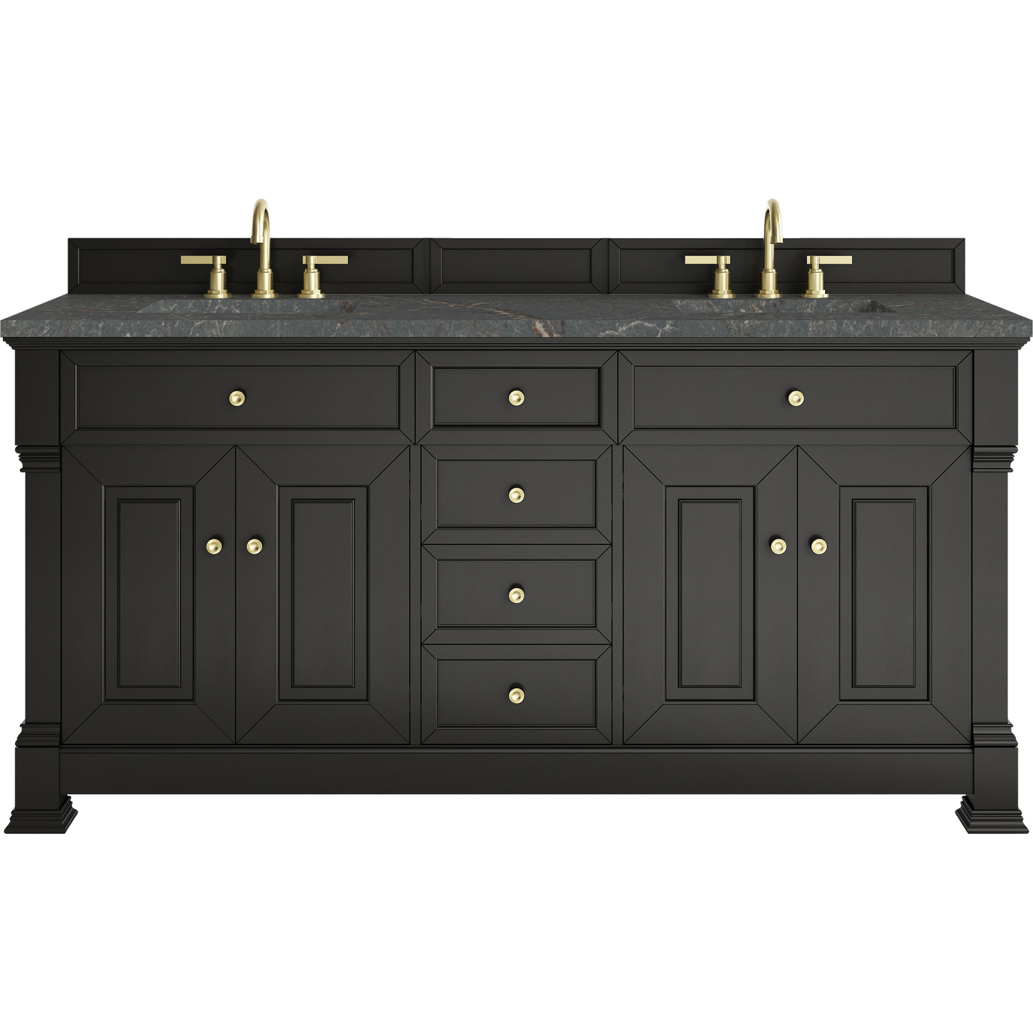 The Brookfield 72" Double Vanity in Black Onyx by James Martin Vanities offers a blend of traditional elegance and contemporary sophistication. The raised panel picture frame doors and detailed corner molding reflect timeless craftsmanship, while the rich Black Onyx finish and Champagne Brass hardware lend a fresh, modern appeal. This beautifully crafted vanity features two double-door cabinets that open to interior shelves, along with four standard drawers for ample storage. The timeless Black Onyx finish lends sophistication and charm to your space. The addition of a Parisien Bleu Silestone® top and undermount sinks completes the look.Two double-door cabinets that open to interior shelves; four standard drawersDrawer boxes feature English Dovetail joinery with premium, soft-close undermount drawer slides; doors feature soft-close, adjustable door hingesCabinet features a multi-stage premium finish coat to offer UV and moisture resistanceBlack Onyx finish with Champagne Brass hardwareCountertop is pre-drilled for 8" widespread faucets; our 3cm eased edge countertops come with white porcelain sinks that ship separately and include mounting brackets for easy installationDrawers lined with our signature brushed aluminum laminate for easy cleaningFreestanding VanityMatching wood backsplash includedFaucet sold separatelyInspired by statement heirloom pieces, the Brookfield Collection has a fresh new look! Featuring raised panel doors and corner molding, we've updated Brookfield's traditional design to feel more contemporary. Available in three beautiful finishes, this collection offers a functional storage solution with a sophisticated, hand-crafted appeal.1 year warranty against manufacturer's defects. We will repair or replace any defective product, if the product is defective in material or workmanship at our discretion. No warranty is expressed or implied regarding damages resulting from consumer misuse.