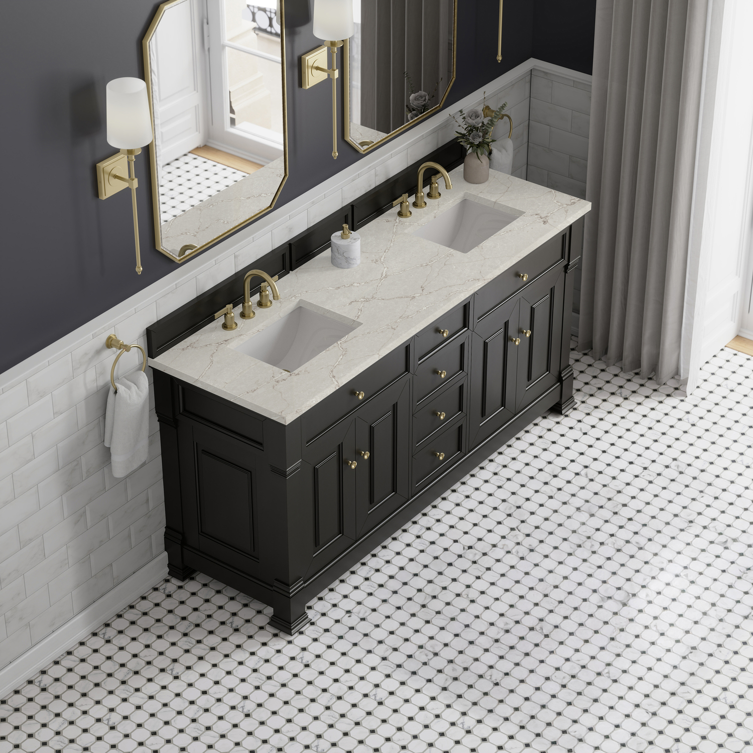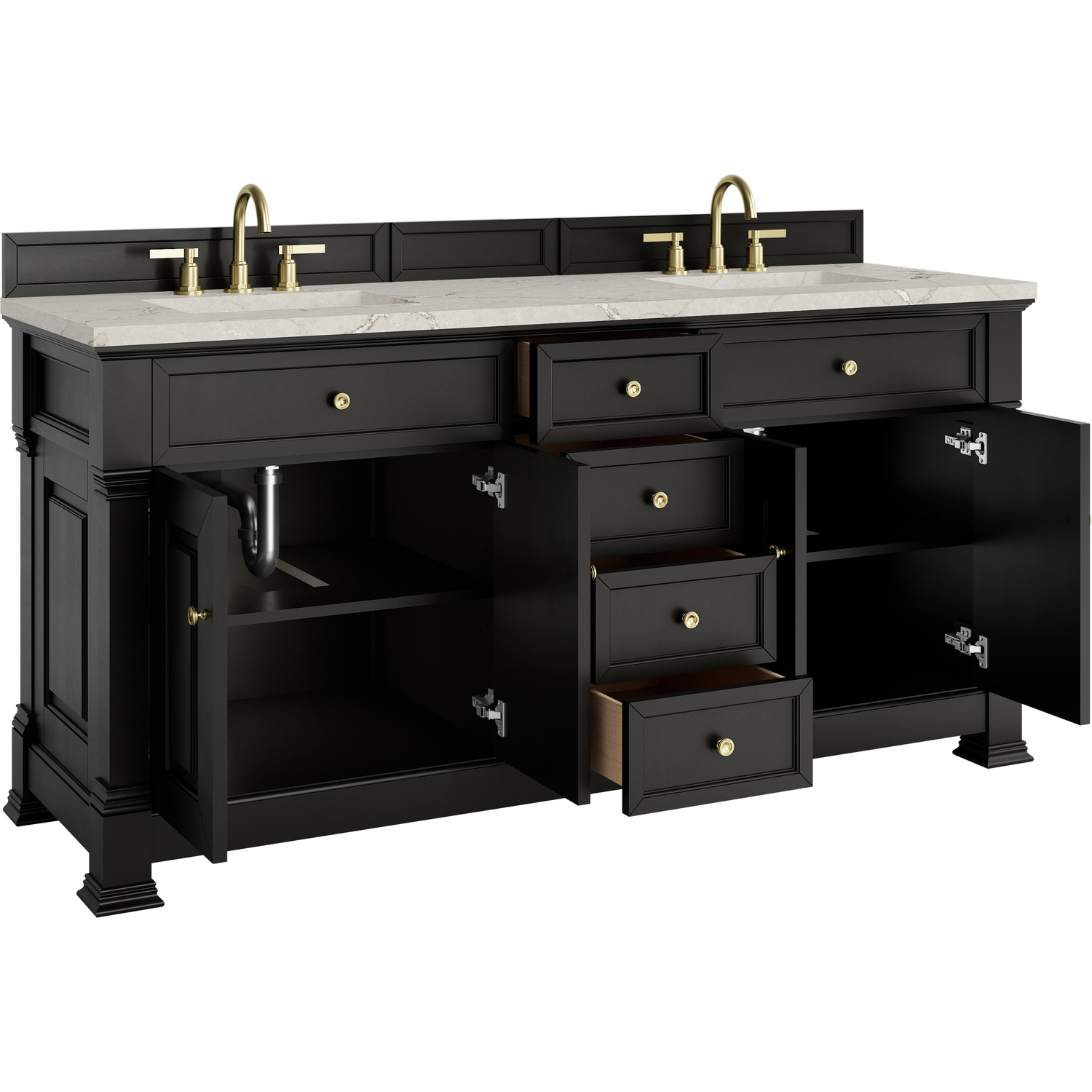 The Brookfield 72" Double Vanity in Black Onyx by James Martin Vanities offers a blend of traditional elegance and contemporary sophistication. The raised panel picture frame doors and detailed corner molding reflect timeless craftsmanship, while the rich Black Onyx finish and Champagne Brass hardware lend a fresh, modern appeal. This beautifully crafted vanity features two double-door cabinets that open to interior shelves, along with four standard drawers for ample storage. The timeless Black Onyx finish lends sophistication and charm to your space. The addition of a Victorian Silver Silestone® top featuring a neutral white and gray background with fine silver veining, along with an undermount sinks, completes the look.Two double-door cabinets that open to interior shelves; four standard drawersDrawer boxes feature English Dovetail joinery with premium, soft-close undermount drawer slides; doors feature soft-close, adjustable door hingesCabinet features a multi-stage premium finish coat to offer UV and moisture resistanceBlack Onyx finish with Champagne Brass hardwareCountertop is pre-drilled for 8" widespread faucets; our 3cm eased edge countertops come with white porcelain sinks that ship separately and include mounting brackets for easy installationDrawers lined with our signature brushed aluminum laminate for easy cleaningFreestanding VanityMatching wood backsplash includedFaucet sold separatelyInspired by statement heirloom pieces, the Brookfield Collection has a fresh new look! Featuring raised panel doors and corner molding, we've updated Brookfield's traditional design to feel more contemporary. Available in three beautiful finishes, this collection offers a functional storage solution with a sophisticated, hand-crafted appeal.1 year warranty against manufacturer's defects. We will repair or replace any defective product, if the product is defective in material or workmanship at our discretion. No warranty is expressed or implied regarding damages resulting from consumer misuse.