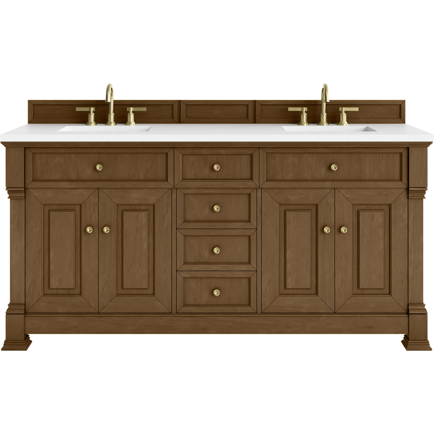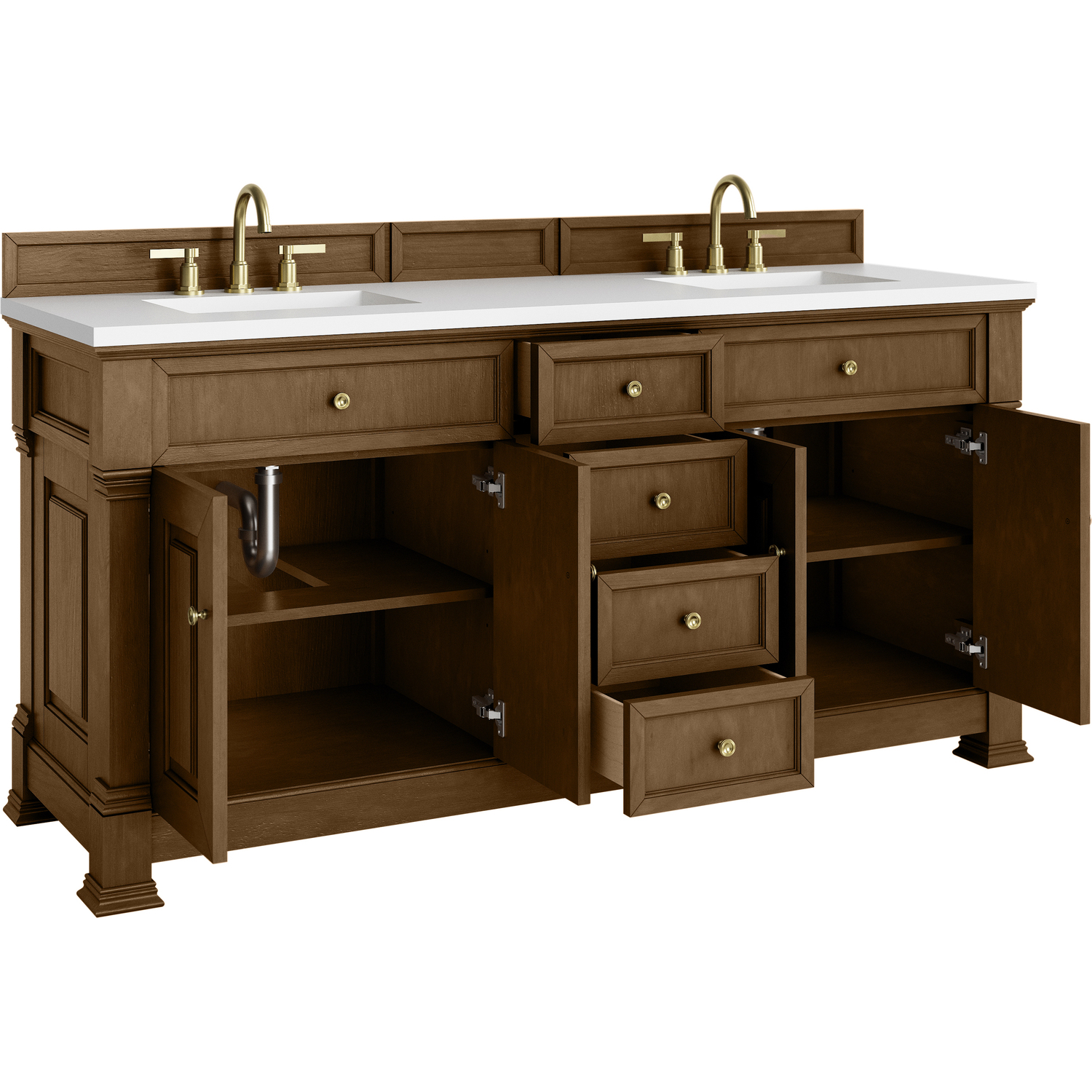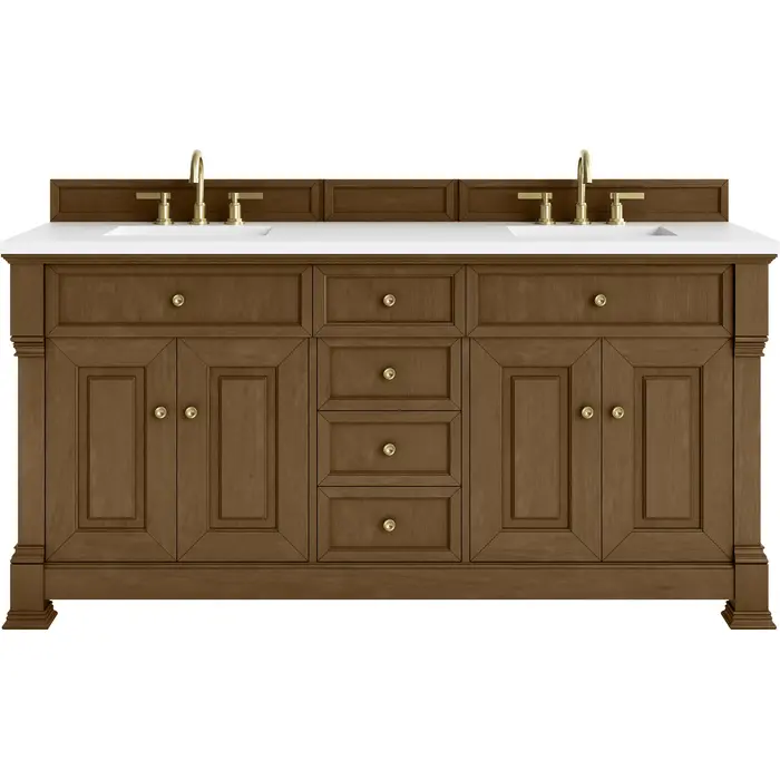 The Brookfield 72" Double Vanity in Honey Oak by James Martin Vanities offers a blend of traditional elegance and contemporary sophistication. The raised panel picture frame doors and detailed corner molding reflect timeless craftsmanship, while the warm Honey Oak finish and Champagne Brass hardware lend a fresh, modern appeal. This beautifully crafted vanity features two double-door cabinets that open to interior shelves, along with four standard drawers for ample storage. The warm wood tones highlight the natural Oak wood grains, lending sophistication and charm to your space. A classic White Zeus Silestone® top with undermount sinks completes the look.Two double-door cabinets that open to interior shelves; four standard drawersDrawer boxes feature English Dovetail joinery with premium, soft-close undermount drawer slides; doors feature soft-close, adjustable door hingesCabinet features a multi-stage premium finish coat to offer UV and moisture resistanceHoney Oak finish with Champagne Brass hardwareCountertop is pre-drilled for 8" widespread faucets; our 3cm eased edge countertops come with white porcelain sinks that ship separately and include mounting brackets for easy installationDrawers lined with our signature brushed aluminum laminate for easy cleaningFreestanding VanityMatching wood backsplash includedFaucet sold separatelyInspired by statement heirloom pieces, the Brookfield Collection has a fresh new look! Featuring raised panel doors and corner molding, we've updated Brookfield's traditional design to feel more contemporary. Available in three beautiful finishes, this collection offers a functional storage solution with a sophisticated, hand-crafted appeal.1 year warranty against manufacturer's defects. We will repair or replace any defective product, if the product is defective in material or workmanship at our discretion. No warranty is expressed or implied regarding damages resulting from consumer misuse.