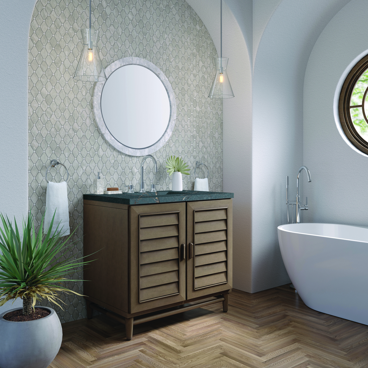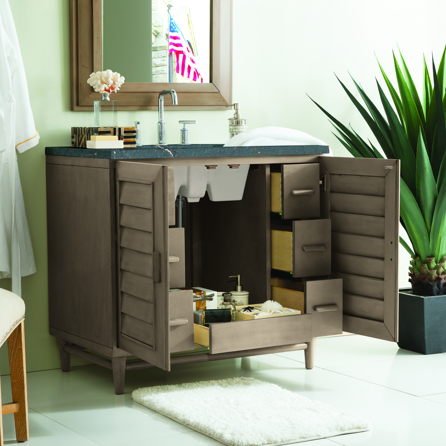The Portland 36" Whitewashed Walnut Single Vanity features soft-close hinges on doors, with undermount soft-close slides on drawers and concealed ample storage. A proportionate and complementary design with wood knobs and brushed aluminum interior drawers. Completing the look is a Parisien Bleu Silestone top, offering a deep bluish hue with broad and intricate neutral veins highlighted by fine coppery accents which perfectly complement the Whitewashed Walnut finish.Vanity set includes a 3cm eased edge Parisien Bleu Silestone top, which includes one white porcelain rectangular undermount sink that ships separately, as well as mounting brackets for easy installation. The top is pre-drilled for an 8" widespread faucet.Single door Whitewashed Walnut single vanity with seven interior drawersConstructed with a Soft Maple solid wood frame, Plywood panels that are covered with solid Poplar wood veneers.Drawer boxes are constructed using English Dovetail joinery, feature soft-close undermount glides and a Brushed Aluminum laminate drawer bottom.Faucet sold separatelyCountertop is pre-drilled for one 3-hole 8" spreadThoroughly Modern. Inspired by the American design aesthetic prevalent from the mid 1930’s through the mid 1960’s; James Martin’s Portland Collection relies on pleasing proportions and simple, modern lines. The cabinets’ stylized, louver doors, conceal ample storage and, with a multitude of drawers - elements of organization. The two finish colors are James Martin’s most popular as well; Burnished Mahogany and Whitewashed Walnut. Our coordinating 28” Mirrors were designed to compliment all cabinet sizes.1 year warranty against manufacturer's defects. We will repair or replace any defective product, if the product is defective in material or workmanship at our discretion. No warranty is expressed or implied regarding damages resulting from consumer misuse.