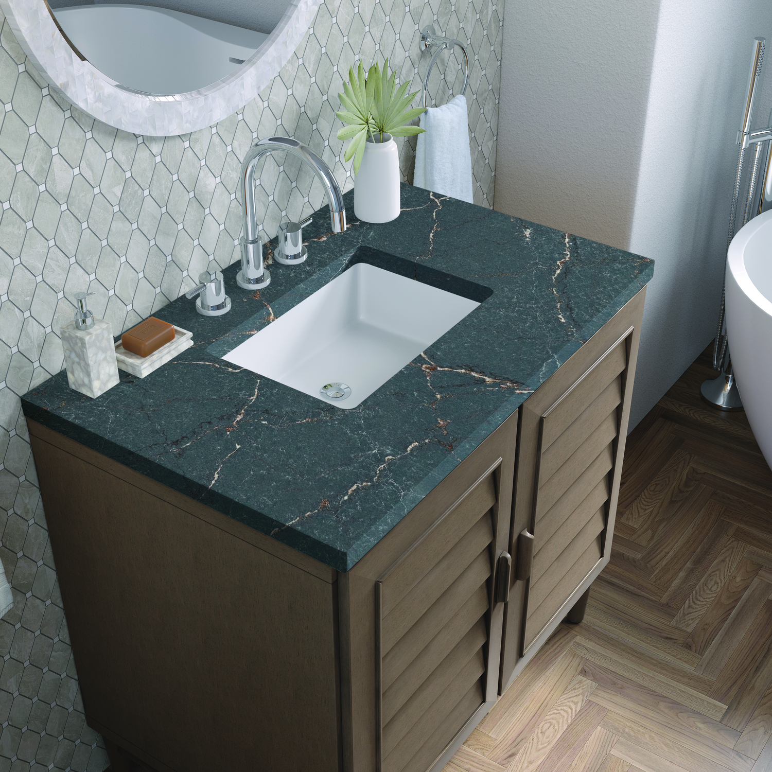 James Martin Portland 36 inch Single Vanity Whitewashed Walnut w/ 3 CM Parisien Bleu Quartz Top, 840108968020, 620-V36-WW-3PBL