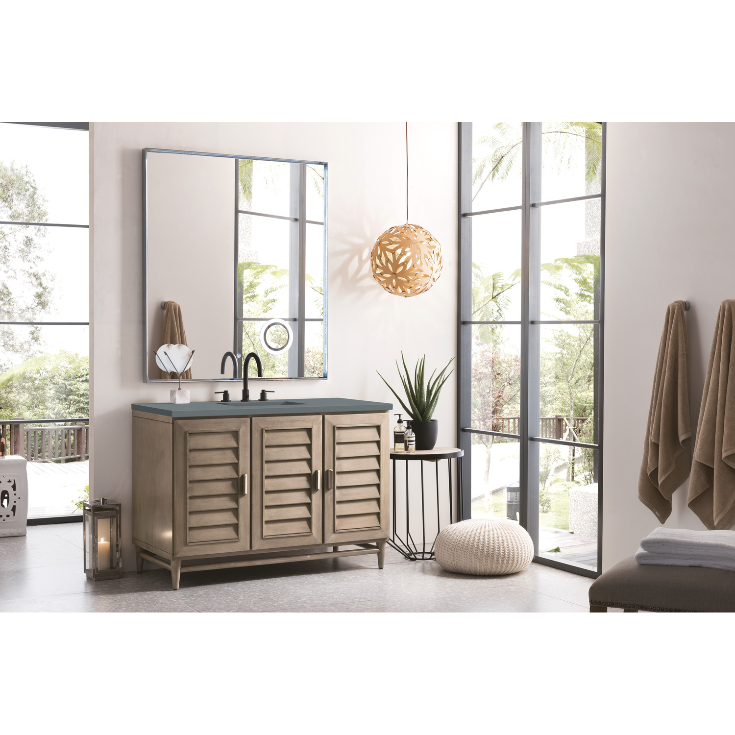 - Thoroughly Modern. Inspired by the American design aesthetic prevalent from the mid 1930’s through the mid 1960’s; James Martin’s Portland Collection relies on pleasing proportions and simple, modern lines. The cabinets’ stylized, louver doors, conceal ample storage and, with a multitude of drawers - elements of organization. The two finish colors are James Martin’s most popular as well; Burnished Mahogany and Whitewashed Walnut. Our coordinating 28” Mirrors were designed to compliment all cabinet sizes.