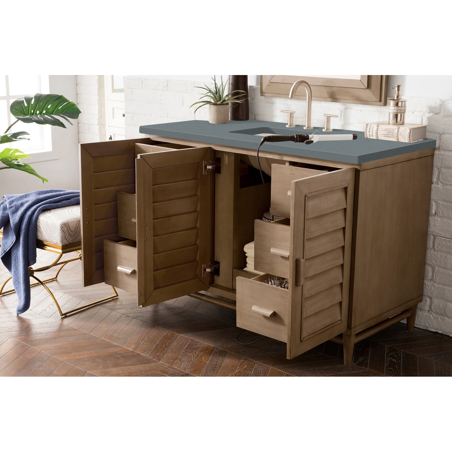 The Portland 48" Whitewashed Walnut Single Vanity features soft-close hinges on doors, with undermount soft-close slides on drawers and concealed ample storage. A proportionate and complementary design with wood knobs and brushed aluminum interior drawers. Premium features include one bamboo drawer organizer and one electrical component with two USB outlets. The look is completed with a 3 CM eased edge Cala Blue Silestone top and one white ceramic rectangular sink.Three door Whitewashed Walnut single vanity with seven interior drawersHardware Finish: Whitewashed Walnut (Wood)Solid kiln-dried Grade A hardwoodCabinet is finished inside and out with a premium undercoat finish for superior moisture and UV resistanceSoft-close undermount drawer glides and soft-close door hingesDrawer bottoms are lined with our signature brushed aluminum laminateOne 120 Volt UL rated electrical component with two electrical and two USB (2.0) outletsOne bamboo drawer organizer3 CM eased edge Cala Blue Silestone top and one white porcelain rectangular sinkFaucet sold separatelyCountertop is pre-drilled for one 3-hole 8" spreadThoroughly Modern. Inspired by the American design aesthetic prevalent from the mid 1930’s through the mid 1960’s; James Martin’s Portland Collection relies on pleasing proportions and simple, modern lines. The cabinets’ stylized, louver doors, conceal ample storage and, with a multitude of drawers - elements of organization. The two finish colors are James Martin’s most popular as well; Burnished Mahogany and Whitewashed Walnut. Our coordinating 28” Mirrors were designed to compliment all cabinet sizes.1 year warranty against manufacturer's defects. We will repair or replace any defective product, if the product is defective in material or workmanship at our discretion. No warranty is expressed or implied regarding damages resulting from consumer misuse.