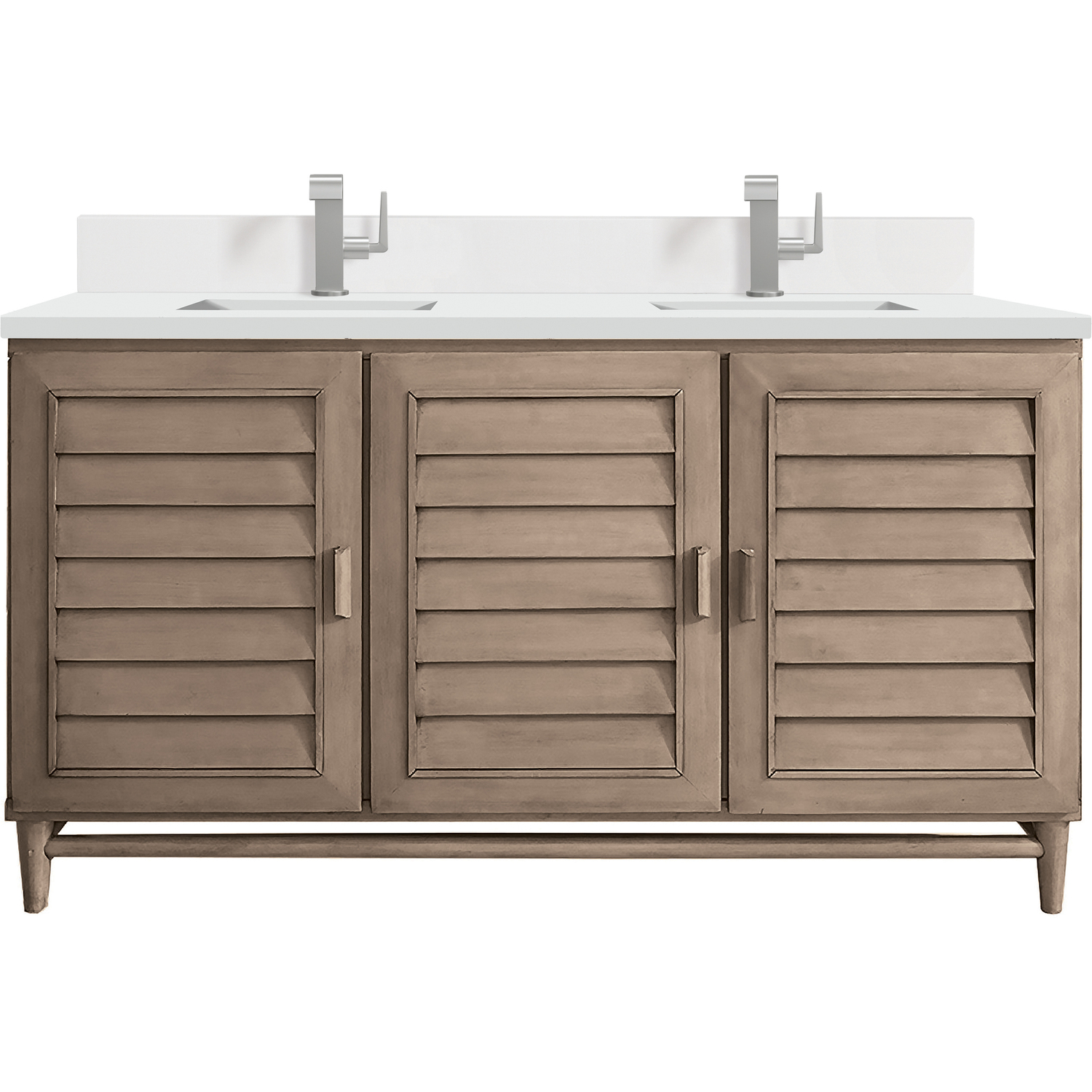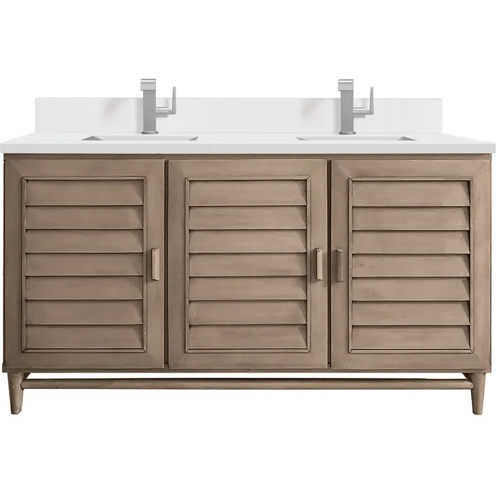 The Portland 60" Whitewashed Walnut Double Vanity features soft-close hinges on doors, with undermount soft-close slides on drawers and concealed ample storage. A proportionate and complementary design with wood knobs and brushed aluminum interior drawers. Premium features include one bamboo drawer organizer and one electrical component with two USB outlets. A classic, crisp 3 CM White Zeus Silestone Top and backsplash with undermount sinks perfectly complements the finish.Vanity set includes a 3cm eased edge White Zeus Silestone top with matching backsplash, two white porcelain rectangular sinks and mounting brackets for easy installation. Top is pre-drilled for two single hole faucets. Faucets not included.Three door Whitewashed Walnut double vanity with four interior drawers and shelf spaceConstructed with a Soft Maple solid wood frame, Plywood panels that are covered with solid Poplar wood veneers.Drawer boxes are constructed using English Dovetail joinery, feature soft-close undermount glides and a Brushed Aluminum laminate drawer bottom.Includes one removable Bamboo drawer organizer trayIncludes a 120 UL-rated electrical component with dual power outlets and USB (Type A) portsMatching White Zeus 3cm Silestone backsplash included.Faucets sold separatelyThoroughly Modern. Inspired by the American design aesthetic prevalent from the mid 1930’s through the mid 1960’s; James Martin’s Portland Collection relies on pleasing proportions and simple, modern lines. The cabinets’ stylized, louver doors, conceal ample storage and, with a multitude of drawers - elements of organization. The two finish colors are James Martin’s most popular as well; Burnished Mahogany and Whitewashed Walnut. Our coordinating 28” Mirrors were designed to compliment all cabinet sizes.1 year warranty against manufacturer's defects. We will repair or replace any defective product, if the product is defective in material or workmanship at our discretion. No warranty is expressed or implied regarding damages resulting from consumer misuse.
