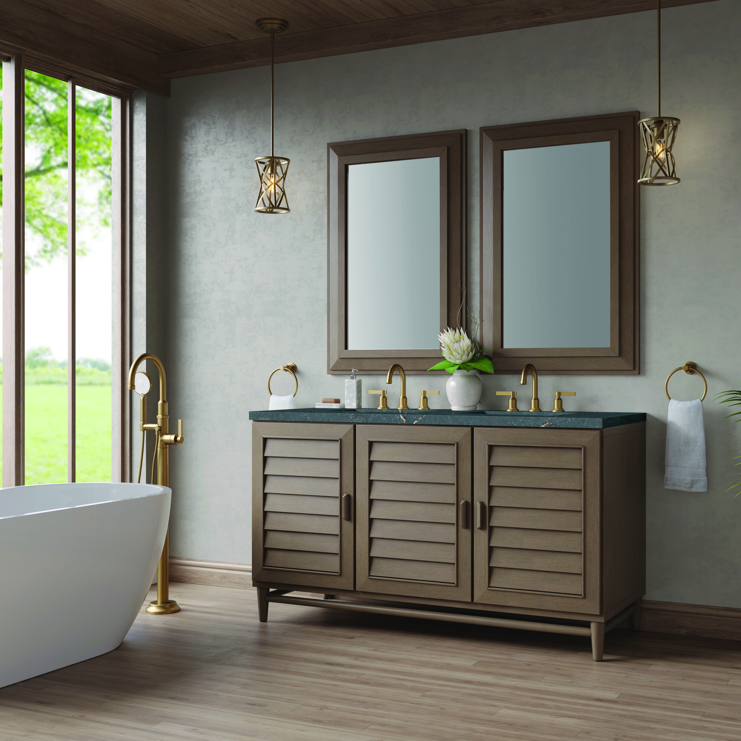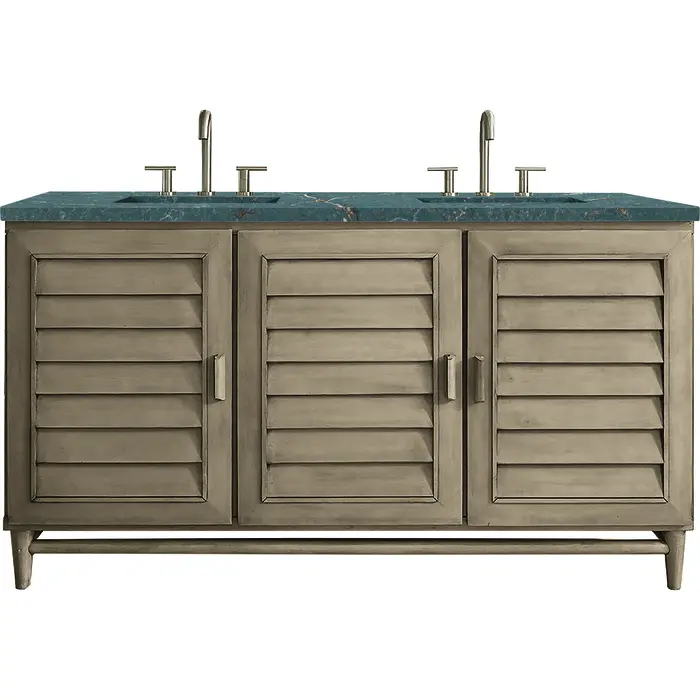The Portland 60" Whitewashed Walnut Double Vanity features soft-close hinges on doors, with undermount soft-close slides on drawers and concealed ample storage. A proportionate and complementary design with wood knobs and brushed aluminum interior drawers. Premium features include one bamboo drawer organizer and one electrical component with two USB outlets. Completing the look is a Parisien Bleu Silestone top, offering a deep bluish hue with broad and intricate neutral veins highlighted by fine coppery accents which perfectly complement the Whitewashed Walnut finish.Vanity set includes a 3cm eased edge Parisien Bleu Silestone top, which includes two white porcelain rectangular undermount sinks that ship separately, as well as mounting brackets for easy installation. The top is pre-drilled for two 8" widespread faucetThree-door Whitewashed Walnut cabinet with four interior drawers.Constructed with a Soft Maple solid wood frame, Plywood panels that are covered with solid Poplar wood veneers.Drawer boxes are constructed using English Dovetail joinery, feature soft-close undermount glides and a Brushed Aluminum laminate drawer bottom.Includes one removable Bamboo drawer organizer trayIncludes a 120 UL-rated electrical component with dual power outlets and USB (Type A) portsFaucets sold separatelyCountertop is pre-drilled for two 3-hole 8" spreadsThoroughly Modern. Inspired by the American design aesthetic prevalent from the mid 1930’s through the mid 1960’s; James Martin’s Portland Collection relies on pleasing proportions and simple, modern lines. The cabinets’ stylized, louver doors, conceal ample storage and, with a multitude of drawers - elements of organization. The two finish colors are James Martin’s most popular as well; Burnished Mahogany and Whitewashed Walnut. Our coordinating 28” Mirrors were designed to compliment all cabinet sizes.1 year warranty against manufacturer's defects. We will repair or replace any defective product, if the product is defective in material or workmanship at our discretion. No warranty is expressed or implied regarding damages resulting from consumer misuse.