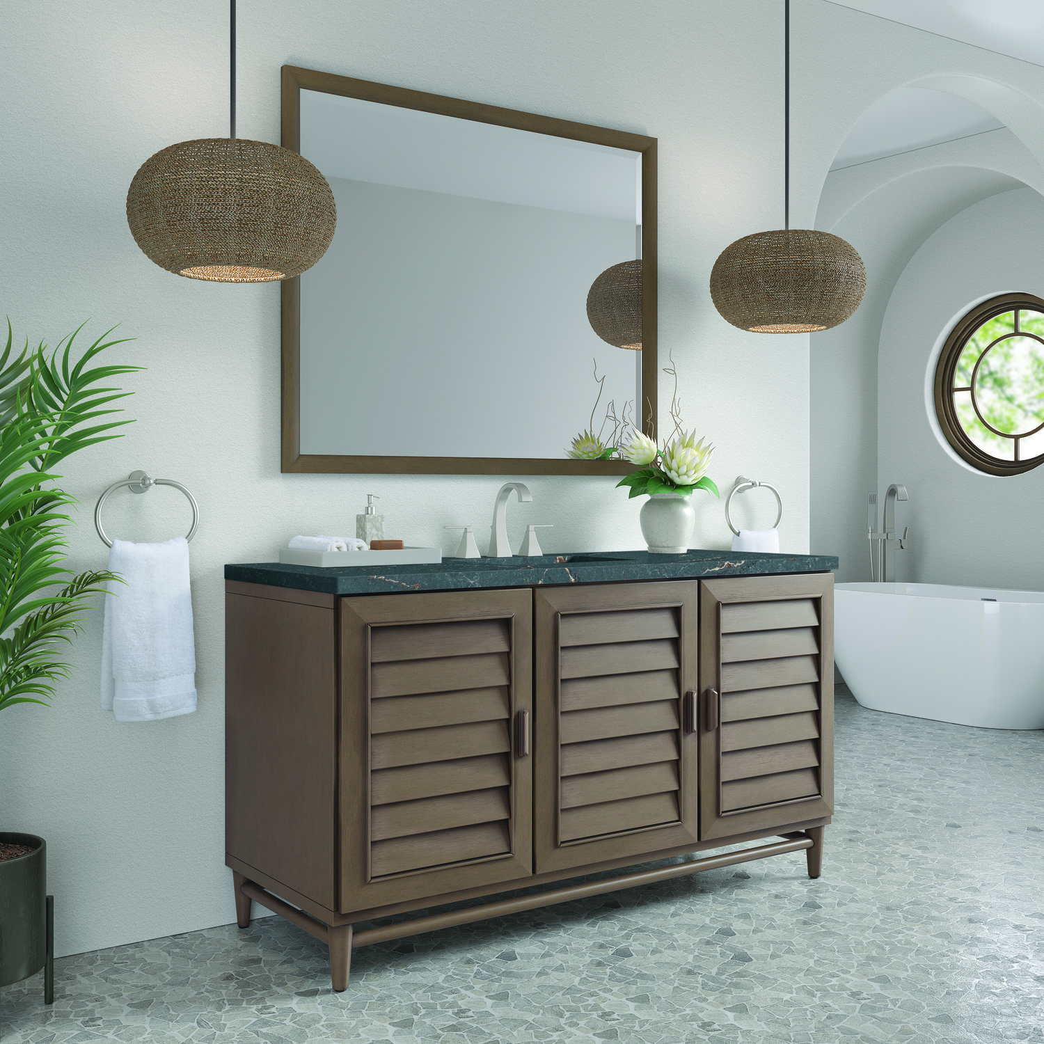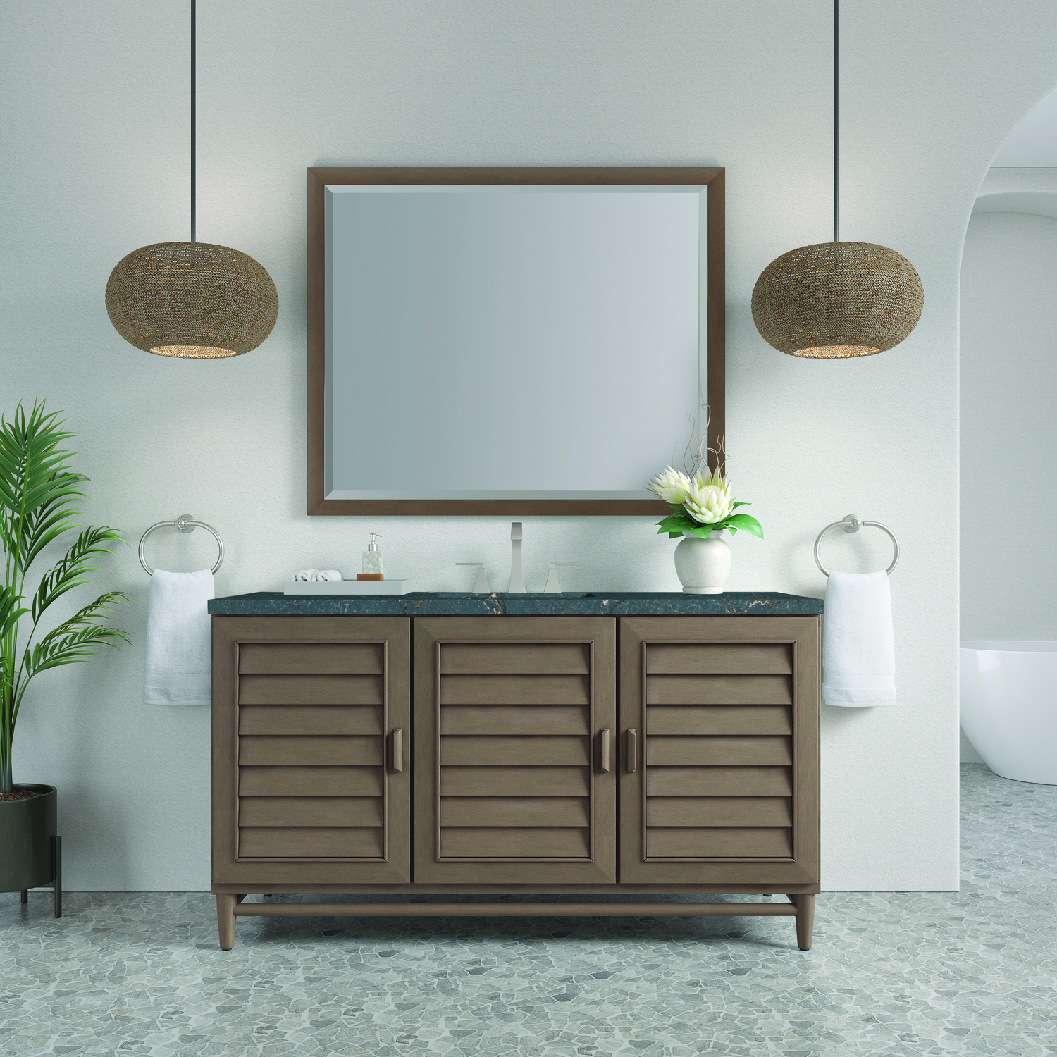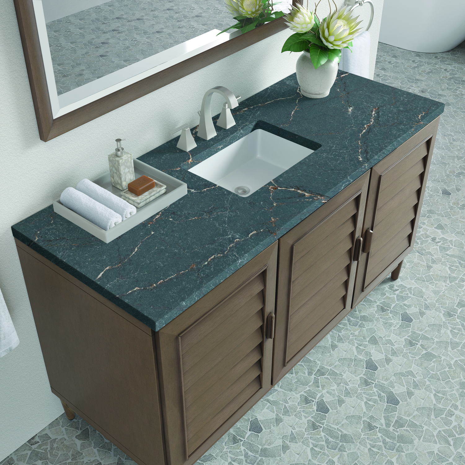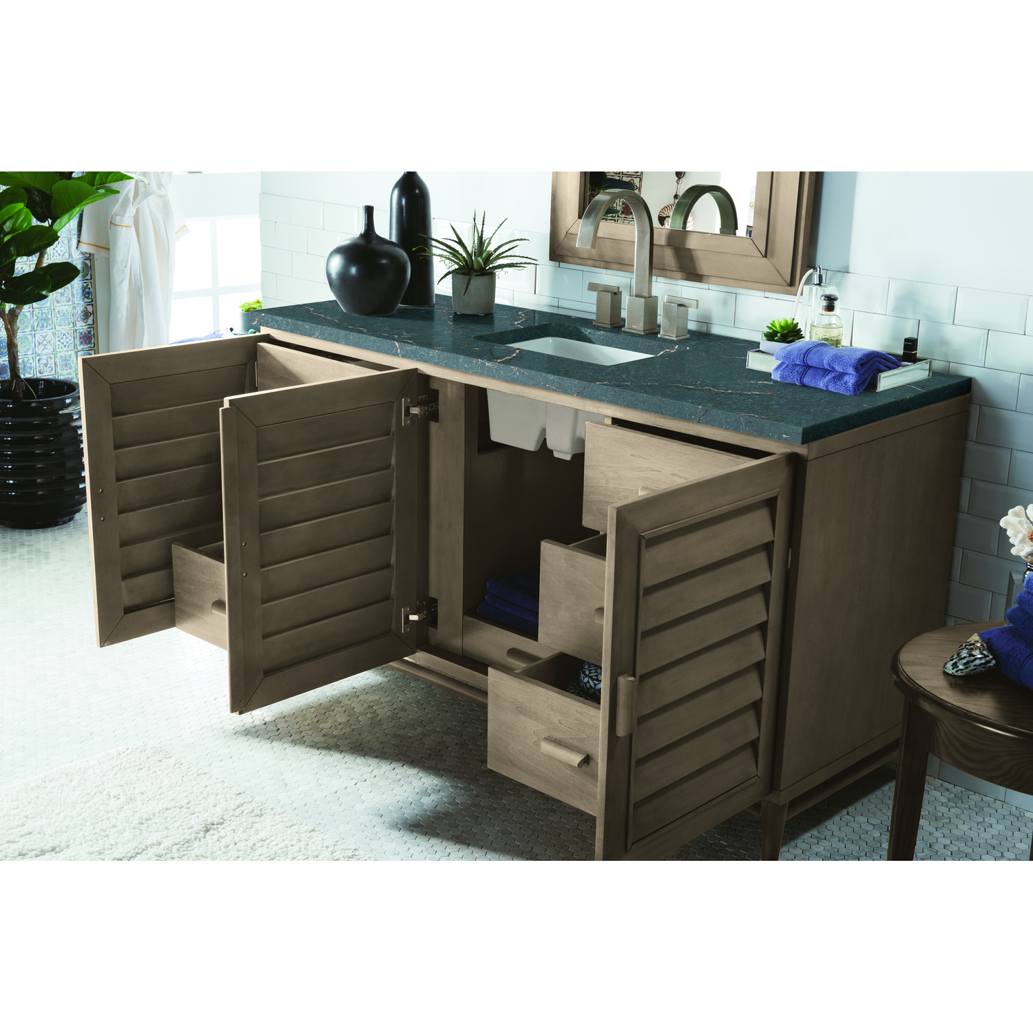 The Portland 60" Whitewashed Walnut Single Vanity features soft-close hinges on doors, with undermount soft-close slides on drawers and concealed ample storage. A proportionate and complementary design with wood knobs and brushed aluminum interior drawers. Premium features include one bamboo drawer organizer and one electrical component with two USB outlets. Completing the look is a Parisien Bleu Silestone top, offering a deep bluish hue with broad and intricate neutral veins highlighted by fine coppery accents which perfectly complement the Whitewashed Walnut finish.Vanity set includes a 3cm eased edge Parisien Bleu Silestone top, which includes one white porcelain rectangular undermount sink that ships separately, as well as mounting brackets for easy installation. The top is pre-drilled for an 8" widespread faucet.Three-door Whitewashed Walnut cabinet with seven interior drawers.Constructed with a Soft Maple solid wood frame, Plywood panels that are covered with solid Poplar wood veneers.Drawer boxes are constructed using English Dovetail joinery, feature soft-close undermount glides and a Brushed Aluminum laminate drawer bottom.Includes one removable Bamboo drawer organizer trayIncludes a 120 UL-rated electrical component with dual power outlets and USB (Type A) portsFaucet sold separatelyCountertop is pre-drilled for one 3-hole 8" spreadThoroughly Modern. Inspired by the American design aesthetic prevalent from the mid 1930’s through the mid 1960’s; James Martin’s Portland Collection relies on pleasing proportions and simple, modern lines. The cabinets’ stylized, louver doors, conceal ample storage and, with a multitude of drawers - elements of organization. The two finish colors are James Martin’s most popular as well; Burnished Mahogany and Whitewashed Walnut. Our coordinating 28” Mirrors were designed to compliment all cabinet sizes.1 year warranty against manufacturer's defects. We will repair or replace any defective product, if the product is defective in material or workmanship at our discretion. No warranty is expressed or implied regarding damages resulting from consumer misuse.