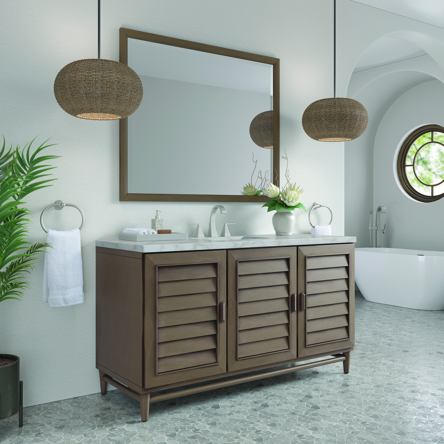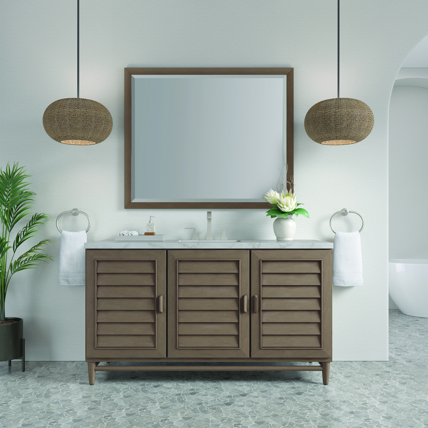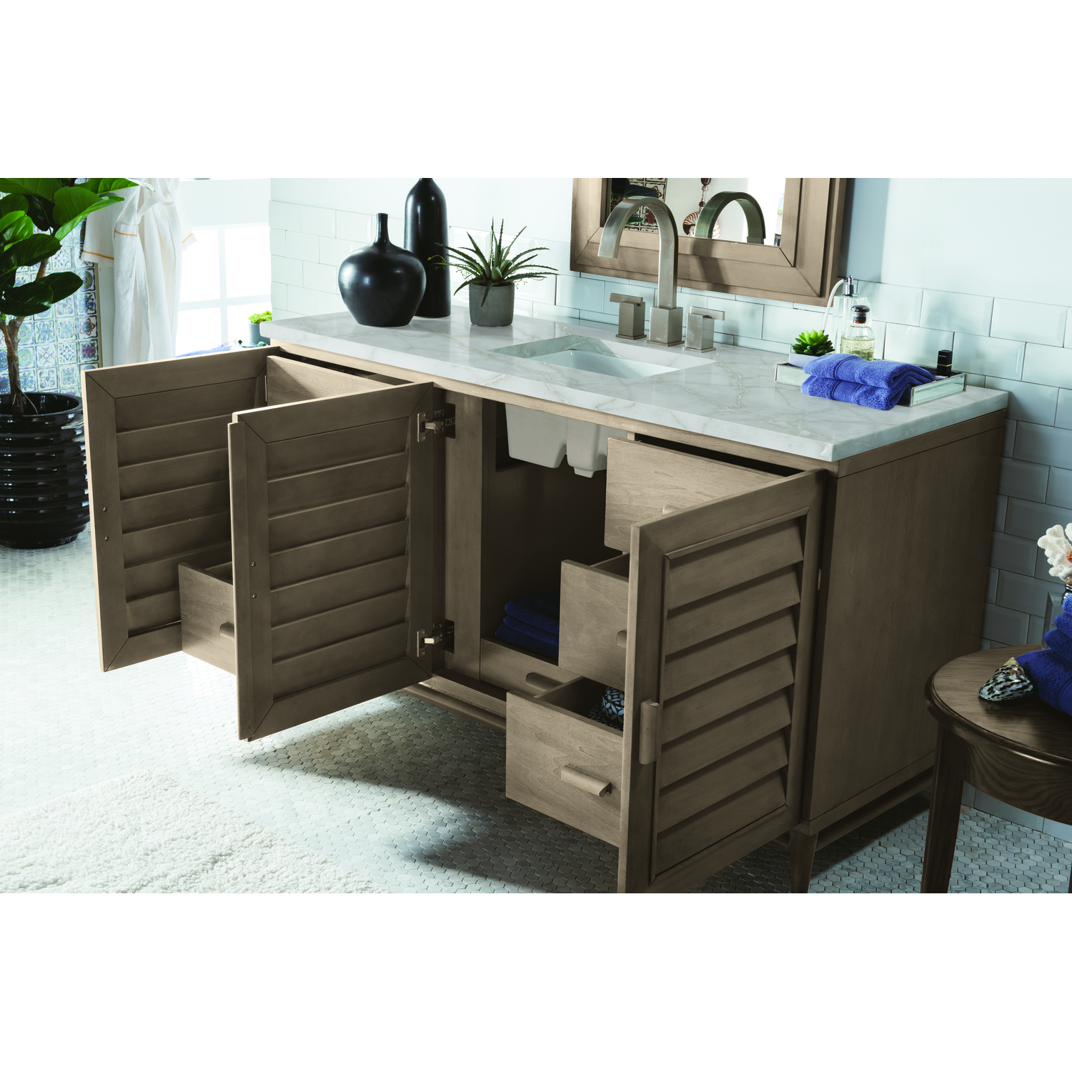 The Portland 60" Whitewashed Walnut Single Vanity features soft-close hinges on doors, with undermount soft-close slides on drawers and concealed ample storage. A proportionate and complementary design with wood knobs and brushed aluminum interior drawers. Premium features include one bamboo drawer organizer and one electrical component with two USB outlets. The finish is accented by the neutral background of the Victorian Silver Silestone top, boasting champagne metallic accents which seamlessly complement warm and cool tones in the vanity.Vanity set includes a 3cm eased edge Victorian Silver Silestone top, a white porcelain rectangular sink and mounting brackets for easy installation. Top is pre-drilled for an 8" widespread faucet. Faucet not included.Three door Whitewashed Walnut single vanity with seven interior drawersConstructed with a Soft Maple solid wood frame, Plywood panels that are covered with solid Poplar wood veneers.Drawer boxes are constructed using English Dovetail joinery, feature soft-close undermount glides and a Brushed Aluminum laminate drawer bottom.Includes one removable Bamboo drawer organizer trayIncludes a 120 UL-rated electrical component with dual power outlets and USB (Type A) portsFaucet sold separatelyCountertop is pre-drilled for one 3-hole 8" spreadThoroughly Modern. Inspired by the American design aesthetic prevalent from the mid 1930’s through the mid 1960’s; James Martin’s Portland Collection relies on pleasing proportions and simple, modern lines. The cabinets’ stylized, louver doors, conceal ample storage and, with a multitude of drawers - elements of organization. The two finish colors are James Martin’s most popular as well; Burnished Mahogany and Whitewashed Walnut. Our coordinating 28” Mirrors were designed to compliment all cabinet sizes.1 year warranty against manufacturer's defects. We will repair or replace any defective product, if the product is defective in material or workmanship at our discretion. No warranty is expressed or implied regarding damages resulting from consumer misuse.